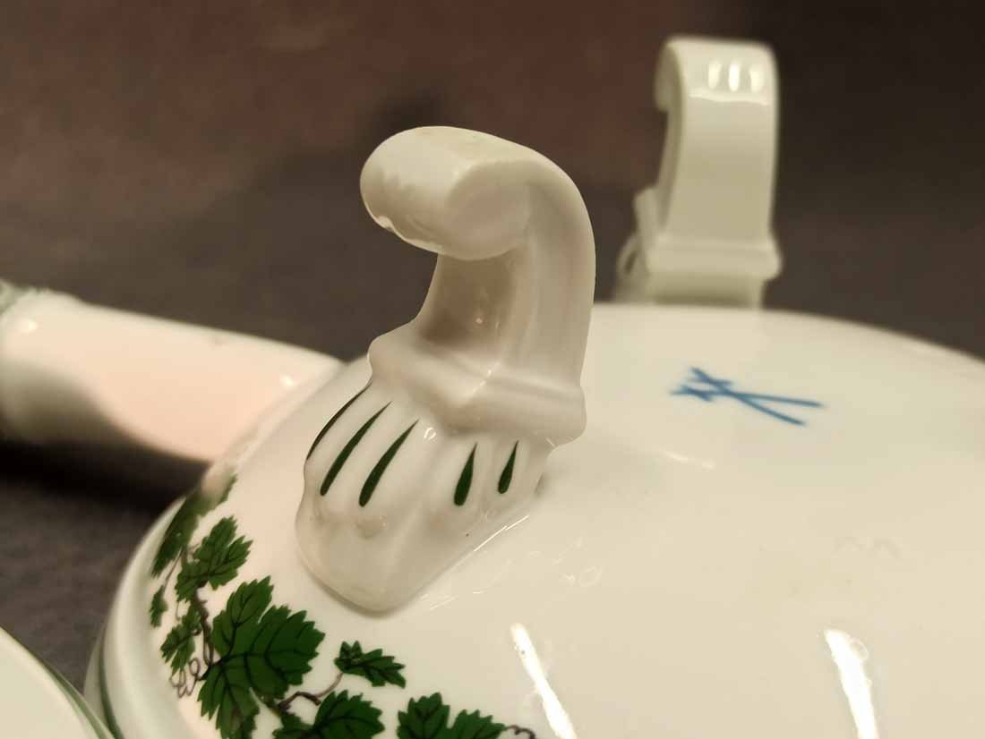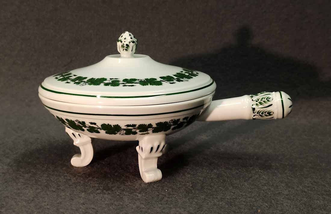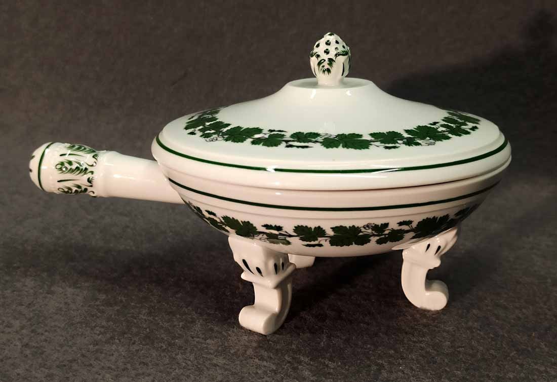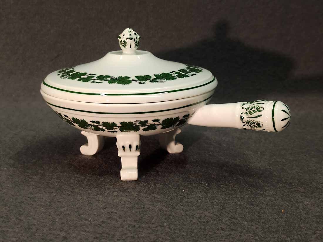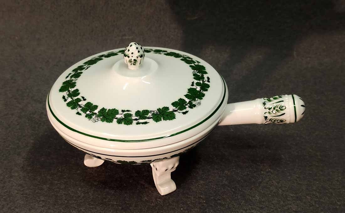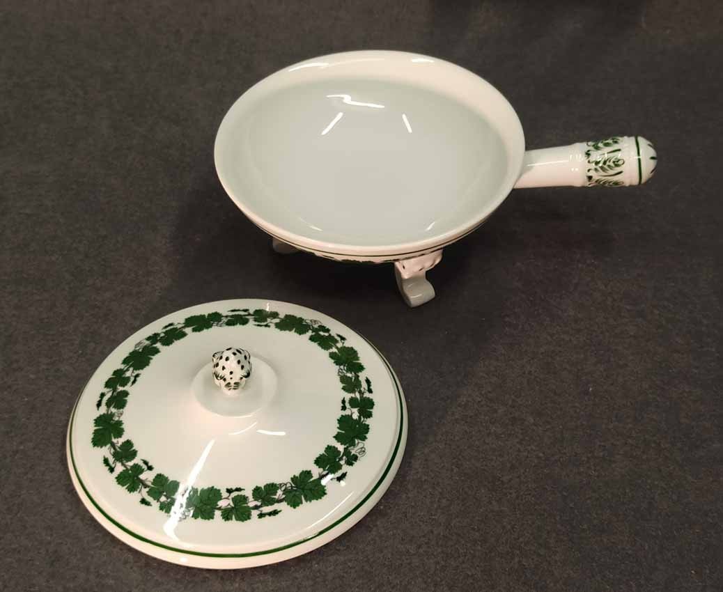 Meissen, Weinlaub; Butterpfanne mit Deckel auf drei Füßchen, kleines Pfännchen. 1. Wahl