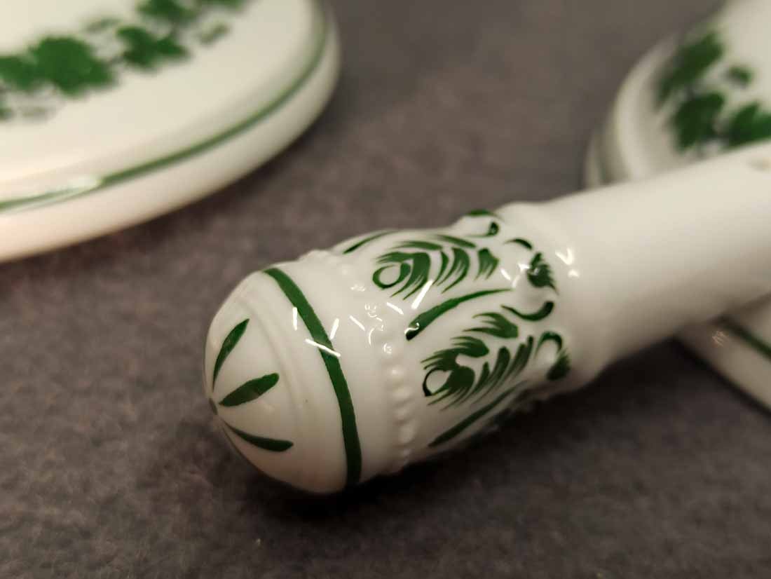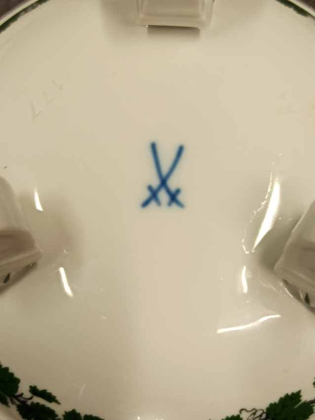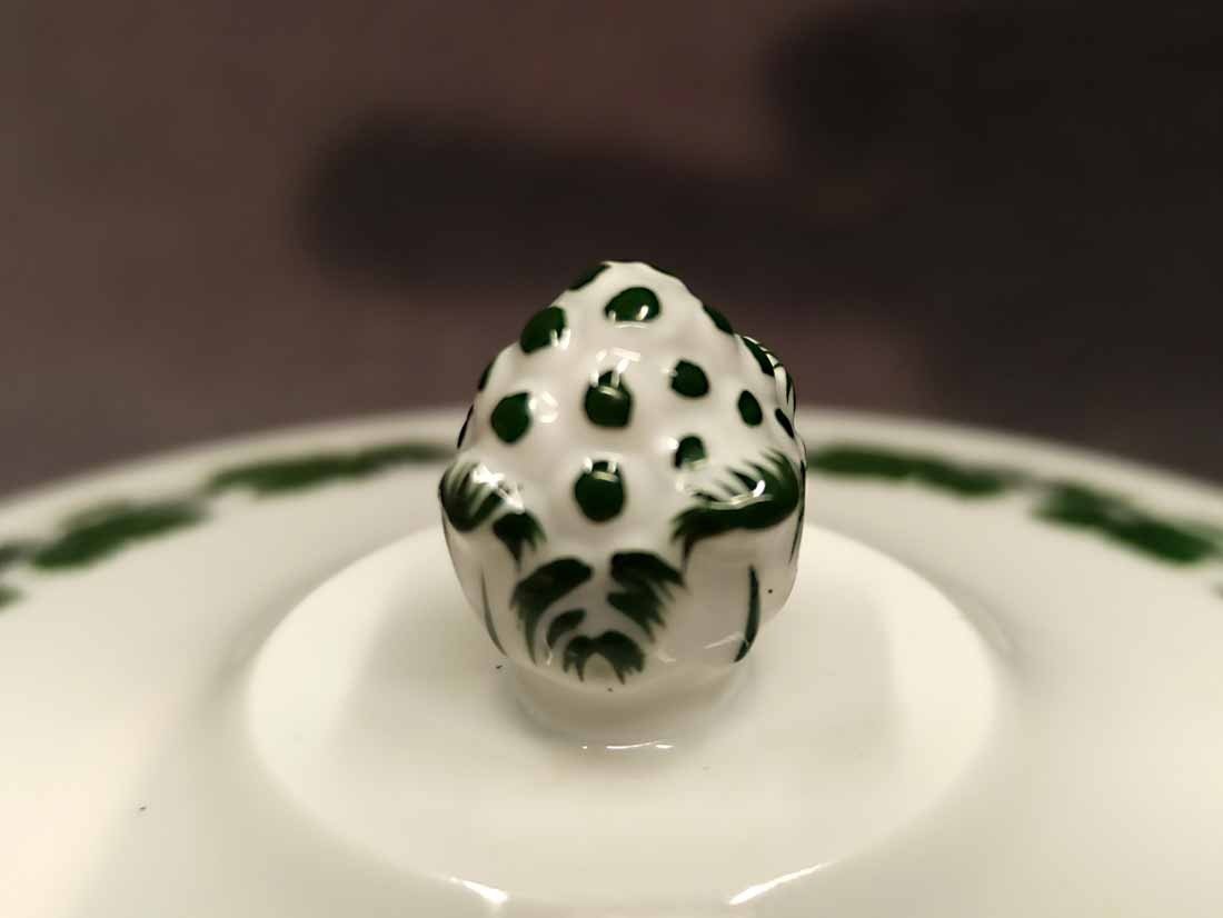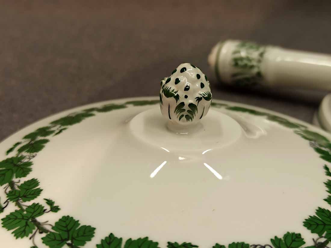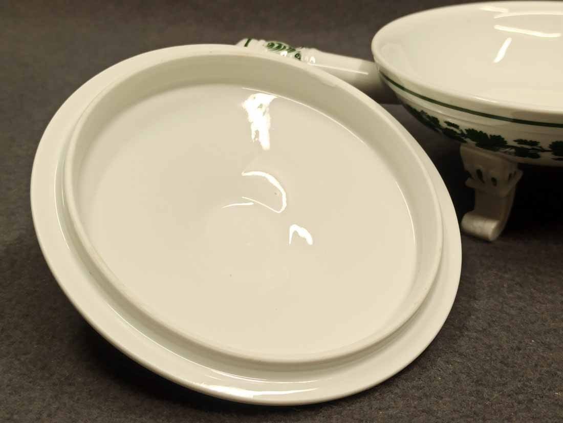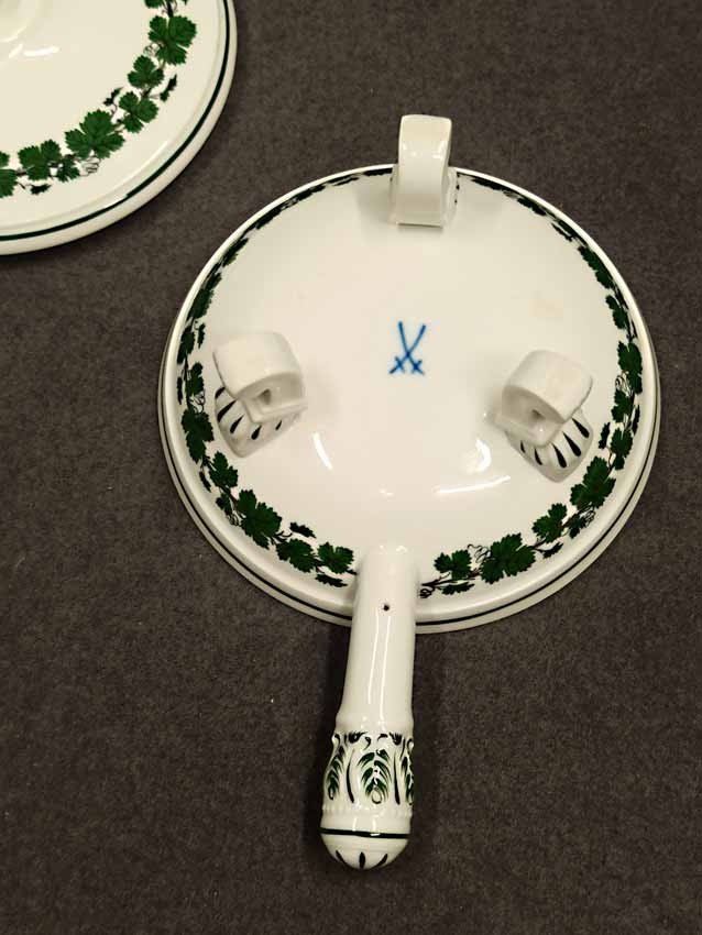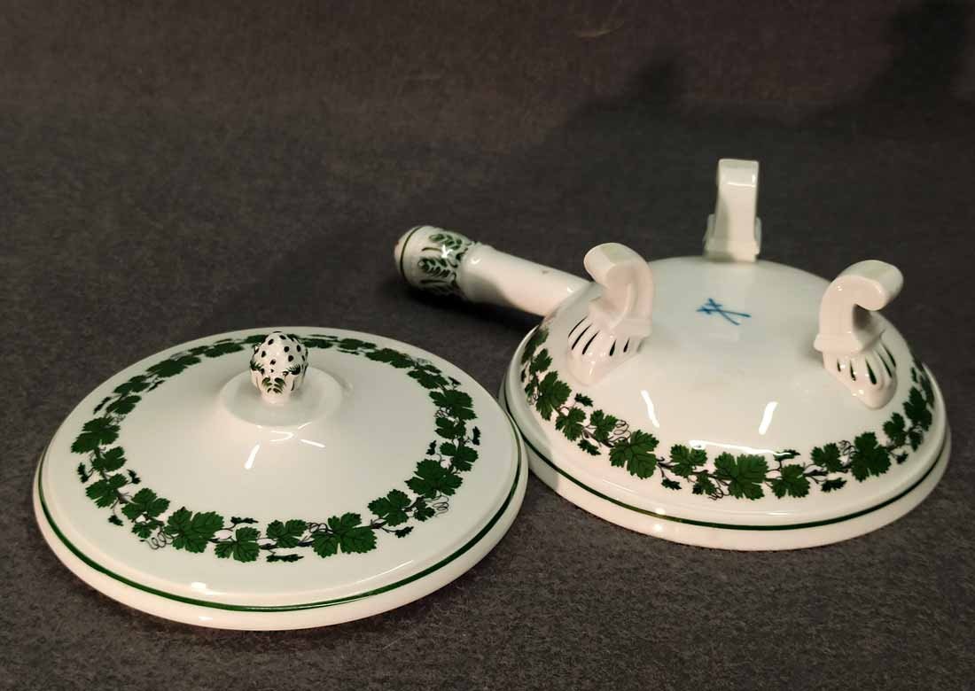 Meissen, Weinlaub; Butterpfanne mit Deckel auf drei Füßchen, kleines Pfännchen. 1. Wahl