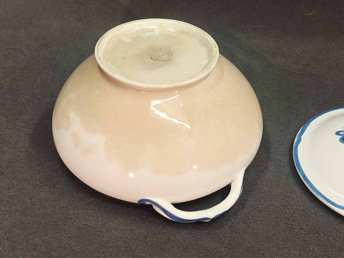 Jugendstil Terrine, Dekor "Blaue Olga" von Villeroy und Boch. Suppenterrine, L. über die Henkel 27 cm, H. gesamt ca 17 cm. Zustand ohne Beschädigungen, keine Abplatzer. Im unteren Bereich und innen Glasur vergilbt (siehe Fotos). Am Boden Marke von Villeroy und Boch, Dresden.