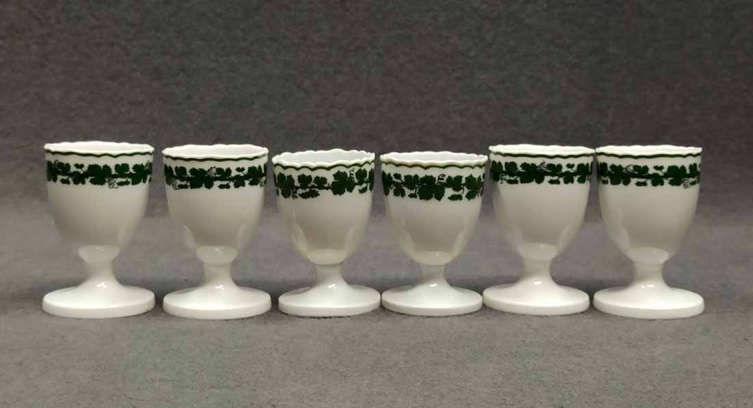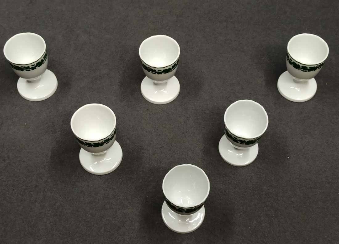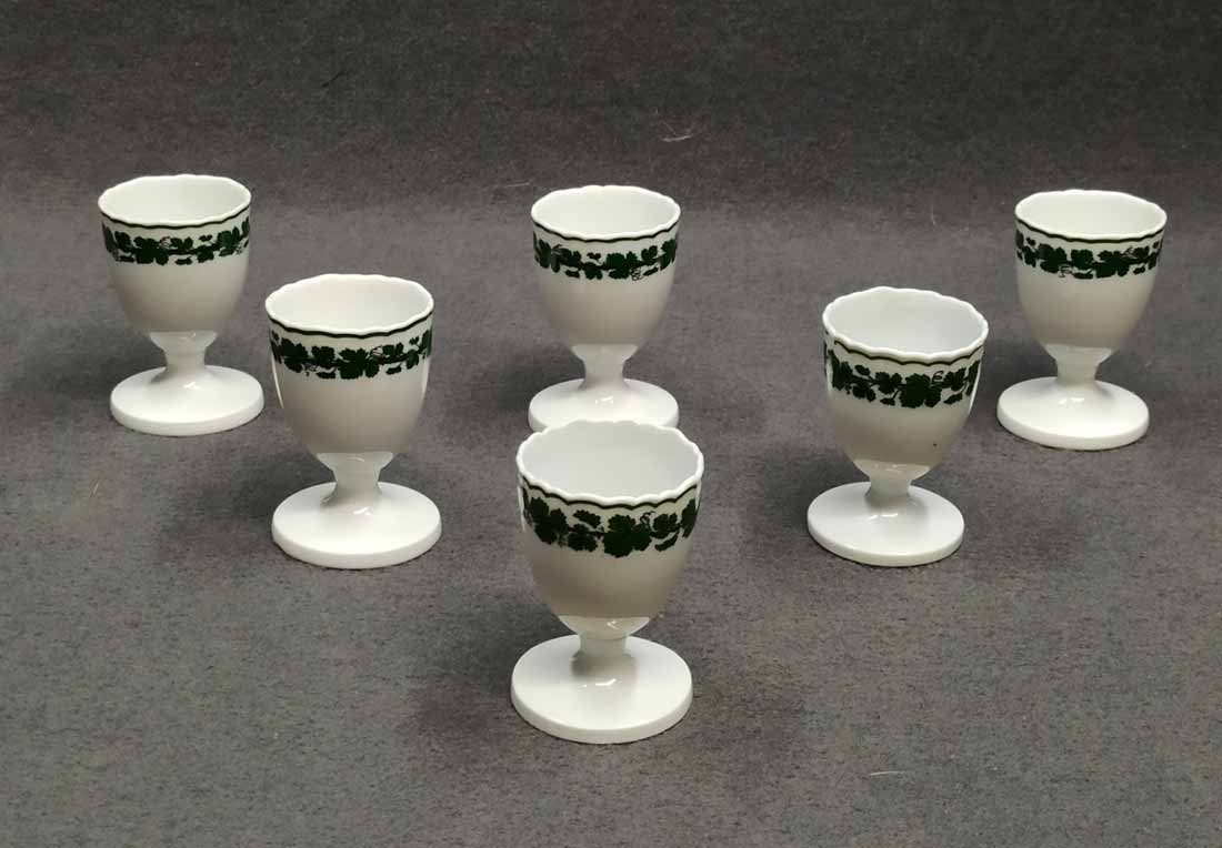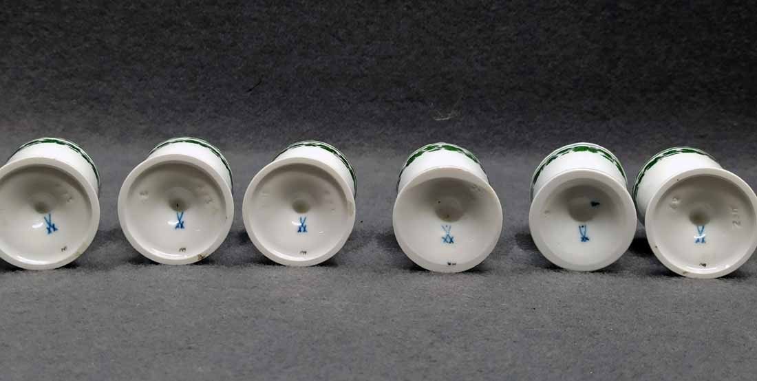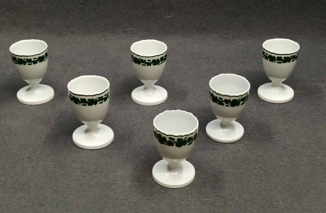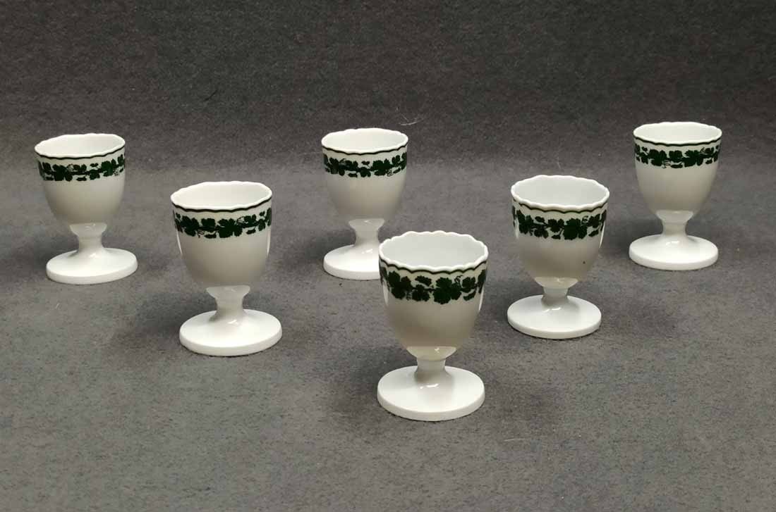 Meissen, Weinlaub, 6x Eierbecher, 1. Wahl. Sehr guter Zustand ohne Beschädigungen. H. 4x ca 7,1 cm, 2x ca 6,9 cm. Zwei Eierbecher mit Schwertermarke mit Punkt (Pfeifferzeit 1920-33), diese etwas kleiner als die anderen Vier mit Marke ohne Punkt. Alle 1. Wahl ohne Schleifstriche.