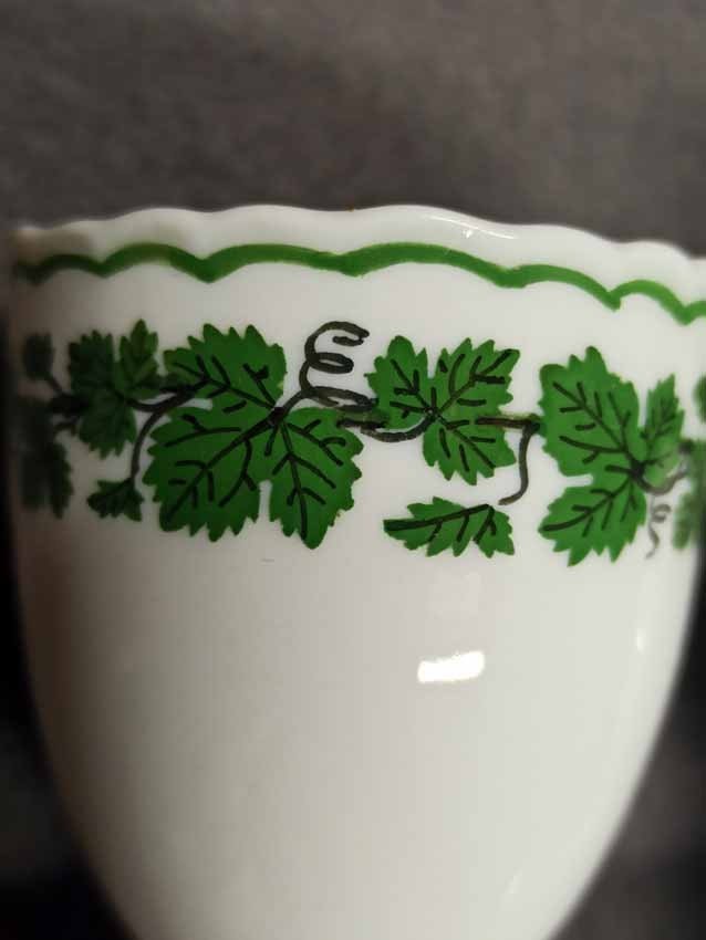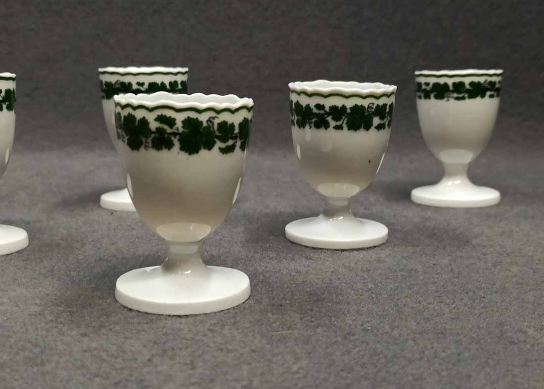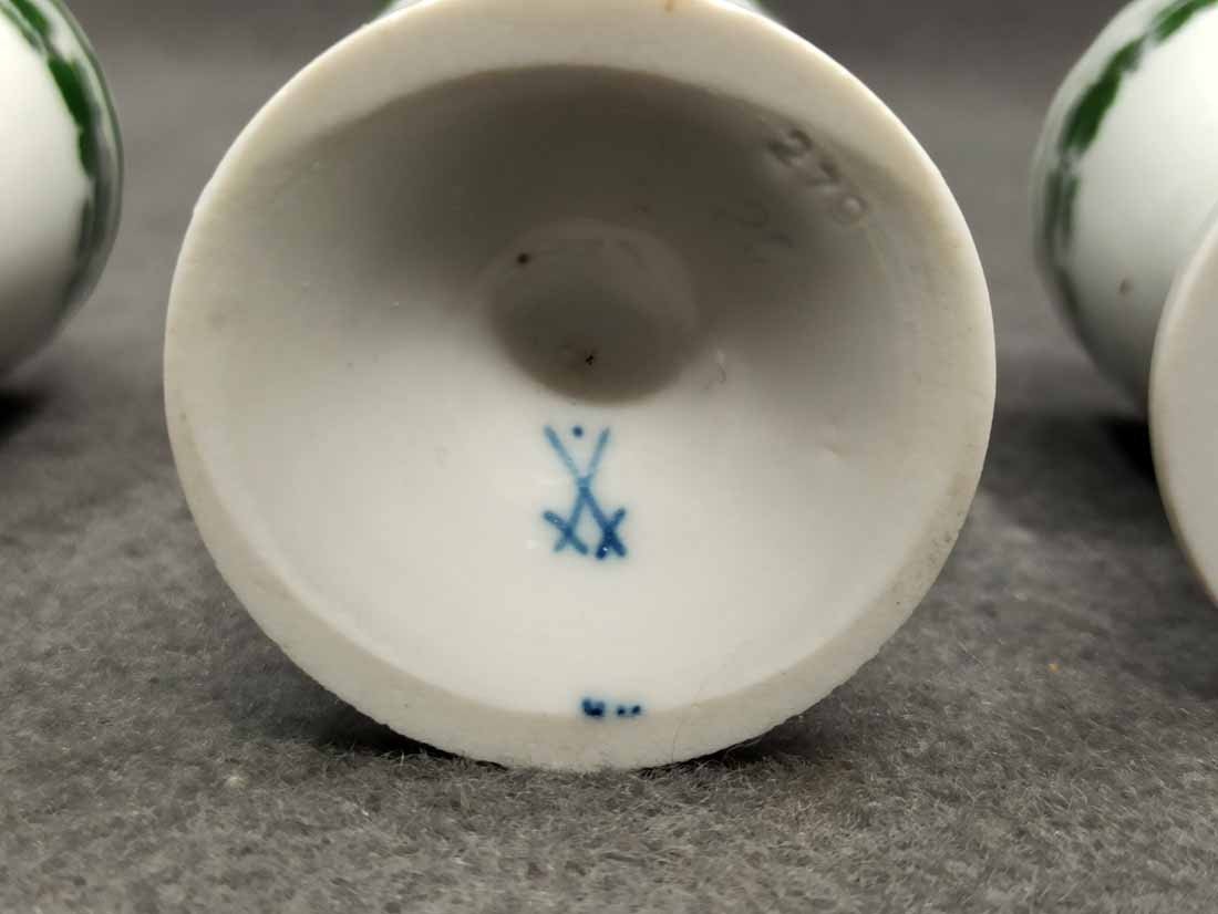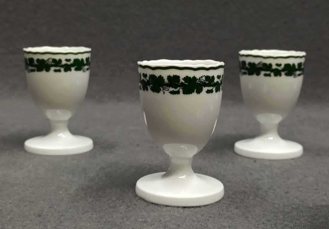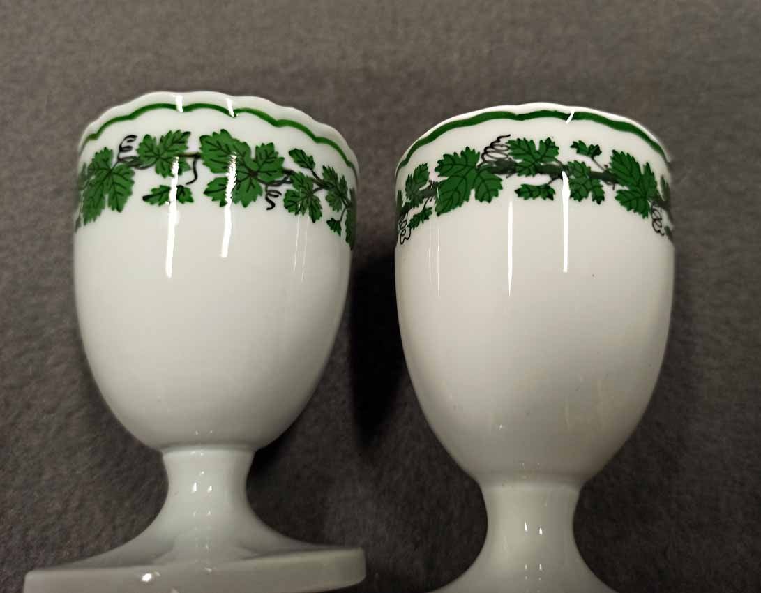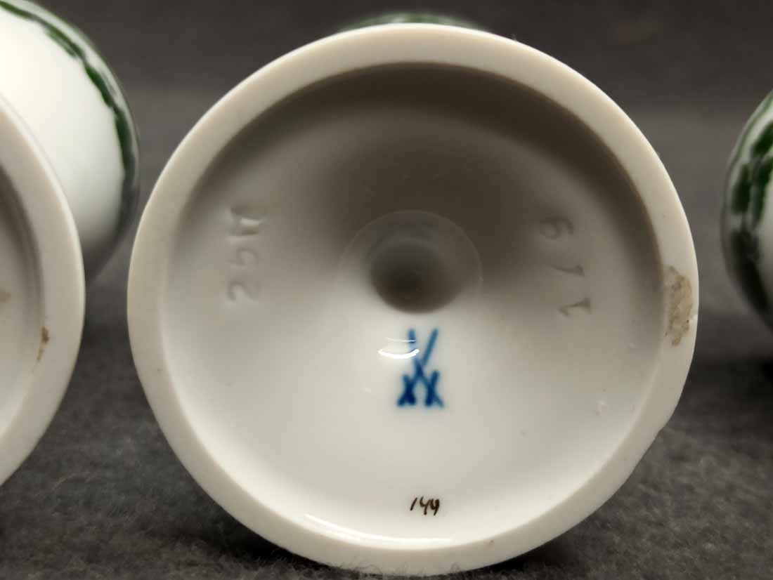 Meissen, Weinlaub, 6x Eierbecher, 1. Wahl. Sehr guter Zustand ohne Beschädigungen. H. 4x ca 7,1 cm, 2x ca 6,9 cm. Zwei Eierbecher mit Schwertermarke mit Punkt (Pfeifferzeit 1920-33), diese etwas kleiner als die anderen Vier mit Marke ohne Punkt. Alle 1. Wahl ohne Schleifstriche.