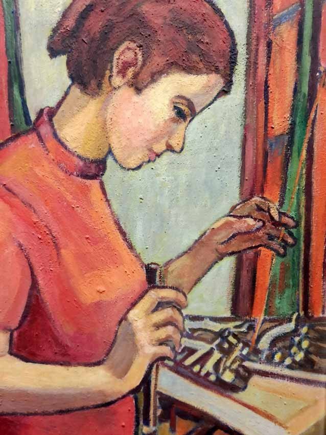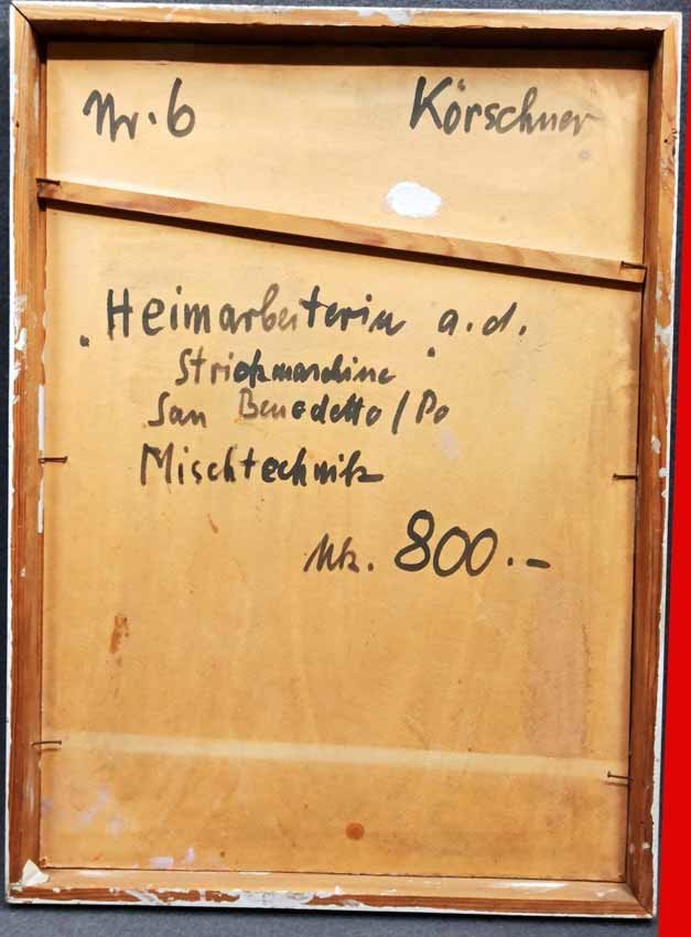 Lena Körschner,  "Heimarbeiterin a.d. Strickmaschine" in St. Benadetto/Po, Italien. Öl/Mischtechnik auf Holz, B. x H. 35/43 cm  x 49/53 cm. Ein Werk aus Teilnachlass der Künstlerin welcher mir vorliegt. Weitere Werke der Künstlerin aus den 30er bis 60er Jahren sind vorhanden.