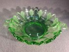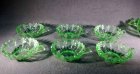 Satz von 7 Schalen um 1925. Grün- Glas, Schalen in Form stilisierter Blüten in zeittypischer Gestaltung. Je mit Handhaben.