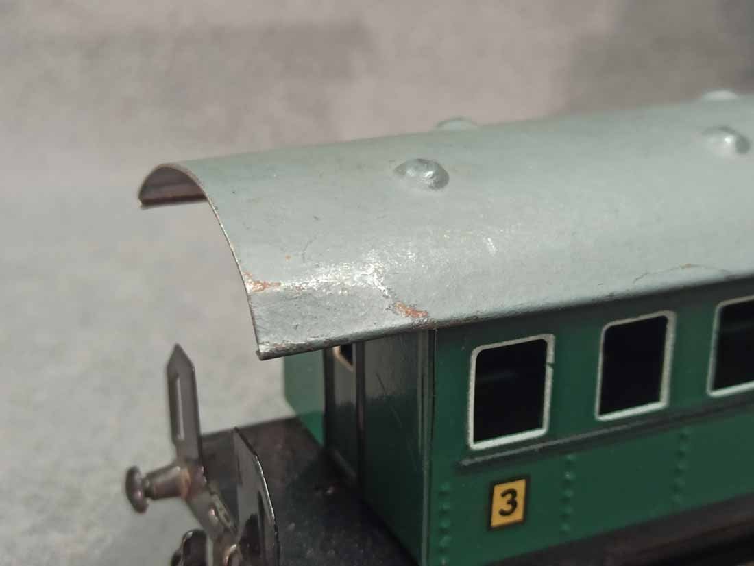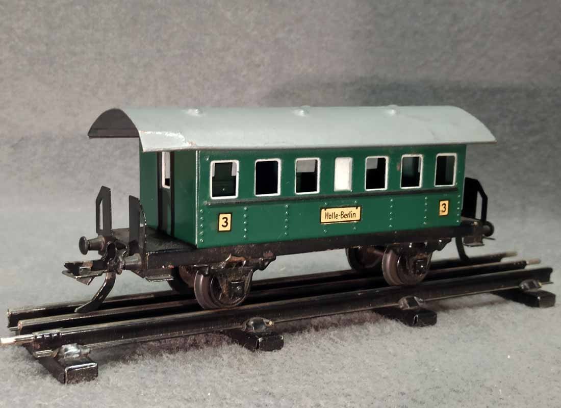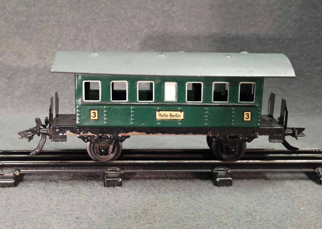 Zeuke, Personenwagen Halle-Berlin, Spur 0, Blech. L. ca 20 cm. Guter Zustand, bespielt mit kleinen Mängeln, siehe Fotos. Eine Kupplung mit Reparatur (Foto).