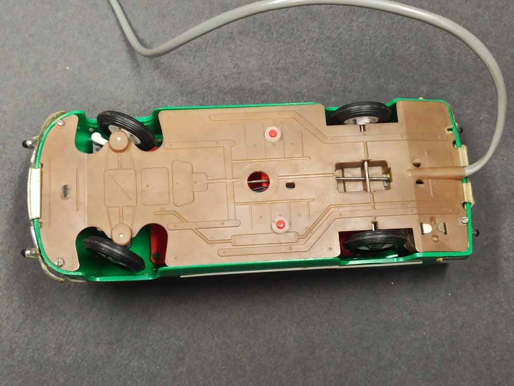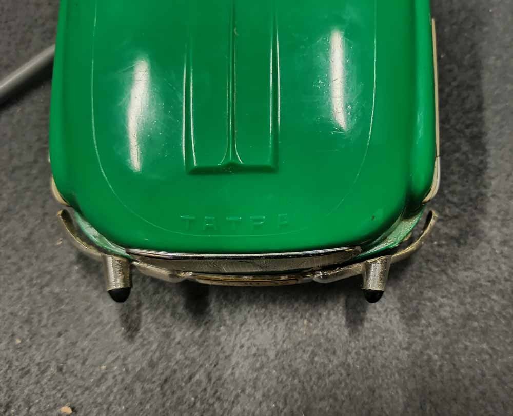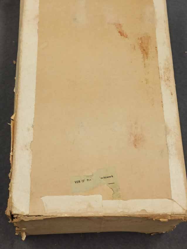 Ferngesteuerter Tatra in Original Verpackung. DDR Spielzeug vermutl. PRESU (Press- und Spritzwerk Suhl). Guter Zustand bespielt mit normalen Gebrauchsspuren, kleine Kratzer, leichte Verfärbung etc. Kleiner Ausbruch am Gehäuse der Fernbedienung, Stoßstange seitl. etwas gelöst. Fahrfunktion Vor+Zurück funktioniert, Lenkung prinzipiell i.O. geht schwer, Beleuchtung dz. ohne Funktion. Verpackung mit Nutzungsmängeln.
