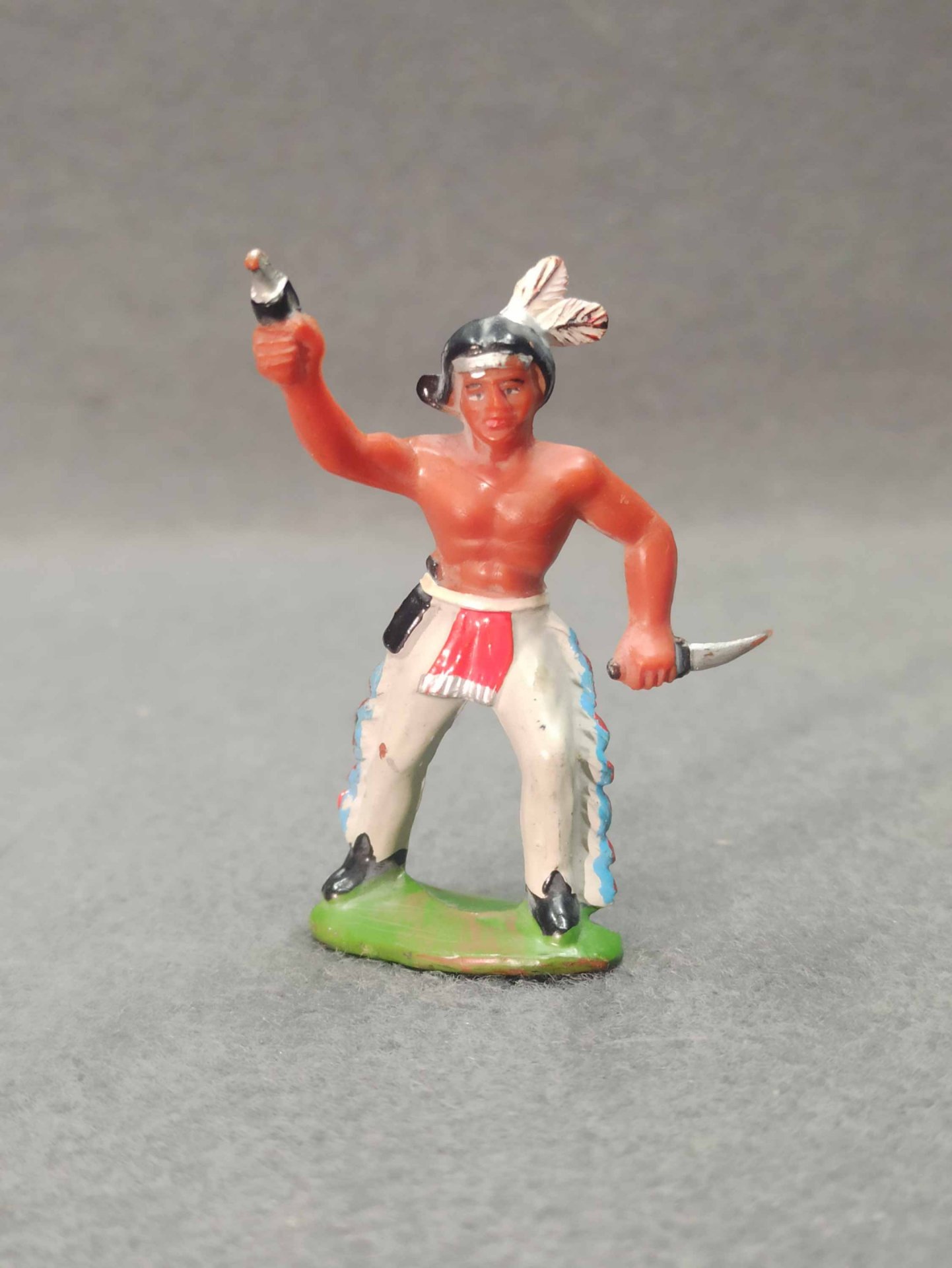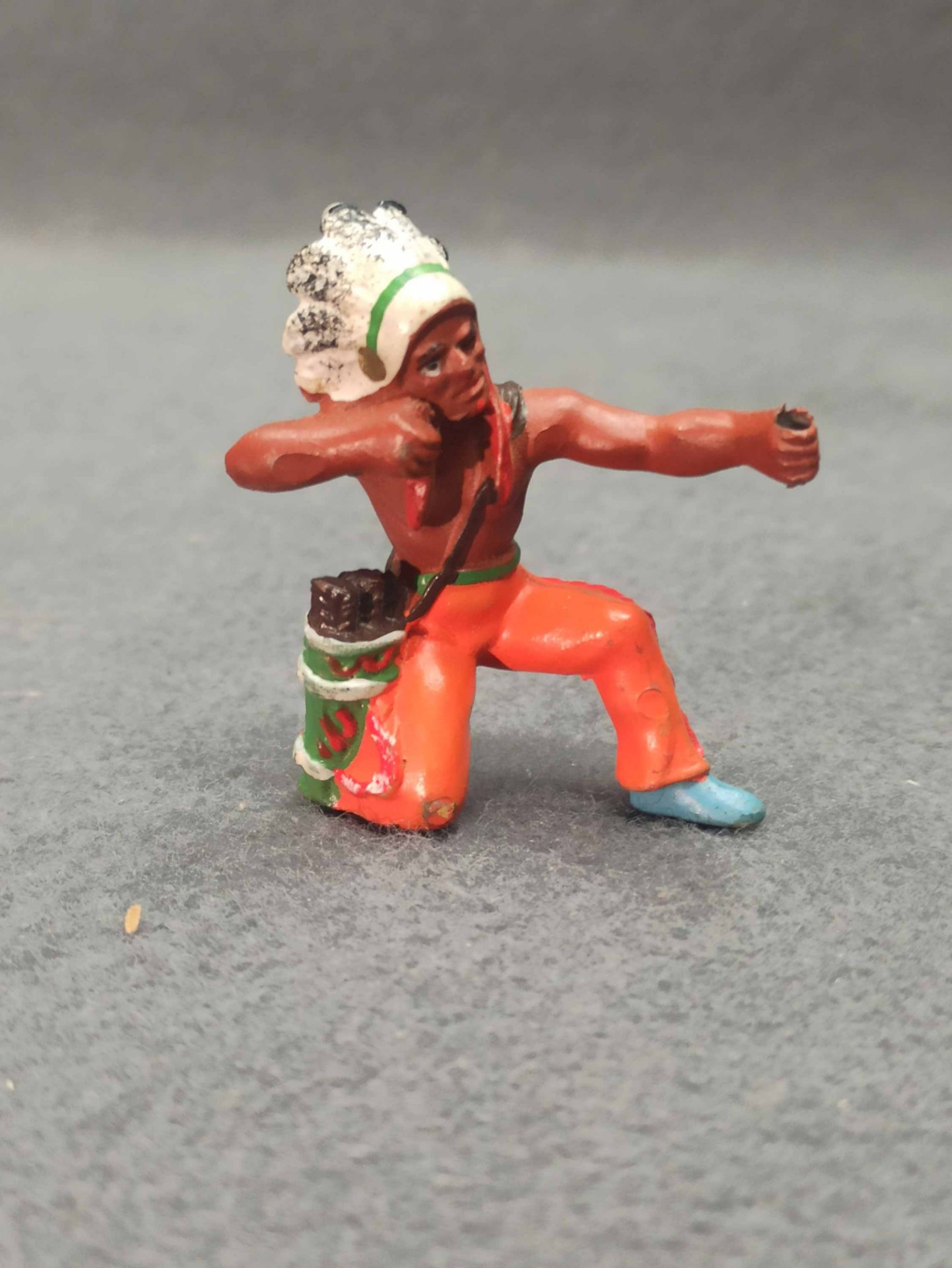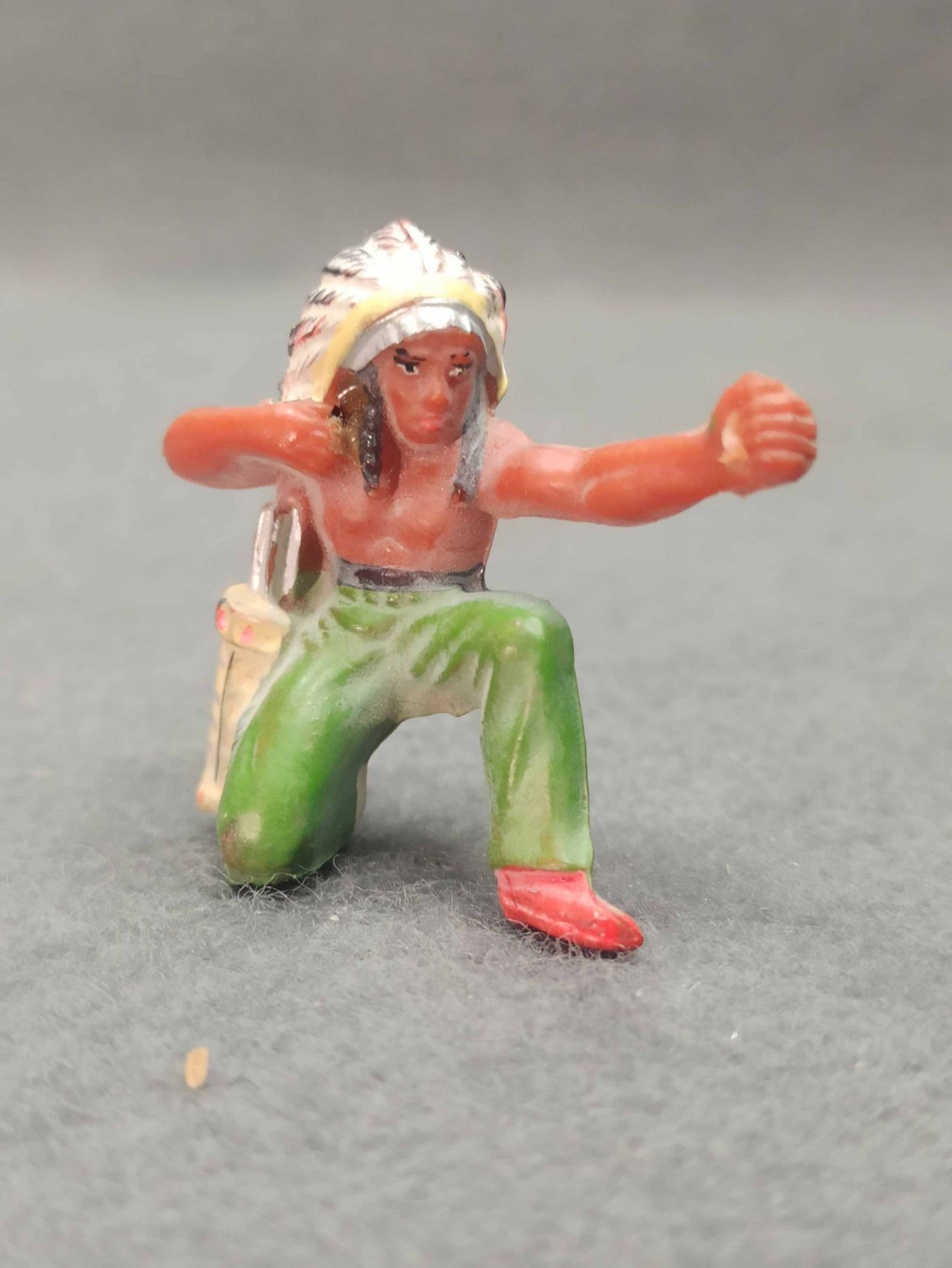 Indianer aus Kunststoff, original DDR. Es ist nicht gebrochen o.ä. (!einmal ohne Federschmuck). Zum weiteren Zustand bitte die Fotos ansehen. H. ca 7 - 8 cm