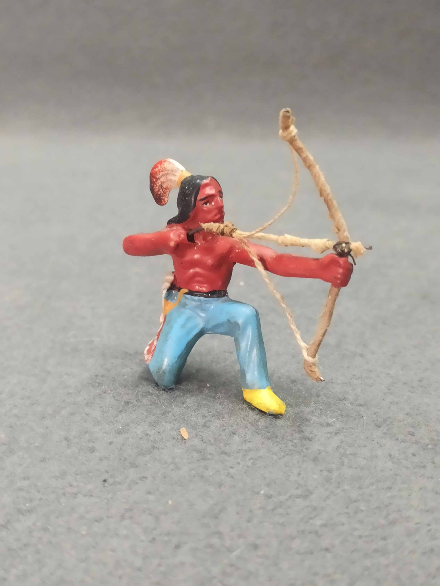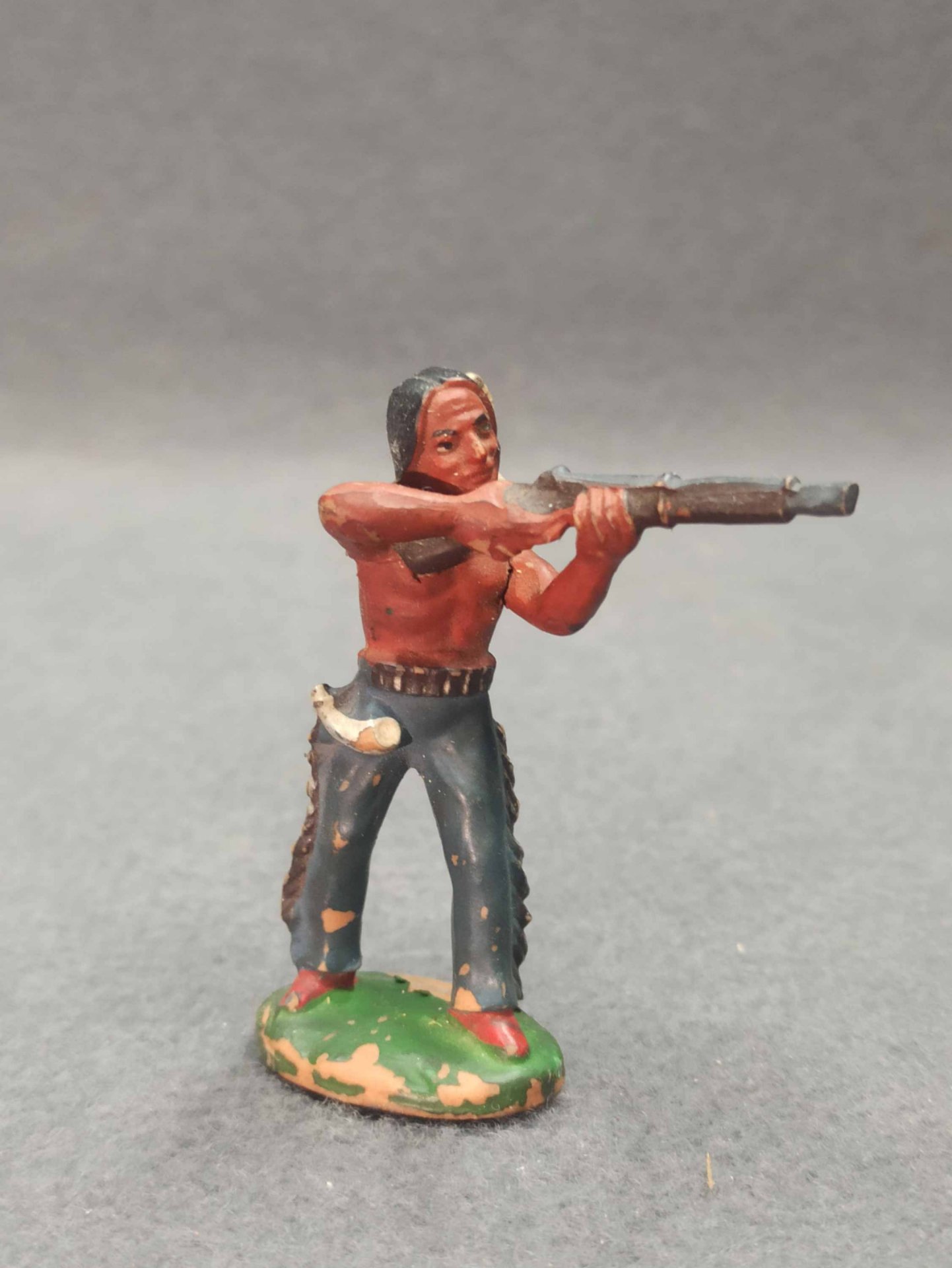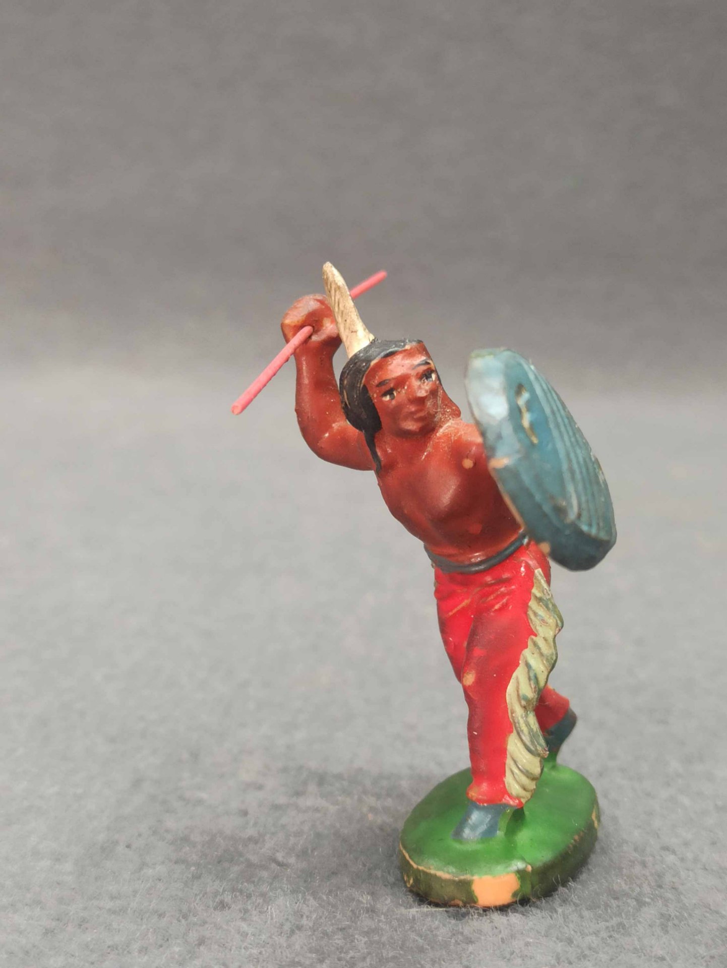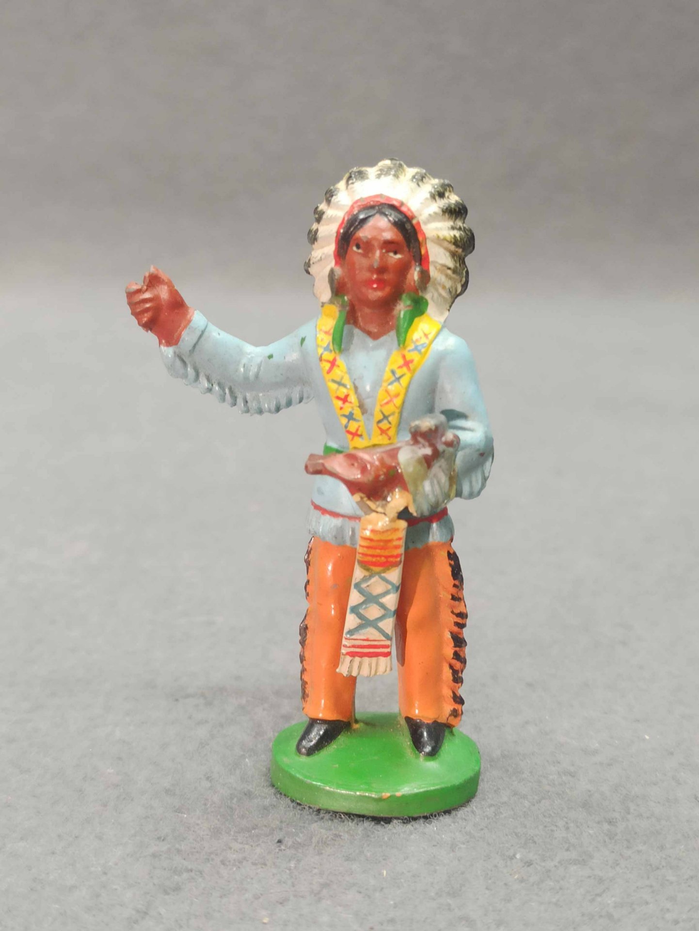 Indianer aus Kunststoff, original DDR. Es ist nicht gebrochen o.ä. (!einmal ohne Federschmuck). Zum weiteren Zustand bitte die Fotos ansehen. H. ca 7 - 8 cm