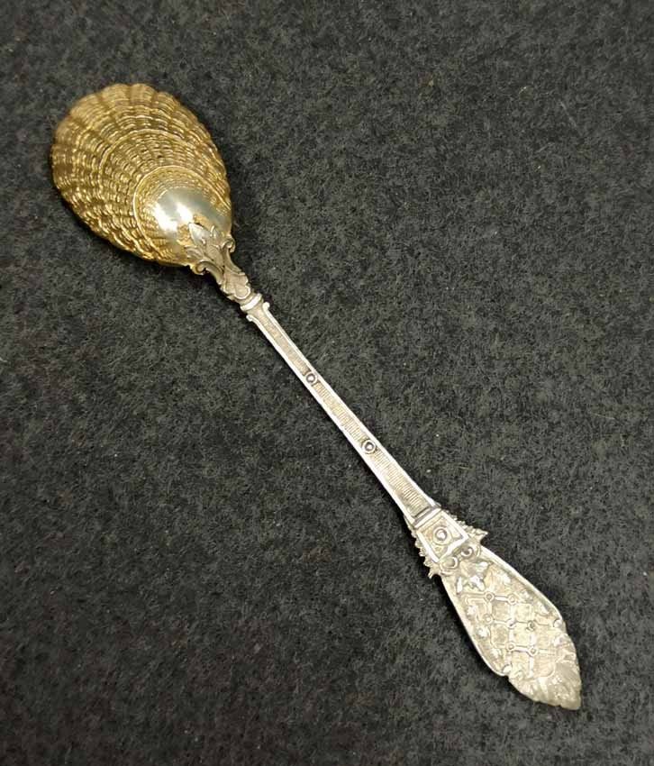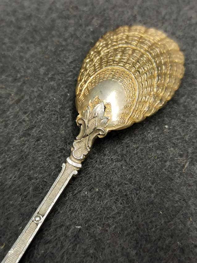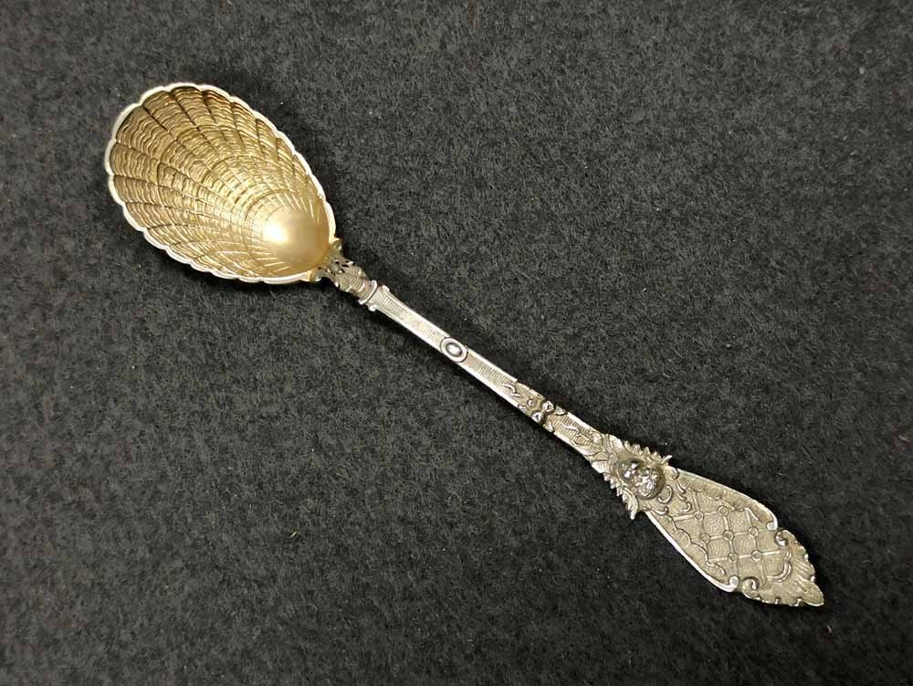 12x Silberlöffel Silber 800 um 1880, Historismus, aufwändig; Laffe als stilisierte Muschel, Griffe mit Maskaron. Laffe vergoldet. Fein ziseliert und zeittypisch gestaltet, Im original Etui. Sehr guter Zustand. L. 11,5 cm, Ges. Gew. ca 145 g. Jeweils gestempelt: "Mond, Krone und 800".