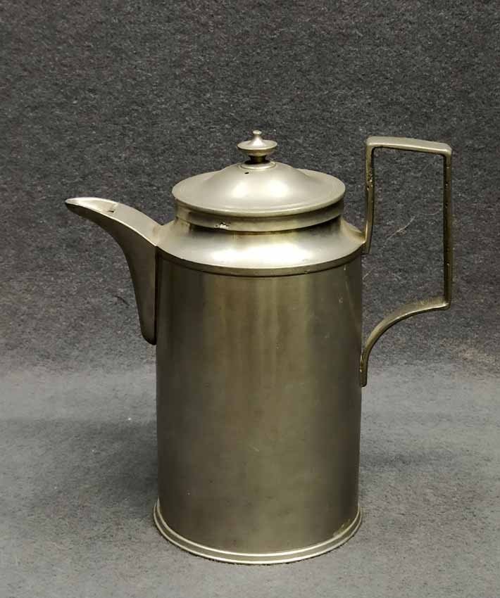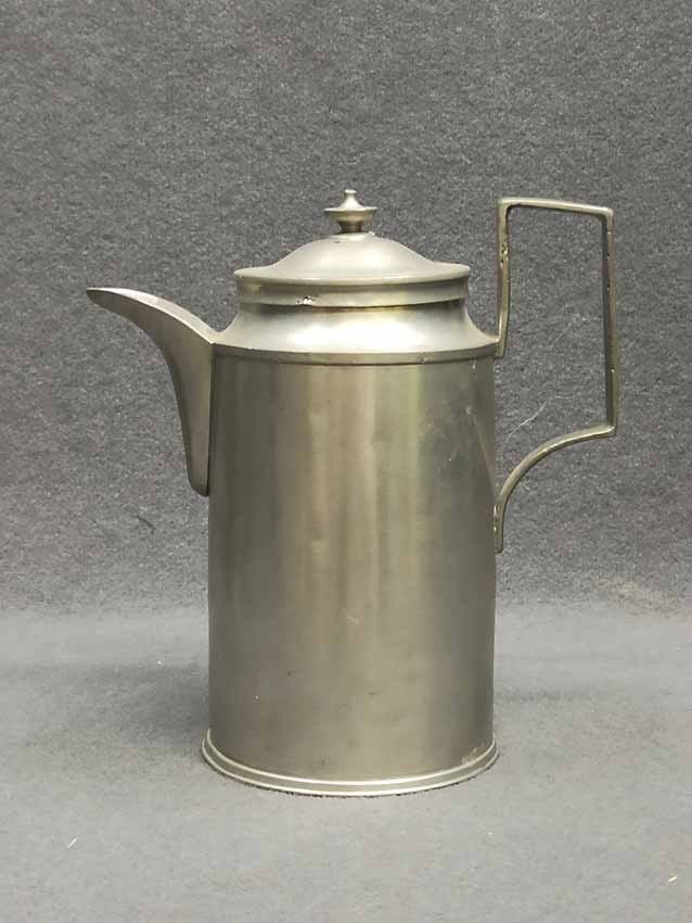 Zinnkanne, Biedermeier 1823. Zylindrische Form mit eckigem Henkel. Fronseitig Monogr. "C C S" und dat. 1823. Im Boden Zinnpunzen Sachsen etc. H. 20 cm.