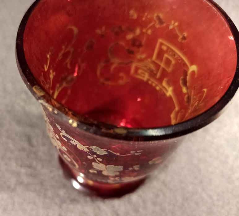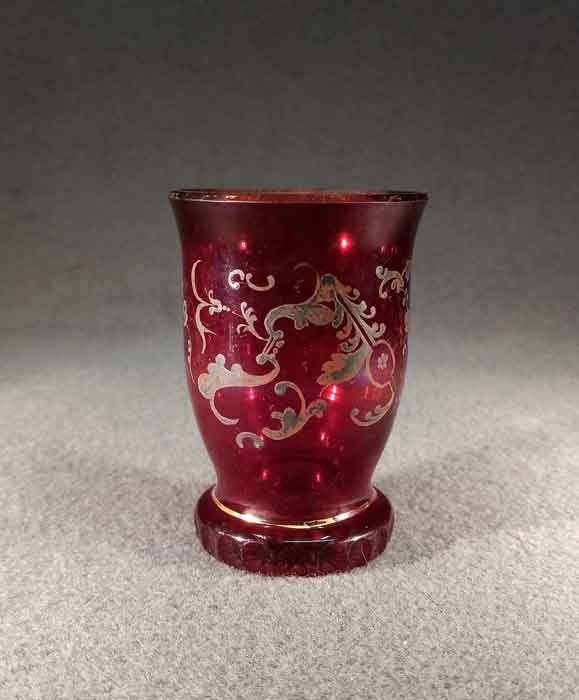 Fußbbecher um 1850. Farbloses Glas mit Rotätze und Emaillemalerei, Goldränder. Wohl Böhmen.