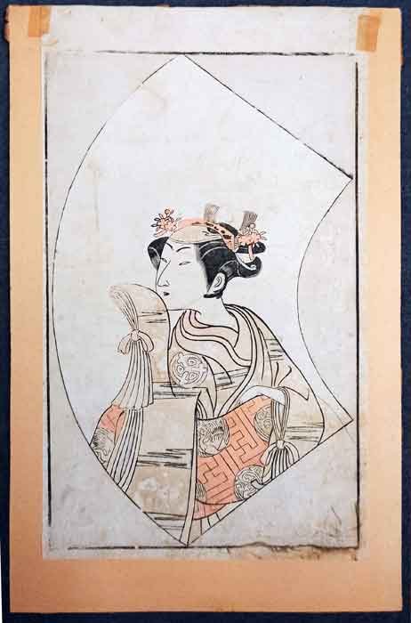 Shunsho Katsukawa 1726-1792, Farbholzschnitt M./E. 18. Jh.  Portrait eines Schauspielers des Kabuki Theaters im Fächerdruck. Verm. aus Ehon Butai Ōgi - Bilderbuch der Kabuki Schauspieler bzw. Illustriertes Buch der Bühnenfächer ab 1770.