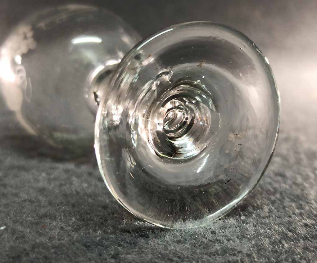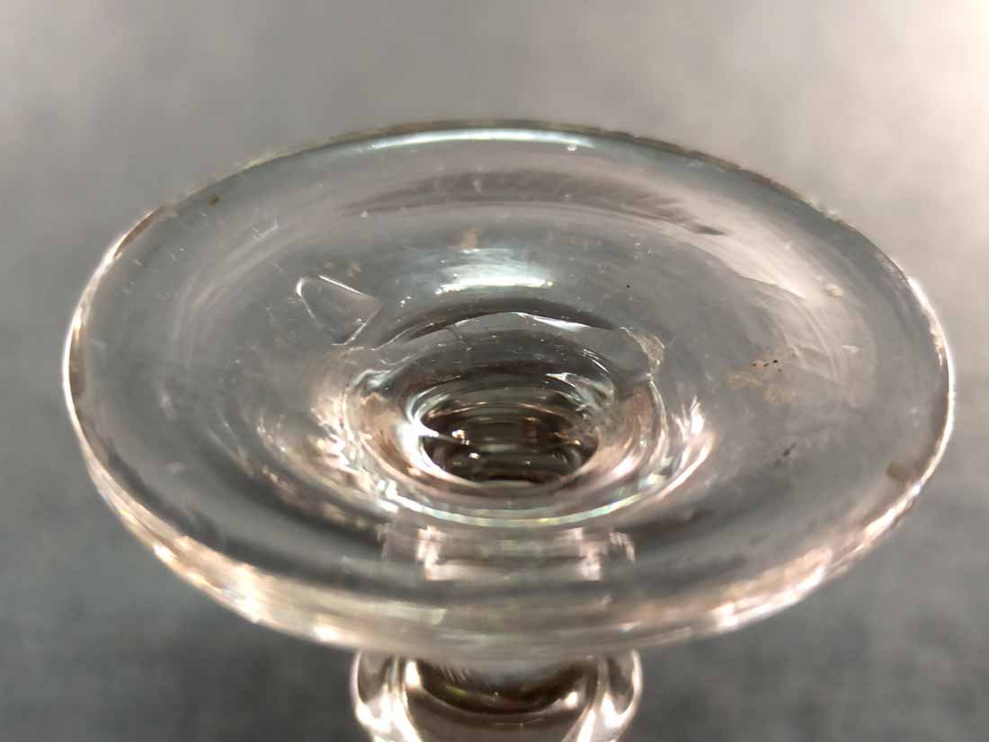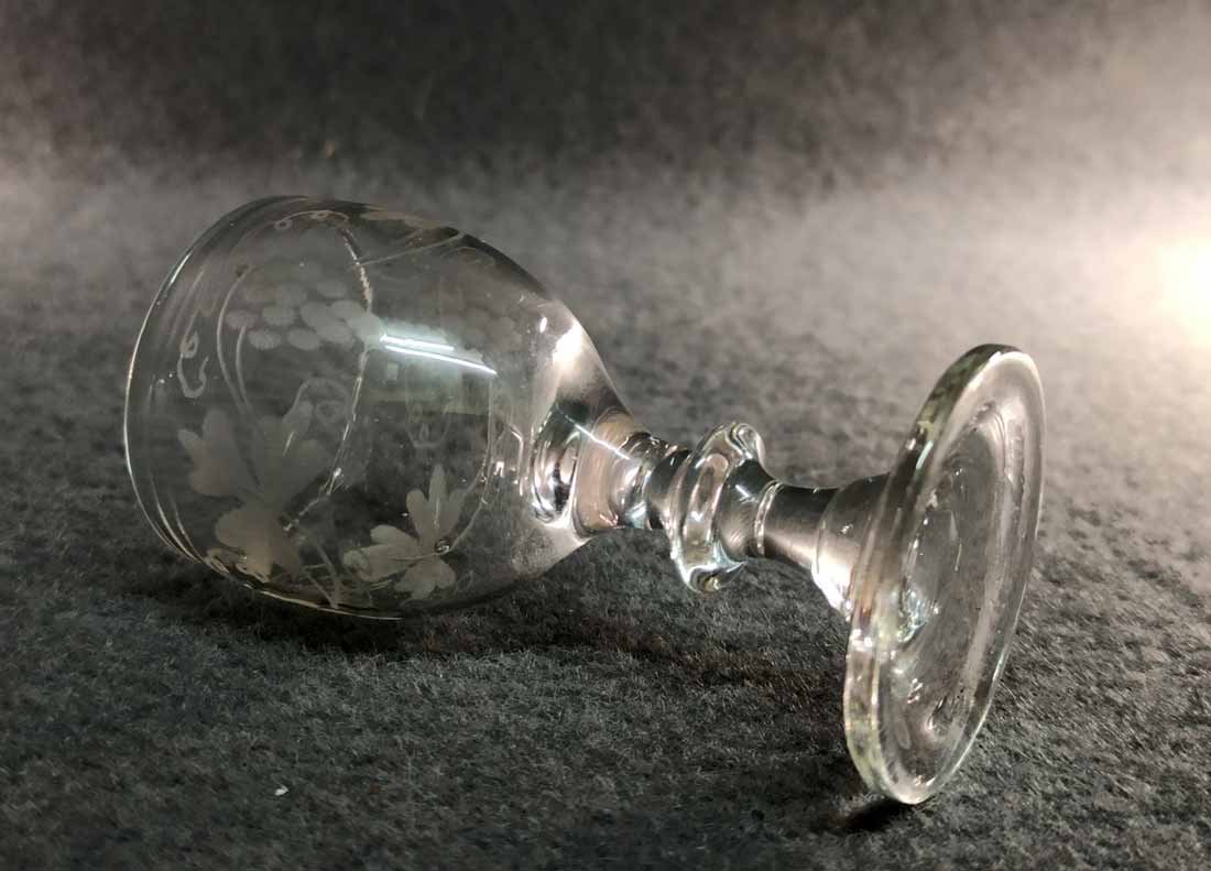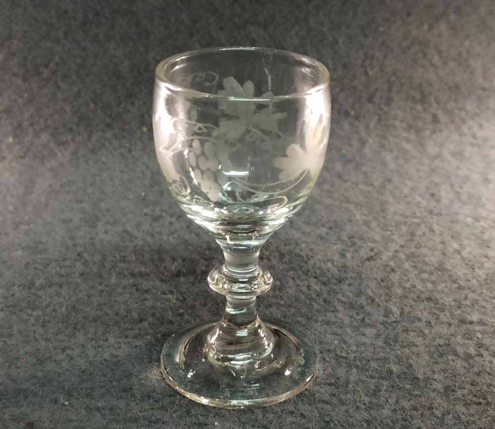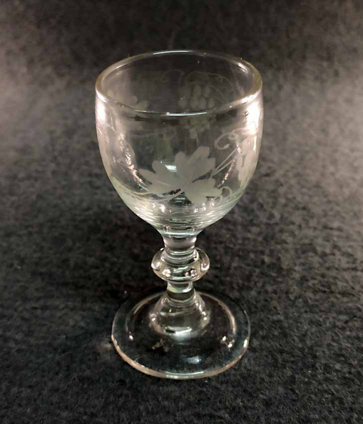 Schnapsglas, Biedermeier Abrissglas 2.Vietel 19. Jh. Graviert mit Weinlaub und Trauben. Sehr gute Erhaltung ohne Beschädigungen. H. 8,5 cm, D. 4,3 cm.
