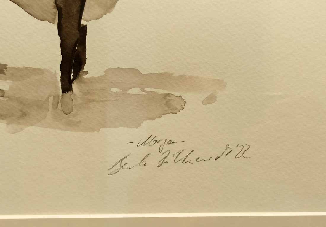 Beate Bilkenroth, "Morgen" - Drei Kühe 2022, Tuschezeichnung. Re.u. bez.: "Morgens" und sig.: "Bilkenrroth 22". Gerahmt im Passepartout. H.xB. 29/55 cm x 44/75 cm