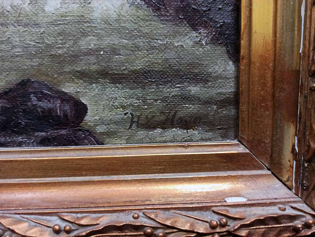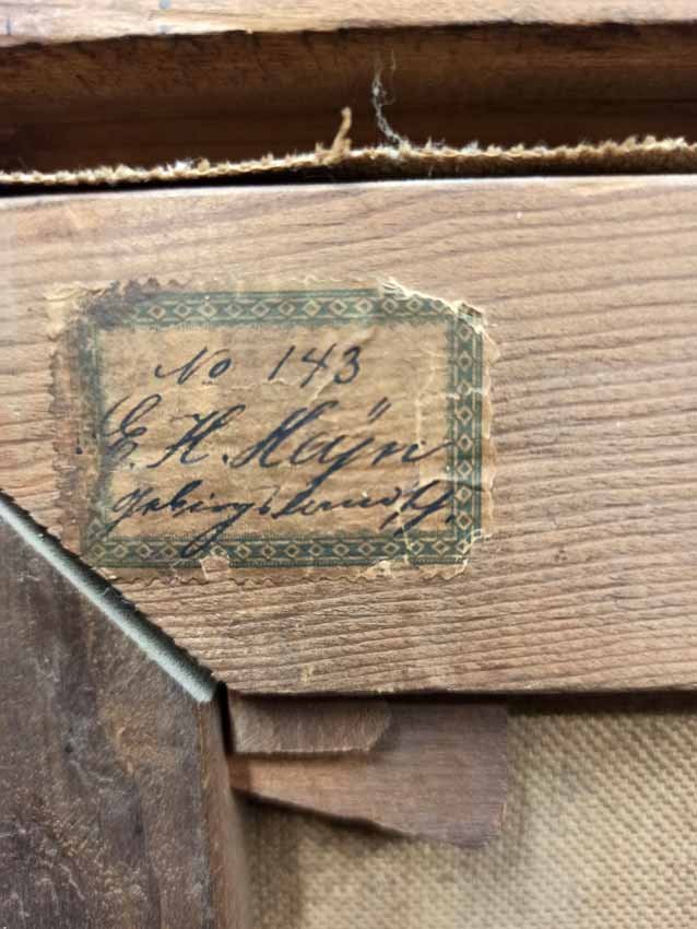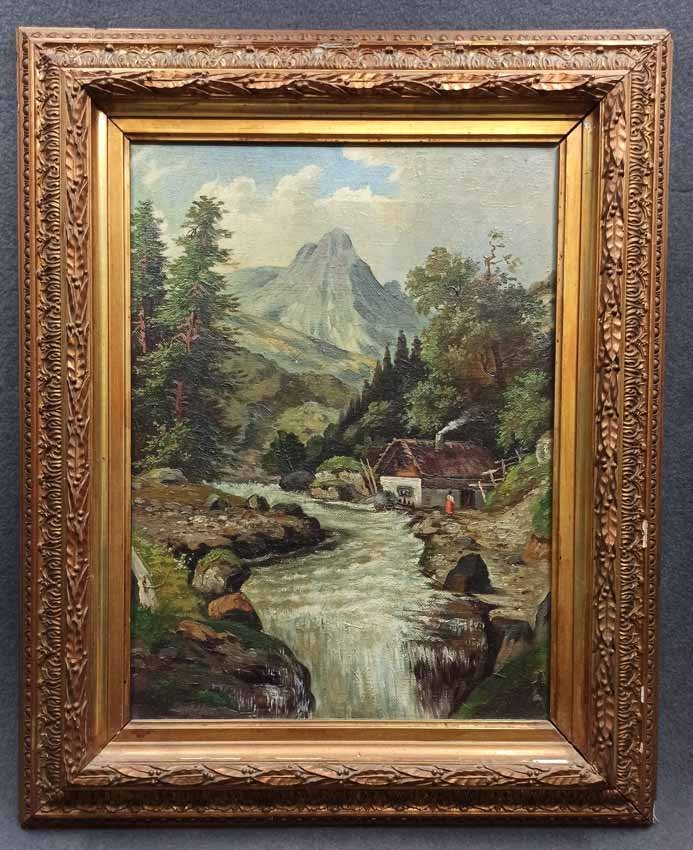 Heyn, Heinrich Eduard, 1856 - 1932. Gebirgslandschaften, Öl a. Lwd. a. Keilrahmen, 2.Hälfte 19.Jh. Links unten undeutlich sign. "H.E. Heyn".  H.xB.  63/45 cm  x  50/32 cm. Rs. alter Klebezettel Bez.: " No. 143 / E.H.Heyn / Gebirgslandschaft"  In zeittypischem original Rahmen, dieser mit kleineren Beschädigungen und Nutzungsspuren.