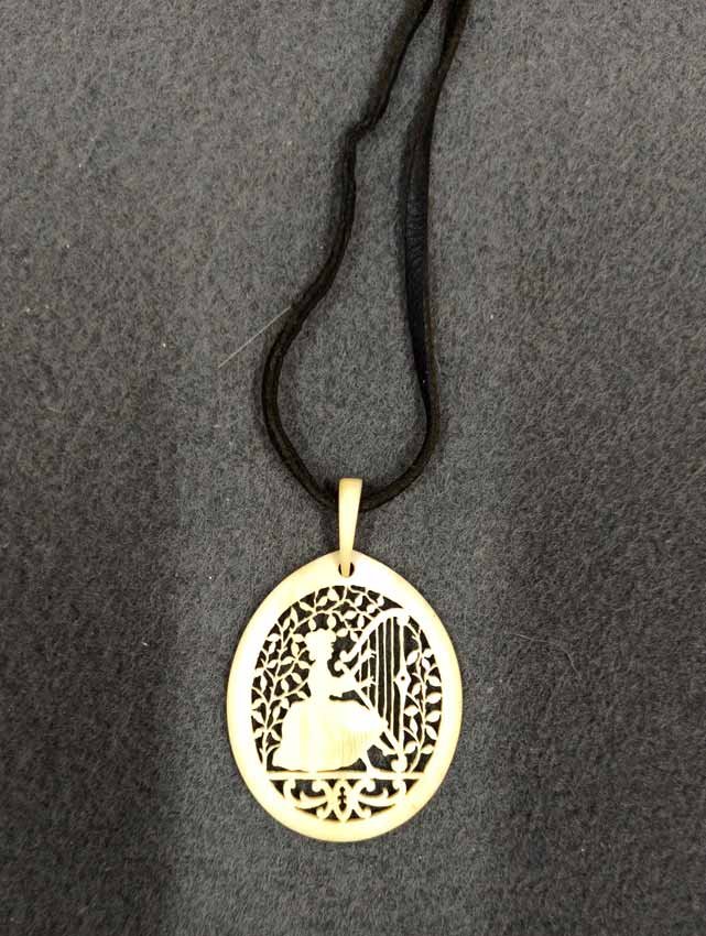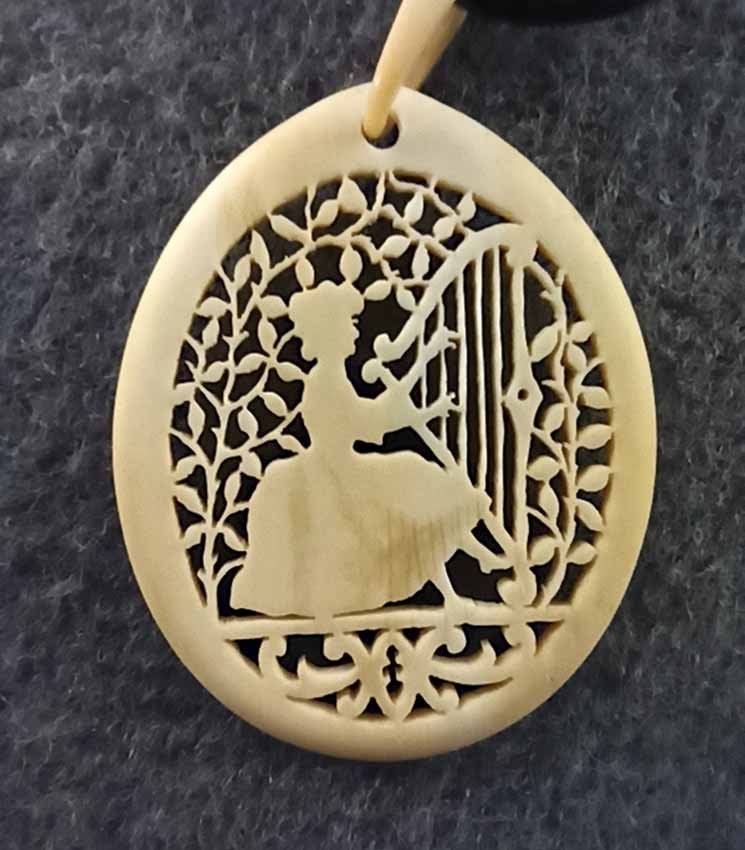 Anhänger, Bein/Elfenbein, sehr filigran geschnitzter Anhänger mit Darstellung einer Harfenspielerin umgeben von Ranken.  5 cm x 4 cm.