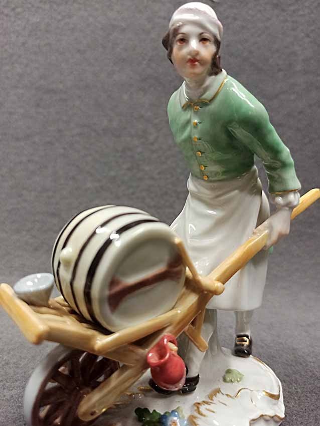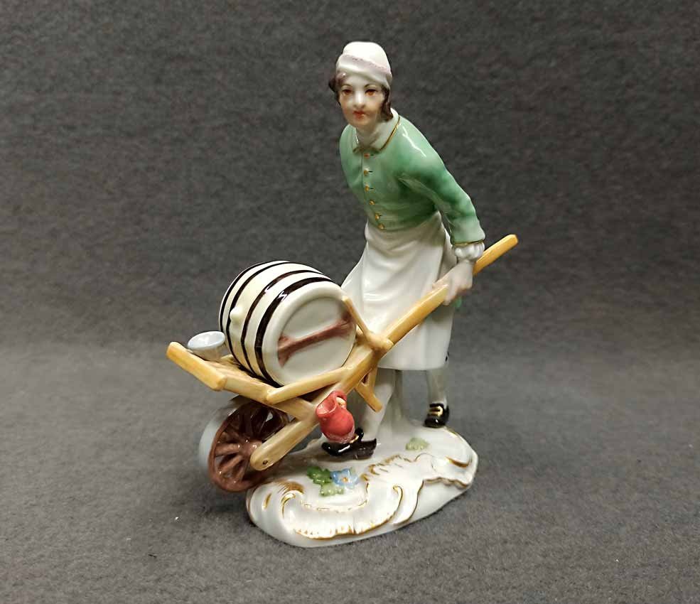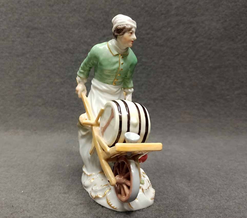 Meissen Figur aus der Serie Pariser Ausrufer, hier: Essighändler. Entwurf von Johann Joachim Kaendler. Unterglasurblaue Schwertmarke von Meissen 1. Wahl ohne Schleifstriche. Tadelloser Zustand ohne Beschädigungen. H. 13,5 cm. Formnummer 60252.