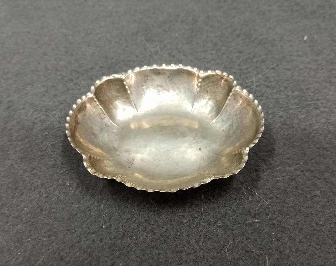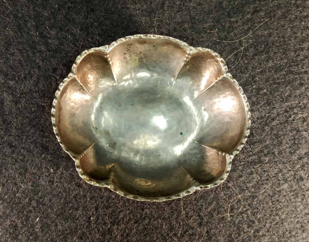 Kleine Silberschale, 800er Silber, Hand gearbeitet. Gestempelt 800, Symbole Mond und Krone sowie Handarbeit. L. x B. 7,5 x 9 cm, ca 26 g
