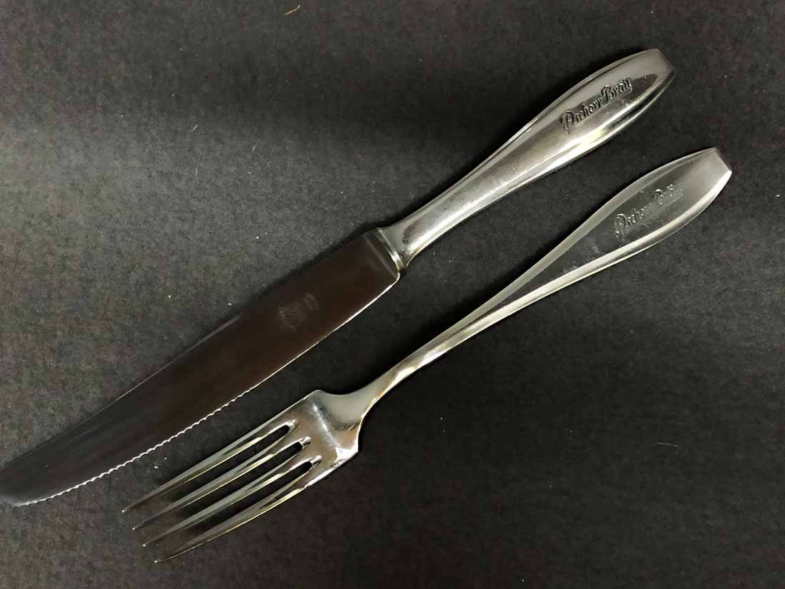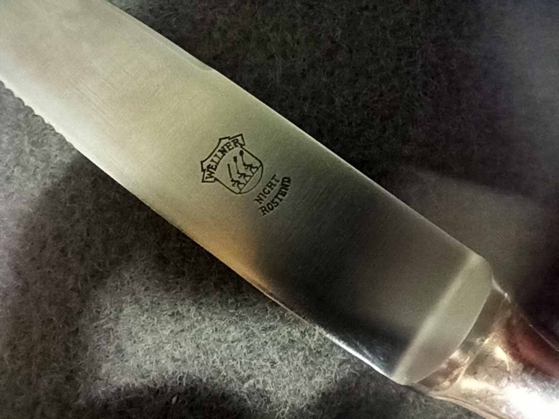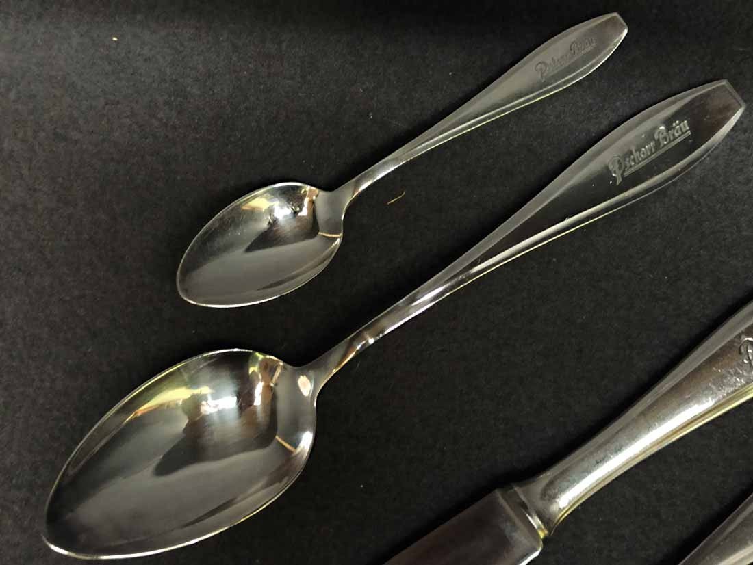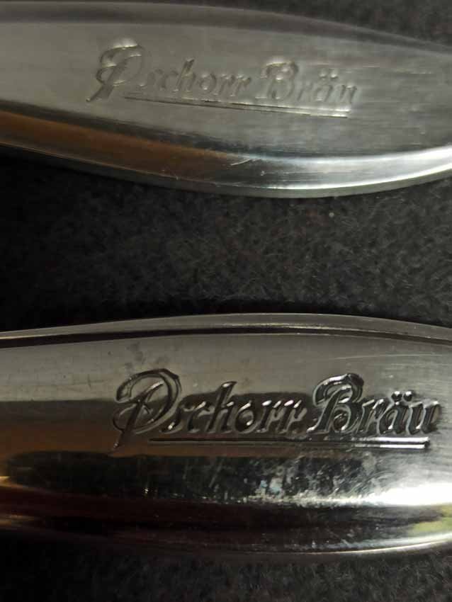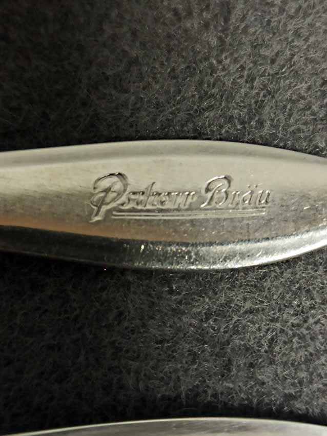 Pschorr Bräu - Besteck um 1900/1920. Set, 4Teile, bestehend aus Messer + Gabel, Löffel groß und Löffel klein. Jedes Teil mit Schriftzug "Pschorr Bräu" am Griff. Auf den Fotos ist der Schriftzug tw. undeutlich wegen der Spiegelungen. Im original sind alle deutlich ausgeprägt. Wellner Besteck, Wellner Silber 90er Auflage. Sehr guter Zustand.