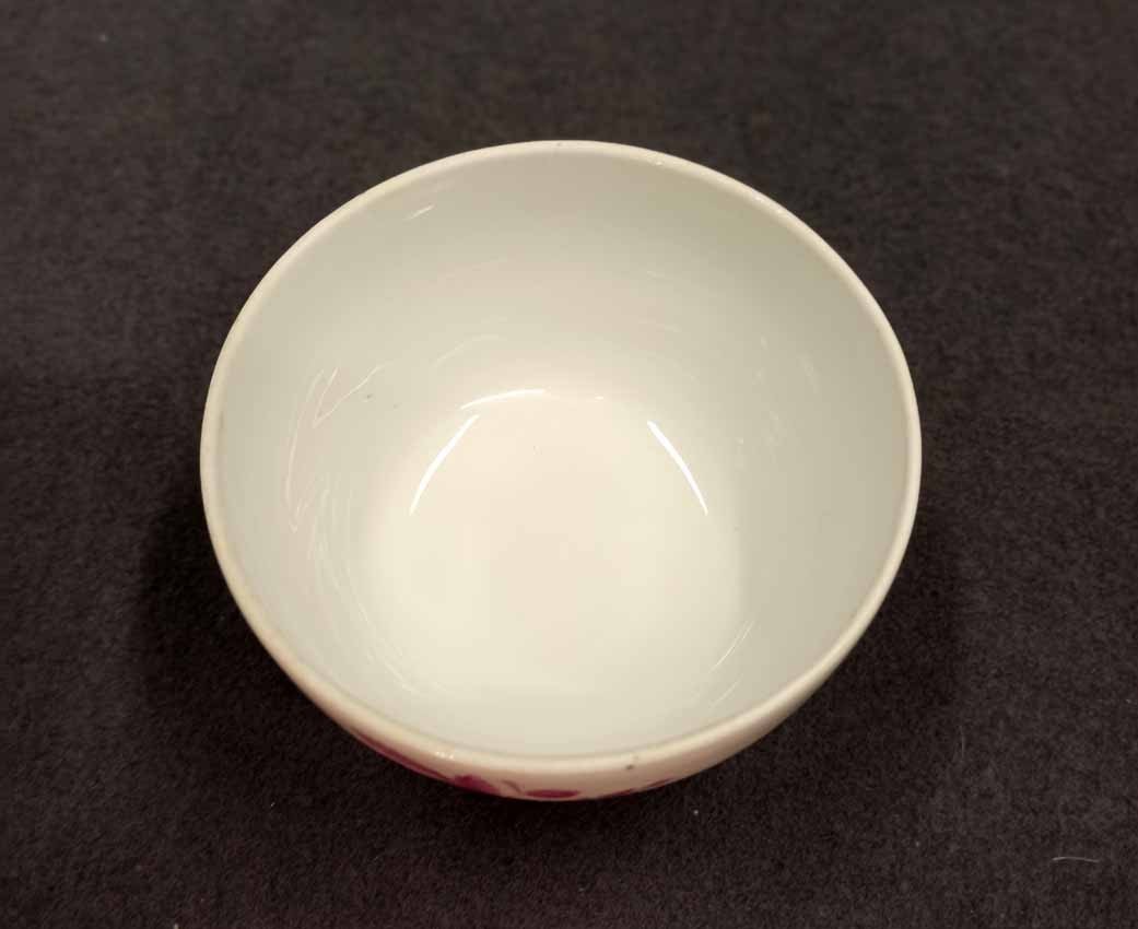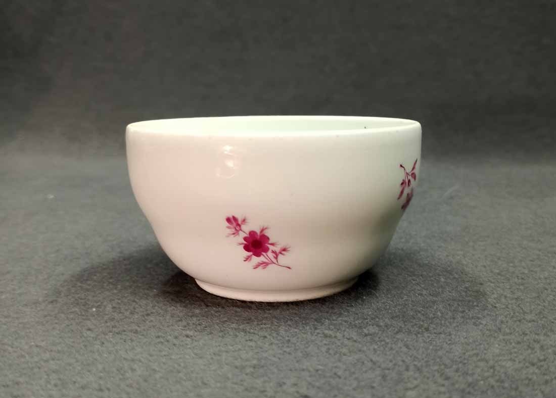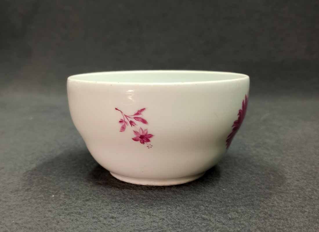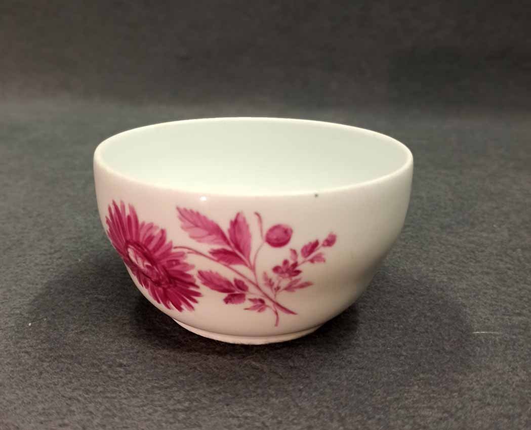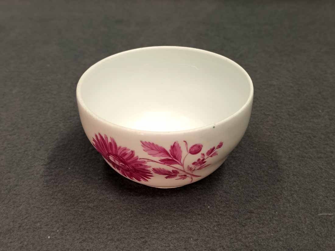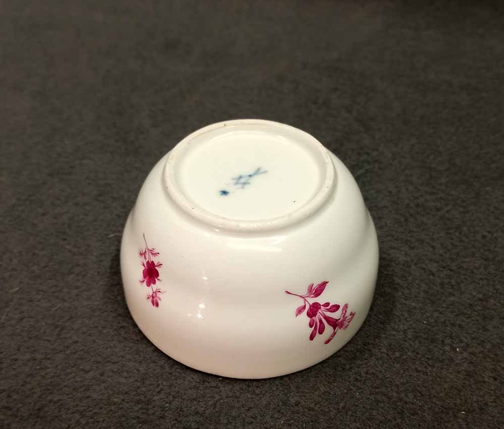 Meissen, 1774 - 1814, Markolini. Schale mit Karminrot- bzw. Purpur- Blumenmalerei. D. 10.5 cm, H. 6 cm. Sehr guter Zustand ohne Beschädigungen. 1.Wahl, Schwertermarke mit Stern, Markolinistern zw. 1774 und 1814, ohne Schleifstriche, 1. Wahl. Möglicherweise ehemals Deckeldose.