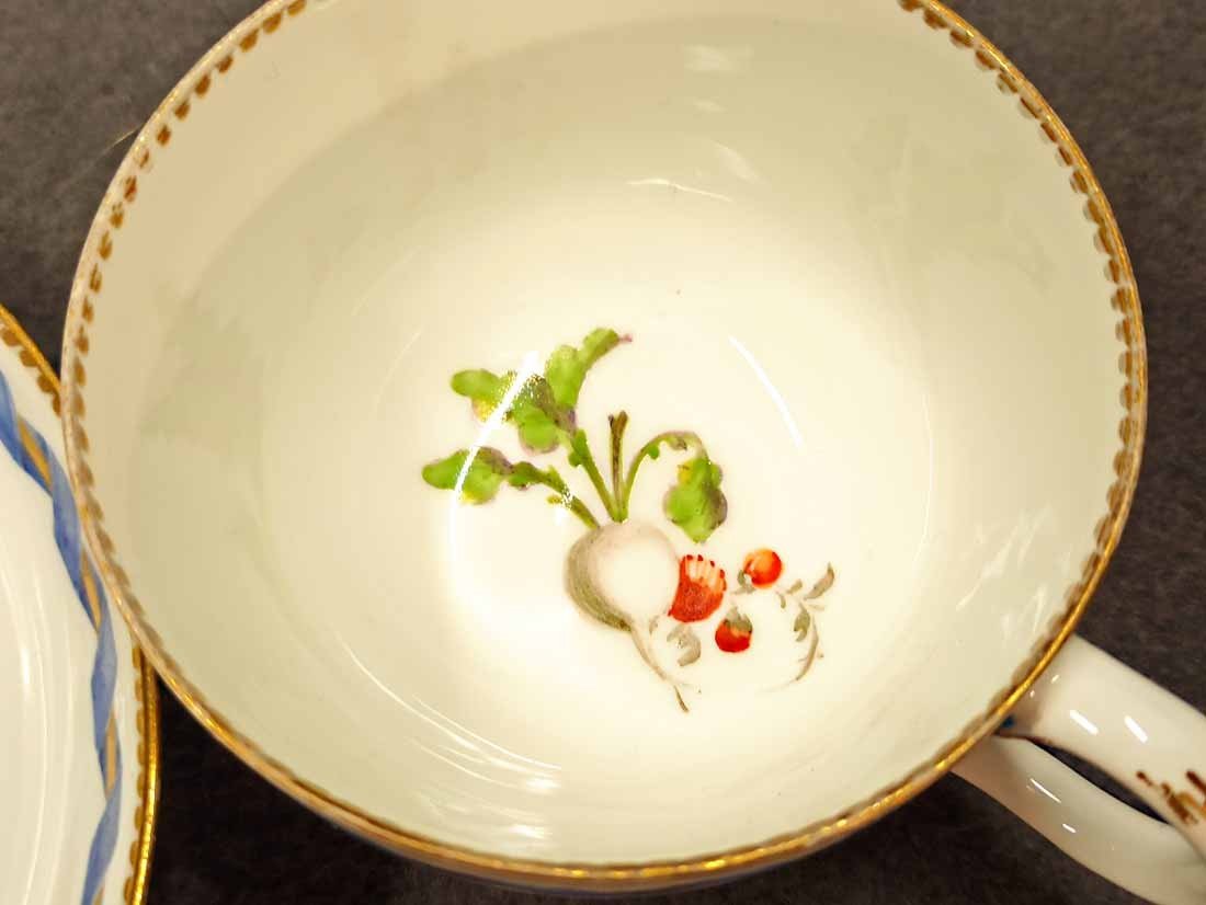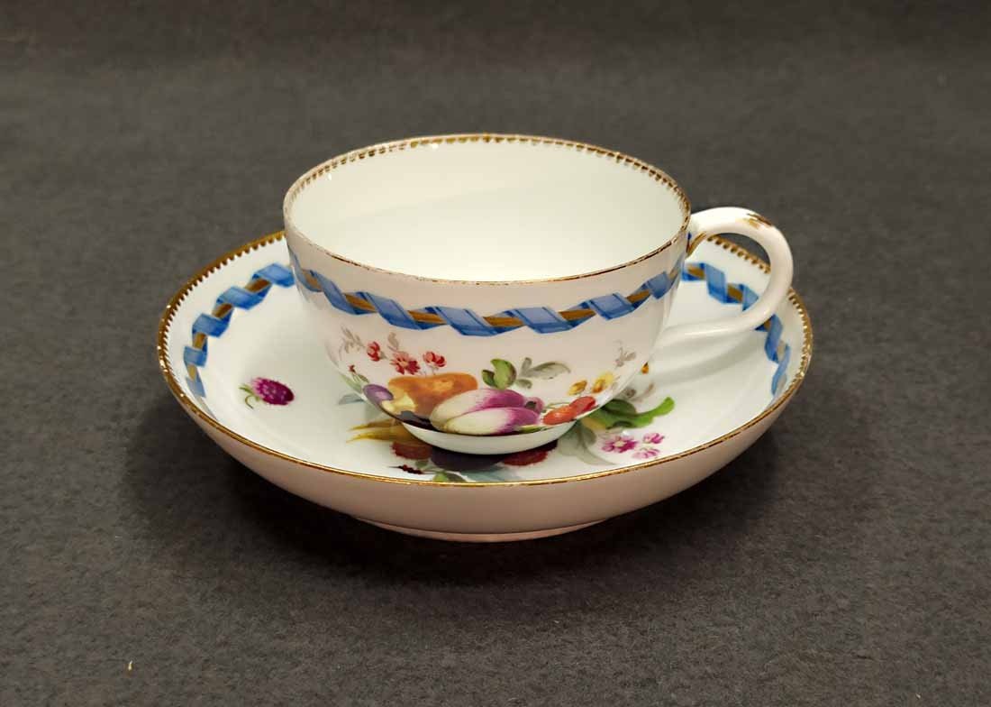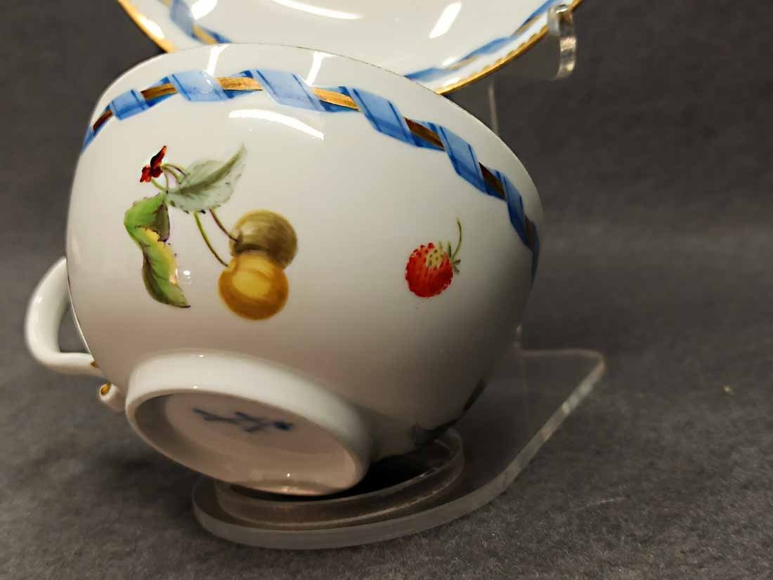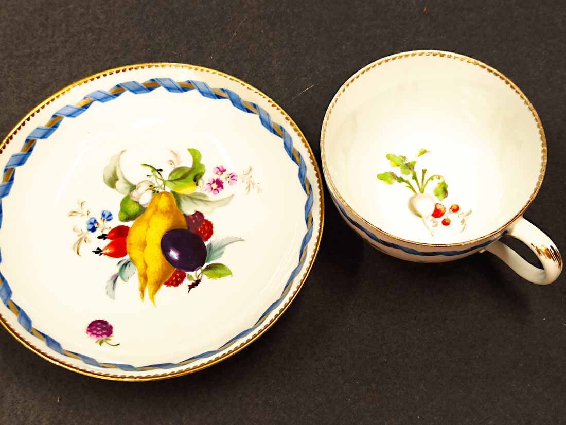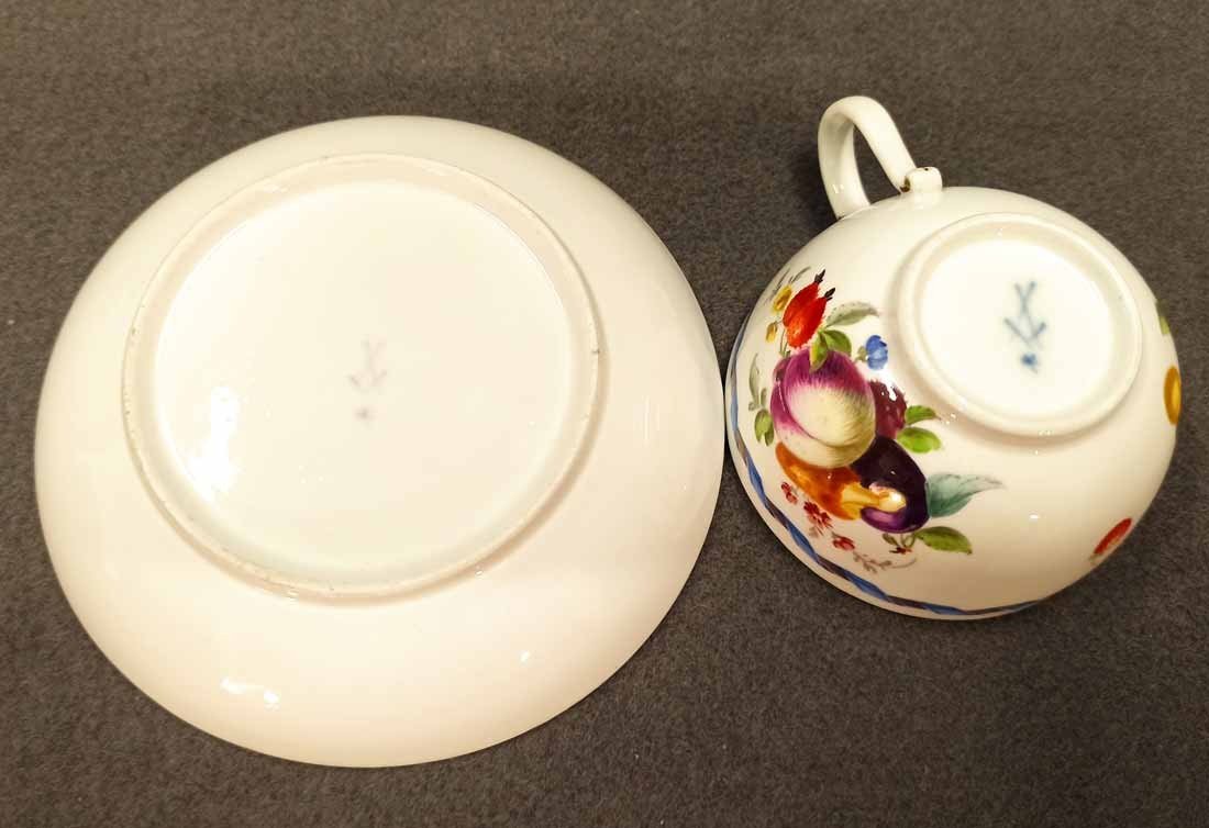 Meissen alt, Markolinizeit um 1790. Tasse mit Obst- bzw. Gartenmalerei, Randbordüre und Goldrand. Fein  und aufwändig gemaltes Obst, Pilz, Beeren, Gemüse und Blattwerk auf Tasse und Untertasse. Guter Zustand; Tasse ohne Beschädigungen. Untertasse mit einer alten, gut ausgeführten Restaurierung am Rand innen (Foto), Bordüre sehr gut, das Weiß farbl. etwas abweichend. Die Außenseite an dieser Stelle bis zu Oberkannte unbeschädigt. Goldränder etwas berieben. Tasse. H. 4,7 cm, D. 8 cm; Untertasse H. 3 cm, D. 13 cm. Schwertermarke der Manufaktur Meissen mit Markolinistern um 1790 ohne Schleifstriche, 1. Wahl.