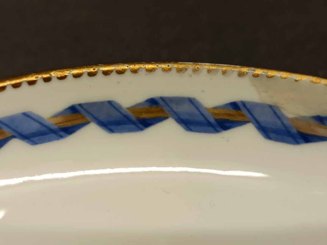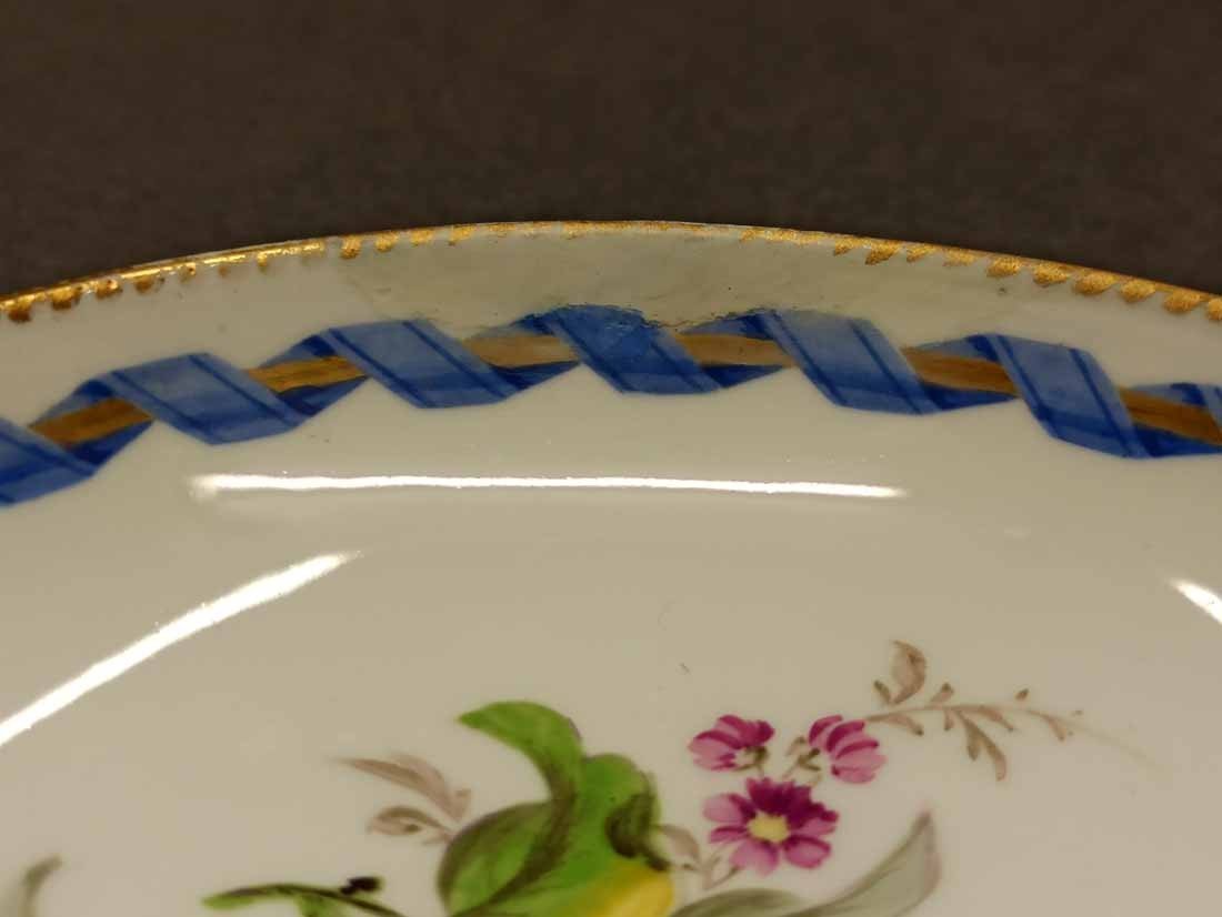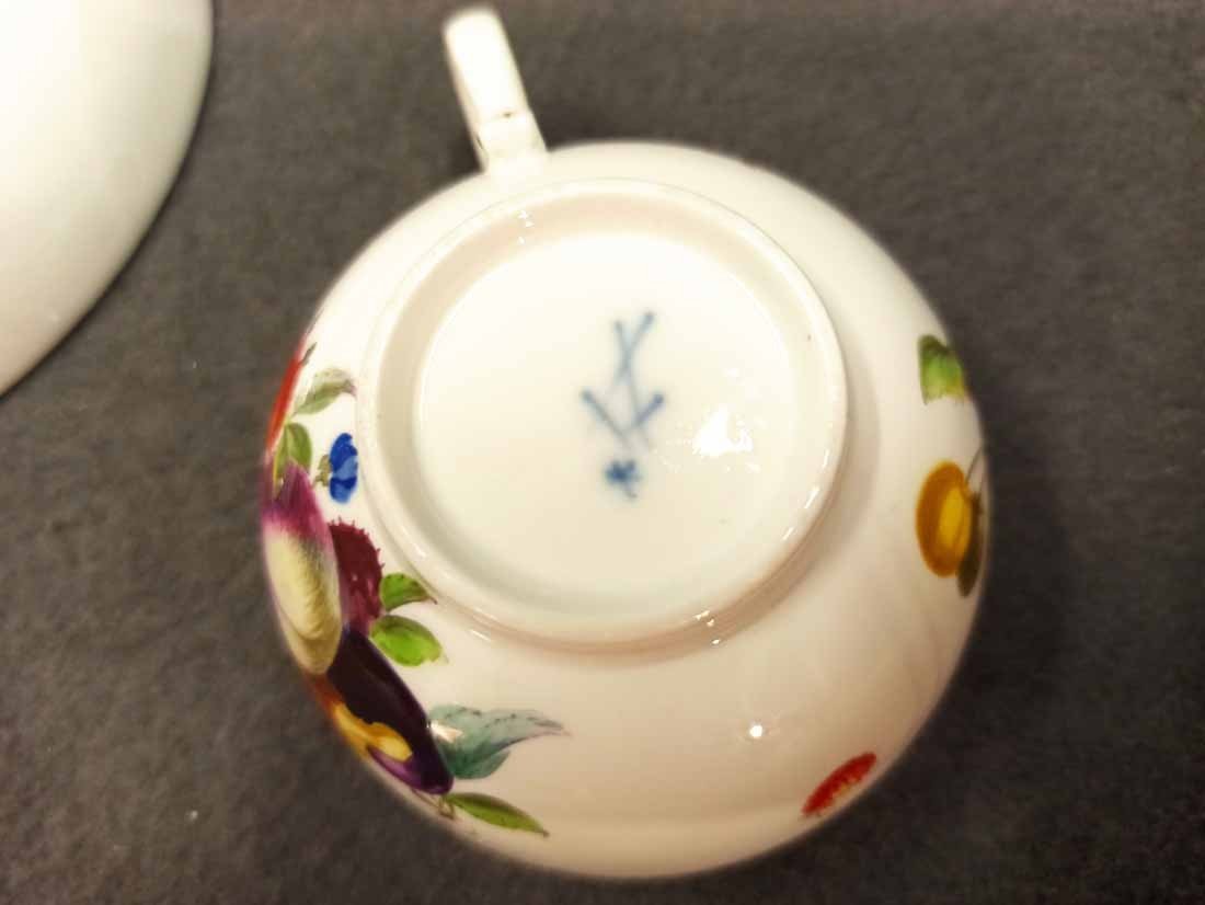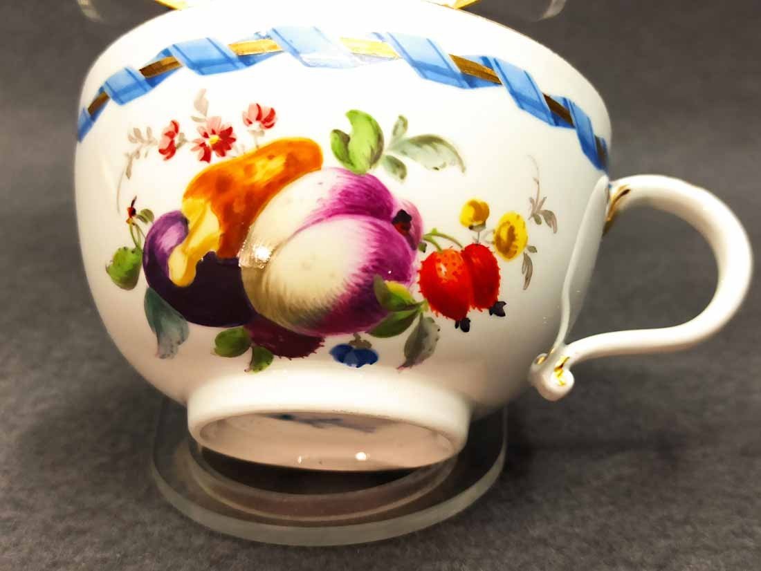 Meissen alt, Markolinizeit um 1790. Tasse mit Obst- bzw. Gartenmalerei, Randbordüre und Goldrand. Fein  und aufwändig gemaltes Obst, Pilz, Beeren, Gemüse und Blattwerk auf Tasse und Untertasse. Guter Zustand; Tasse ohne Beschädigungen. Untertasse mit einer alten, gut ausgeführten Restaurierung am Rand innen (Foto), Bordüre sehr gut, das Weiß farbl. etwas abweichend. Die Außenseite an dieser Stelle bis zu Oberkannte unbeschädigt. Goldränder etwas berieben. Tasse. H. 4,7 cm, D. 8 cm; Untertasse H. 3 cm, D. 13 cm. Schwertermarke der Manufaktur Meissen mit Markolinistern um 1790 ohne Schleifstriche, 1. Wahl.