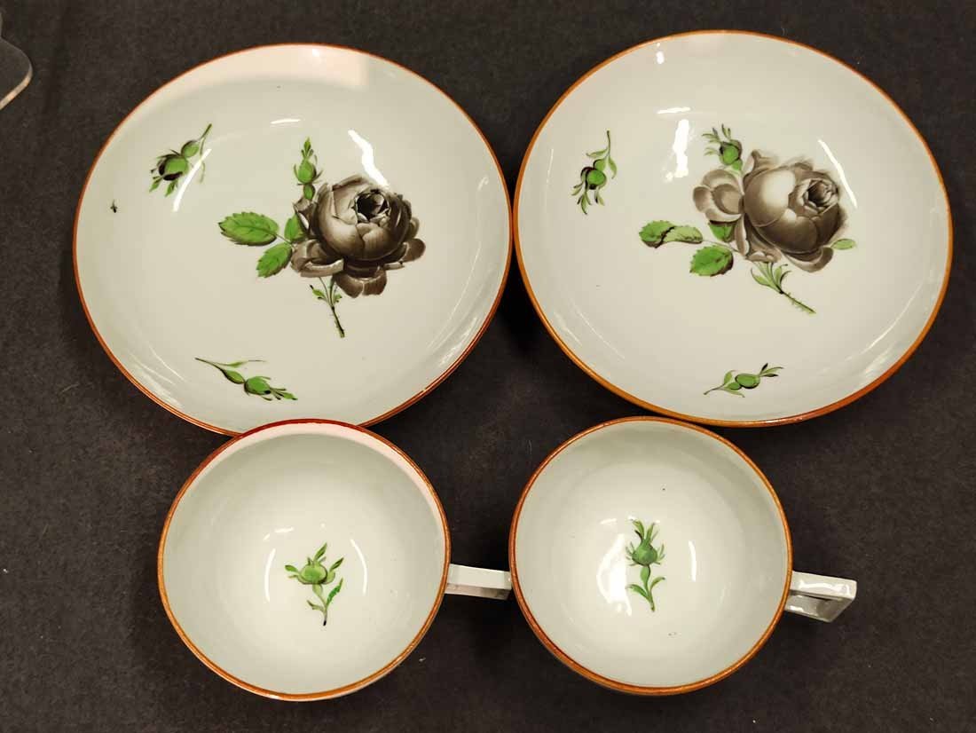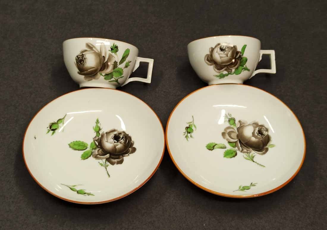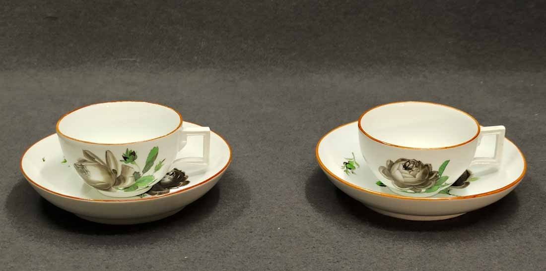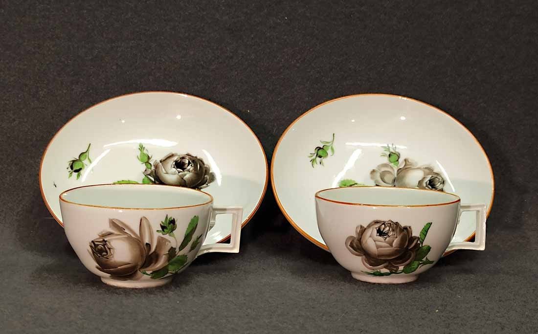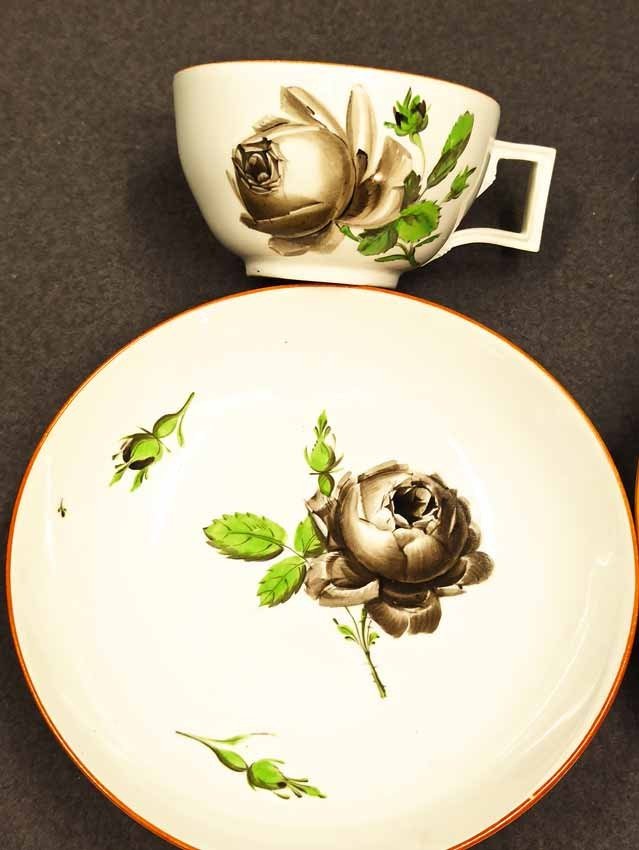 Meissen alt, Markolinizeit um 1790. Zwei Tassen, Dekor Schwarze Rose, Rotbrauner Rand. Fein gemalte und individuell gemalte schwarze Rosen auf Tasse und Untertasse. Sehr guter Zustand ohne Beschädigungen. Tasse. H. 4,5 cm, D. 7,7 cm; Untertasse H. 3 cm, D. 13,3 cm. Schwertermarke der Manufaktur Meissen mit Markolinistern um 1790 ohne Schleifstriche, 1. Wahl. Verkauf auch einzeln.