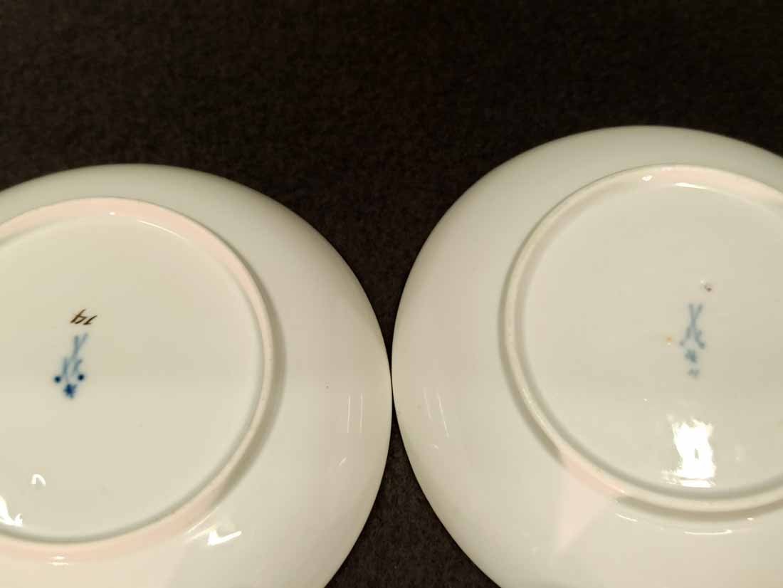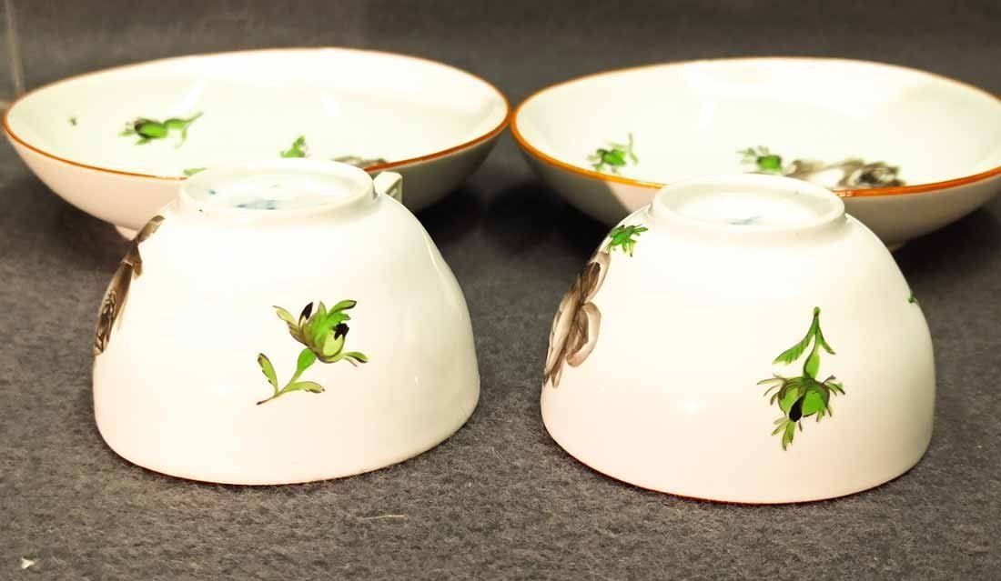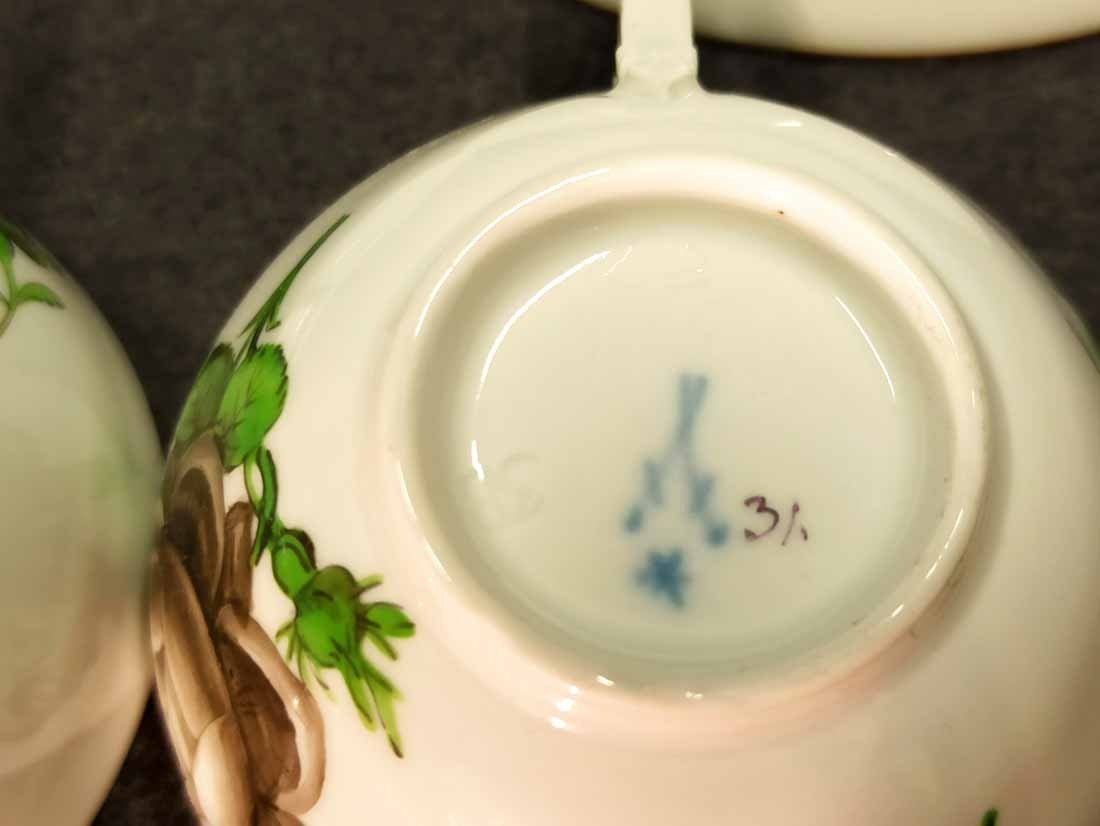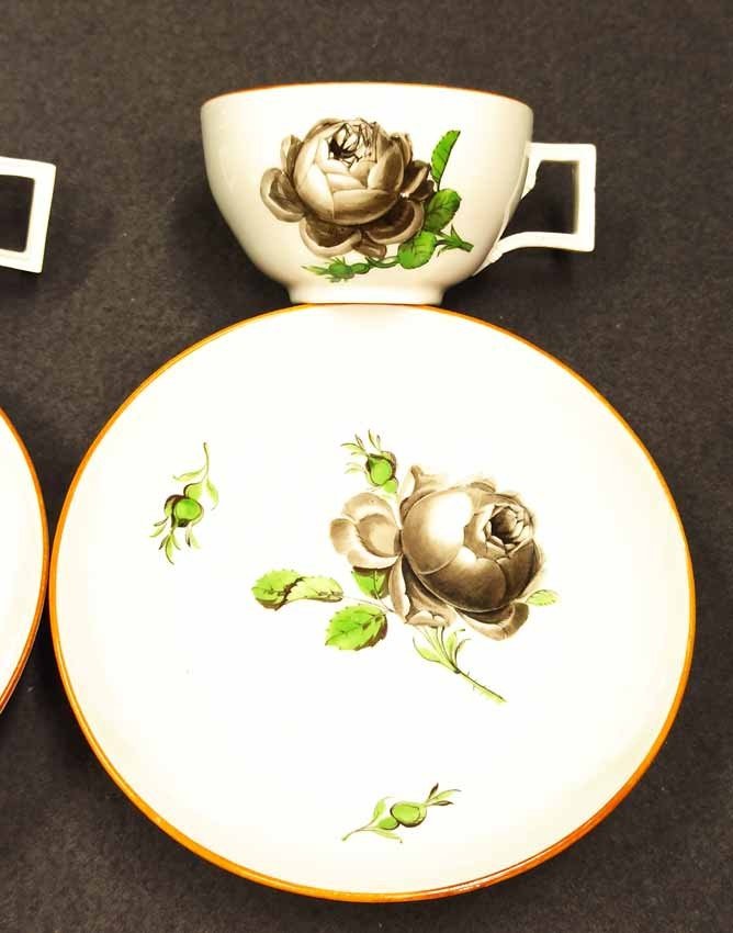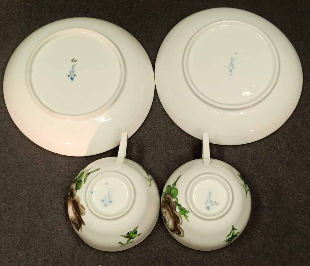 Meissen alt, Markolinizeit um 1790. Zwei Tassen, Dekor Schwarze Rose, Rotbrauner Rand. Fein gemalte und individuell gemalte schwarze Rosen auf Tasse und Untertasse. Sehr guter Zustand ohne Beschädigungen. Tasse. H. 4,5 cm, D. 7,7 cm; Untertasse H. 3 cm, D. 13,3 cm. Schwertermarke der Manufaktur Meissen mit Markolinistern um 1790 ohne Schleifstriche, 1. Wahl. Verkauf auch einzeln.