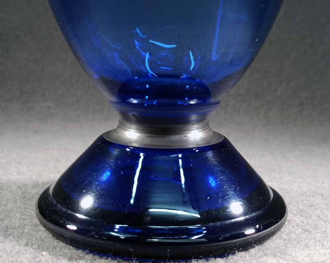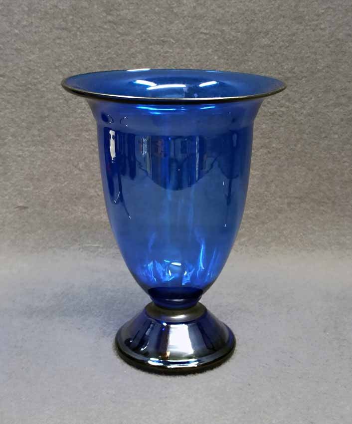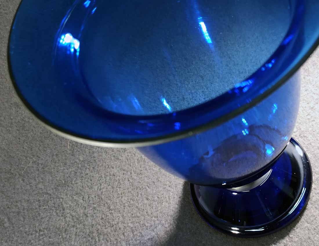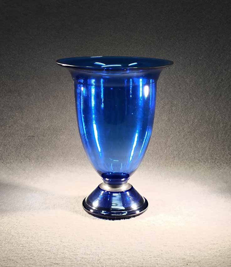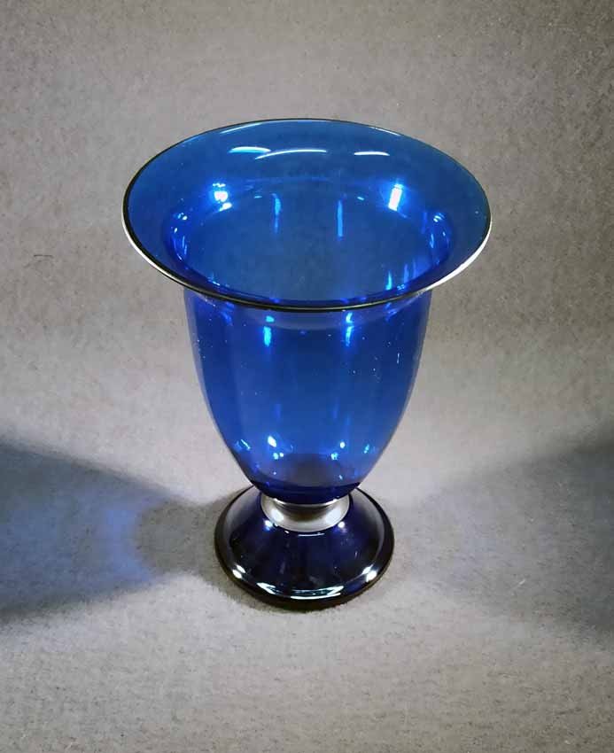 Jean Beck, München. Blaue Kraterartige Vase auf Fuß. Art Deco um 1920/25. Jean Beck (eig. Johann Ludwig) Glas- und Keramikdesigner, studierte in München, Paris und Dresden. H. 20,5 cm, D. oben 15,5 cm. Sehr guter Zustand ohne Beschädigungen. Signiert, am Boden Ätzstempel " Jean Beck München".
