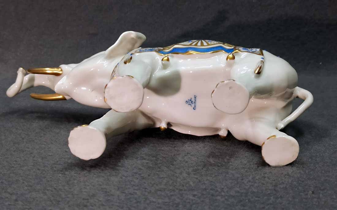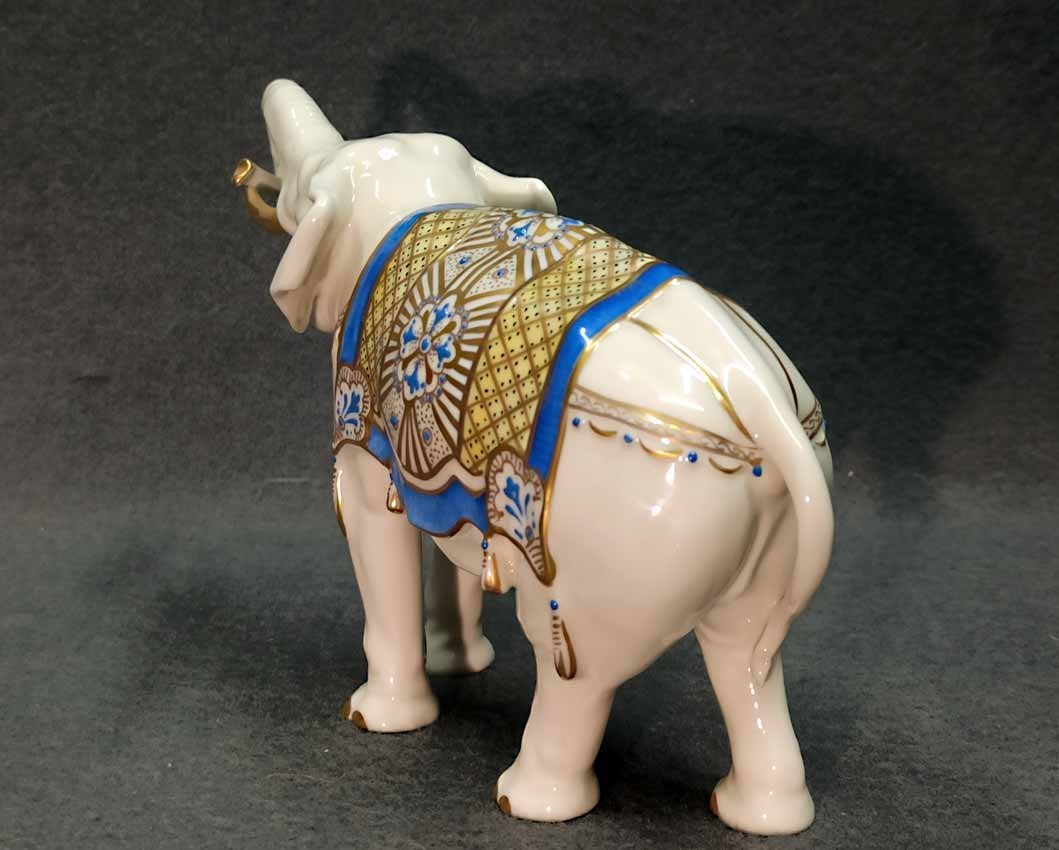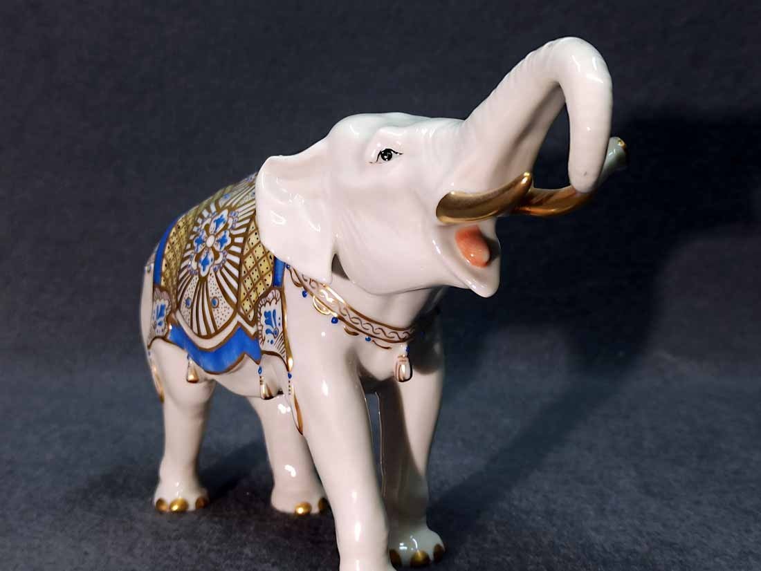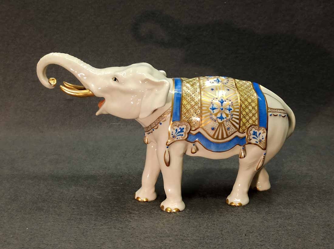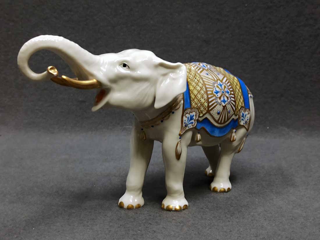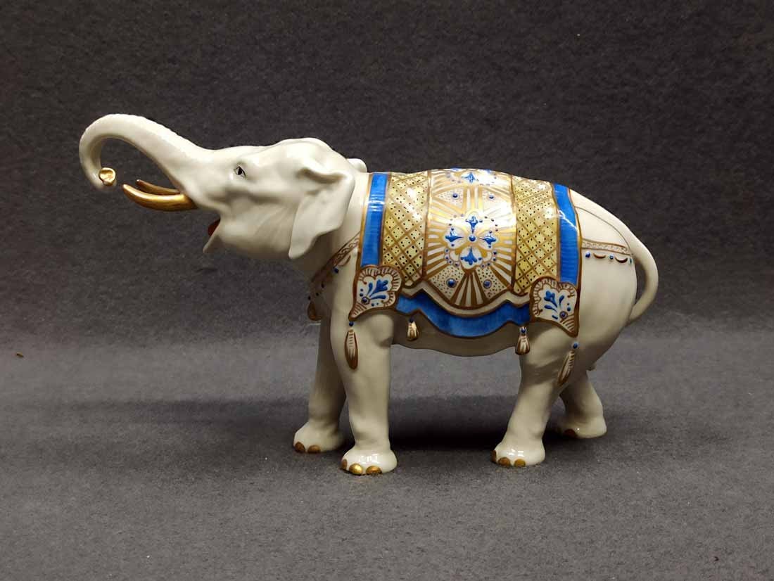 Elefant, Glückselefant, Rudolf Kämmer, Volkstedt. Schreitender asiatischer Elefant mit erhobenem Rüssel, Kopfschmuck und Schabracke. Naturalistische Ausformung mit Goldstaffage und Emailbemalung. Sehr guter Zustand. Unterglasurblaue Stempelmarke der Manufaktur Rud. Kämmer, H 15 cm.