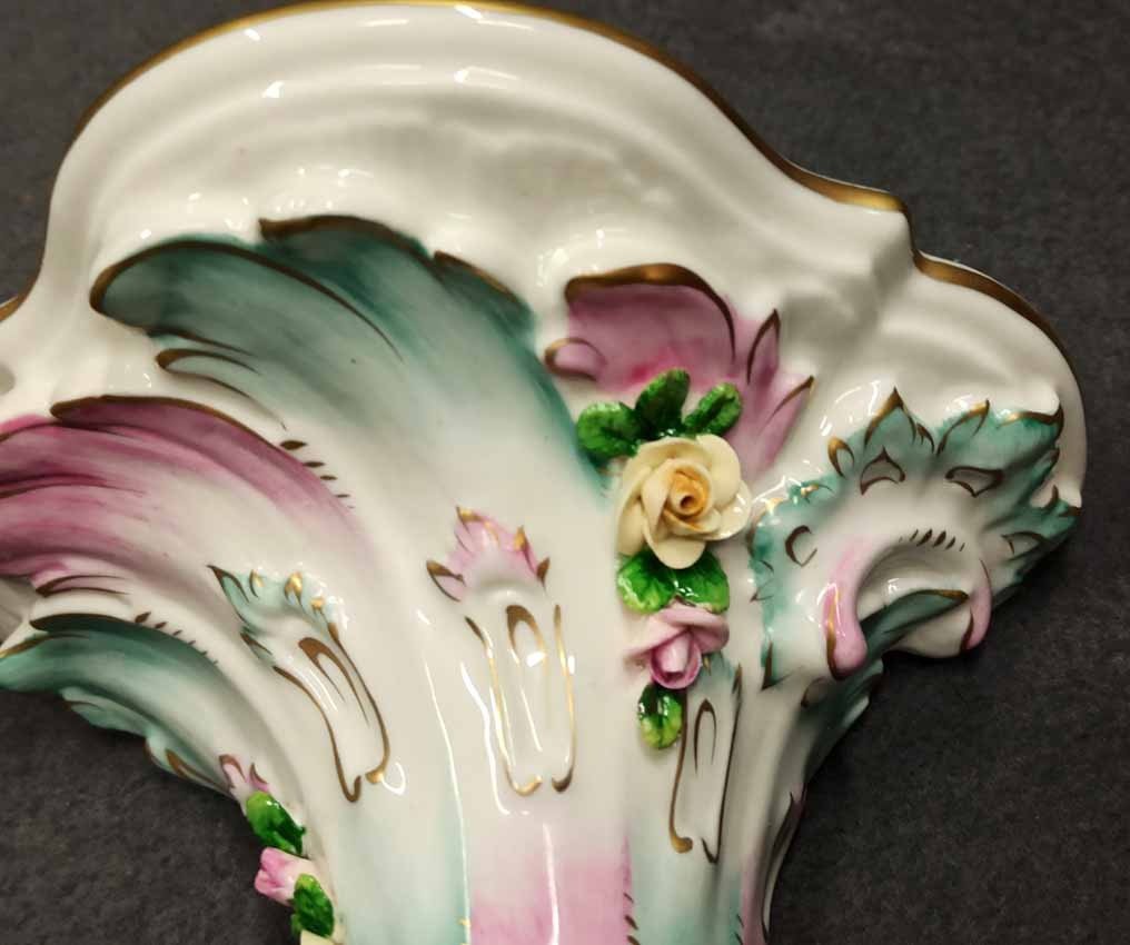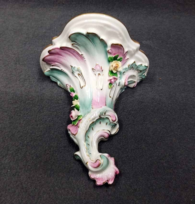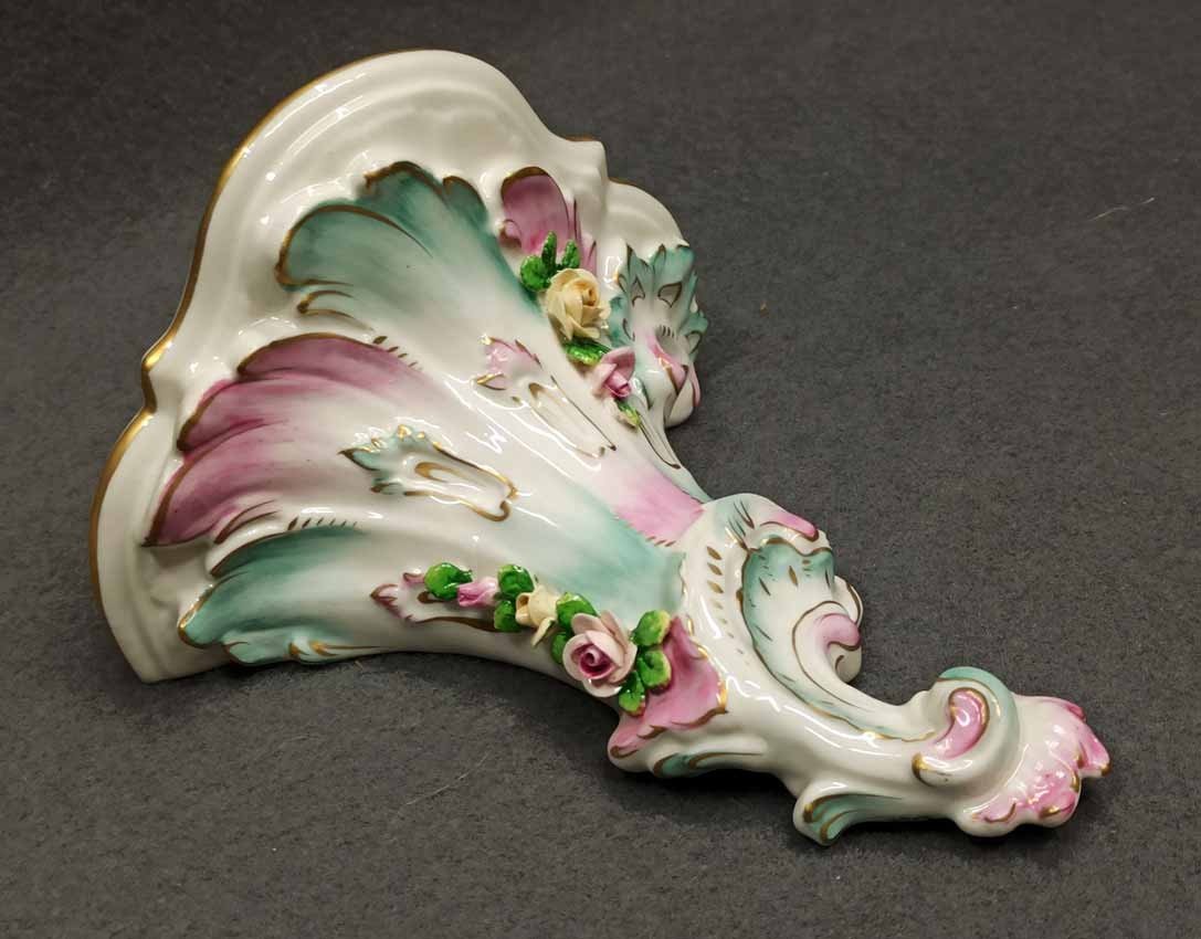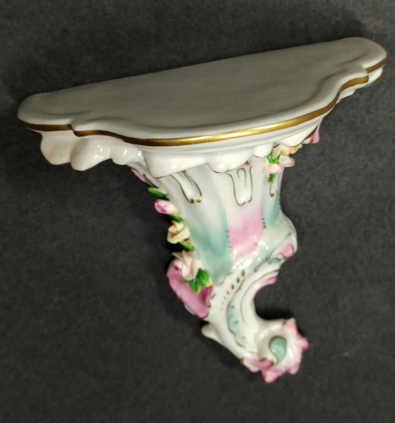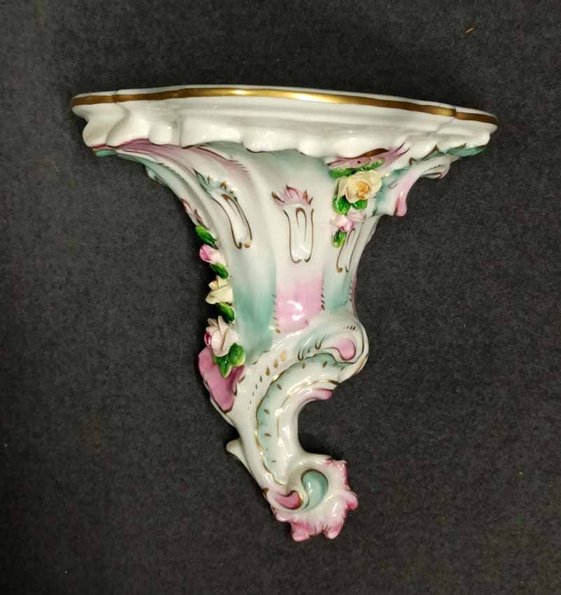 Reserviert! Wandkonsole im Rokokostil mit Blütenbesatz. Porzellanmanufaktur Rudolf Kämmer, Thüringen Rudolstadt. Sehr guter Zustand ohne Beschädigungen. H. 16,5 cm, B. 15 cm. Zwei von Zwei.