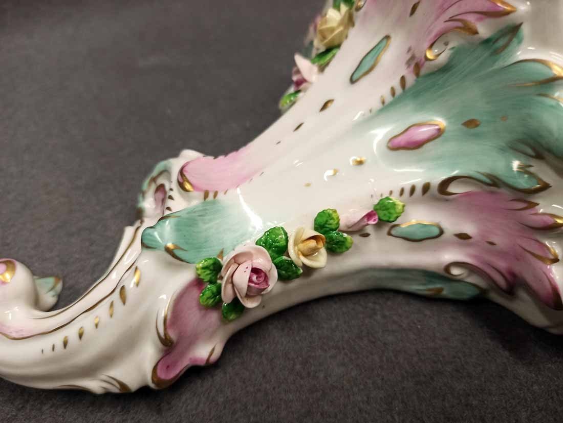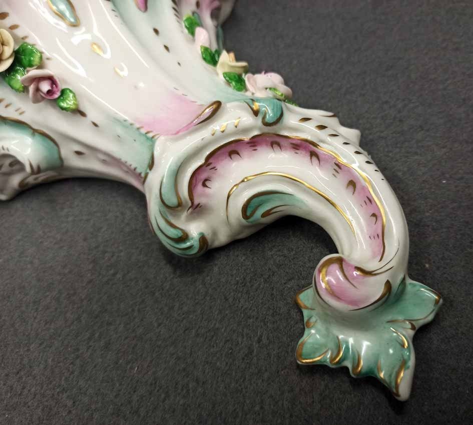 Reserviert! Wandkonsole im Rokokostil mit Blütenbesatz. Porzellanmanufaktur Rudolf Kämmer, Thüringen Rudolstadt. Sehr guter Zustand ohne Beschädigungen. H. 16,5 cm, B. 15 cm. Eins von Zwei. Unterglasurblaue Marke der Manufaktur Kämmer, K unter Krone.