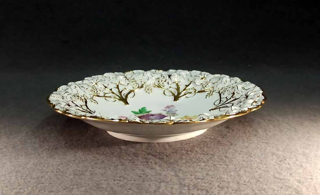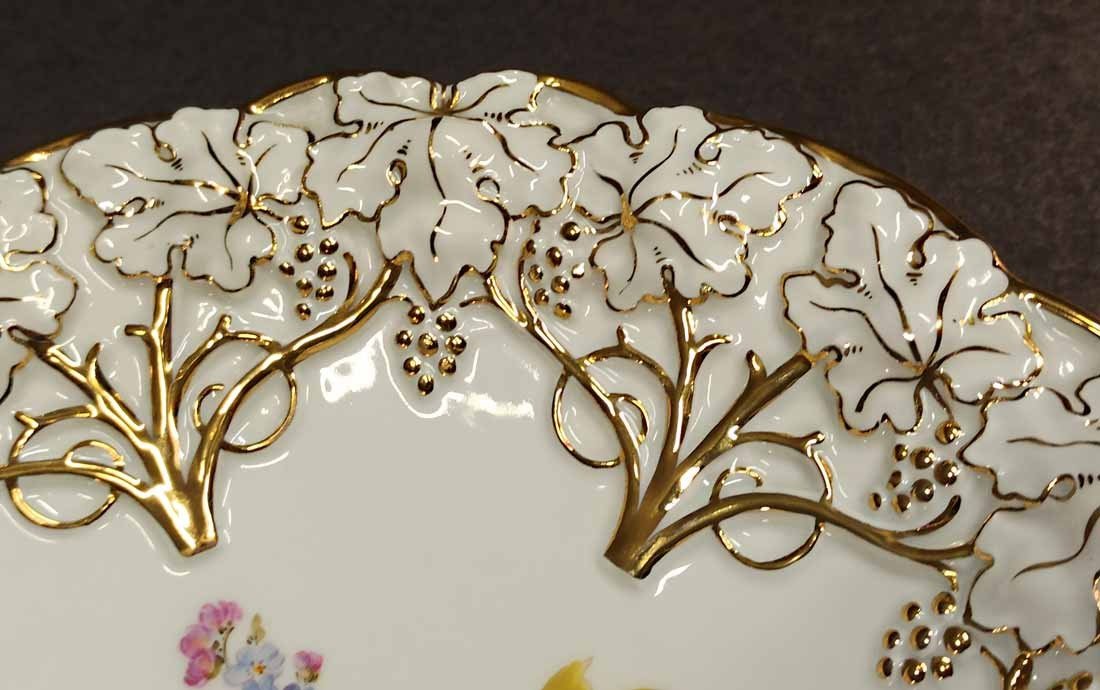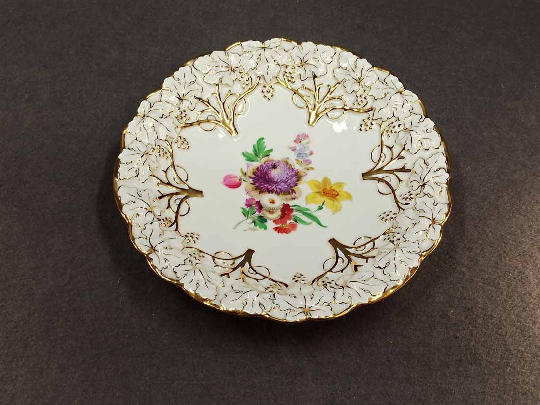 Meissen Prunkschale um 1880. Blumenbukett und Gold, am Rand reliefierte Weintrauben und Blätter part. vergoldet. D. 21,5 cm, H. ca 4 cm. Sehr guter Zustand ohne Beschädigungen.  Alte Schwertermarke der Manufaktur Meissen mit Knaufgriffen um 1880, 2x gestrichen.