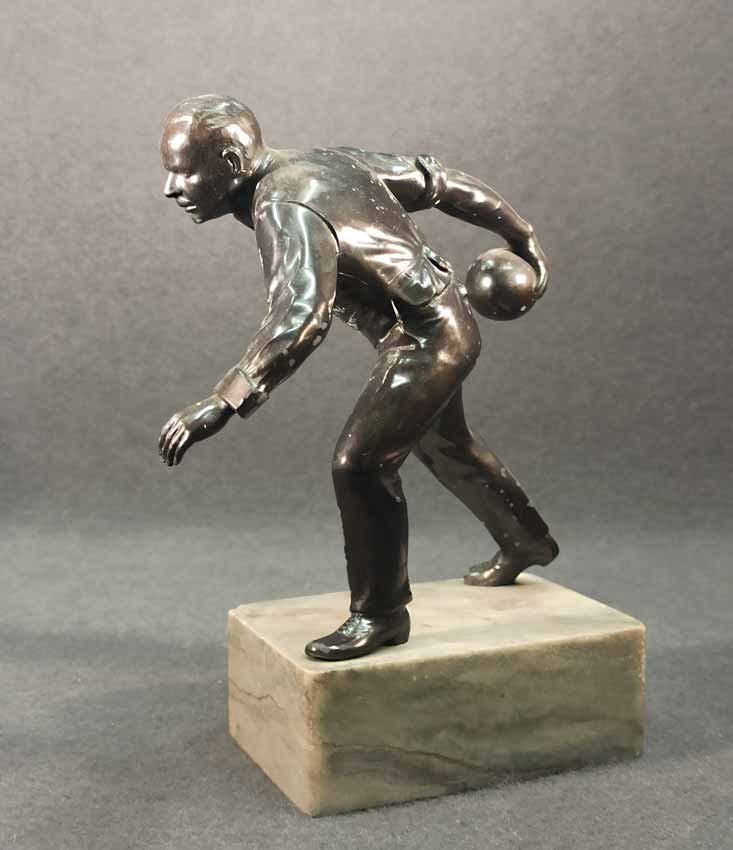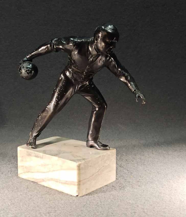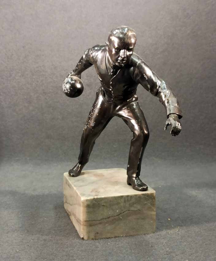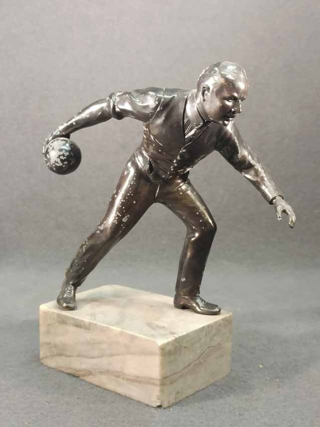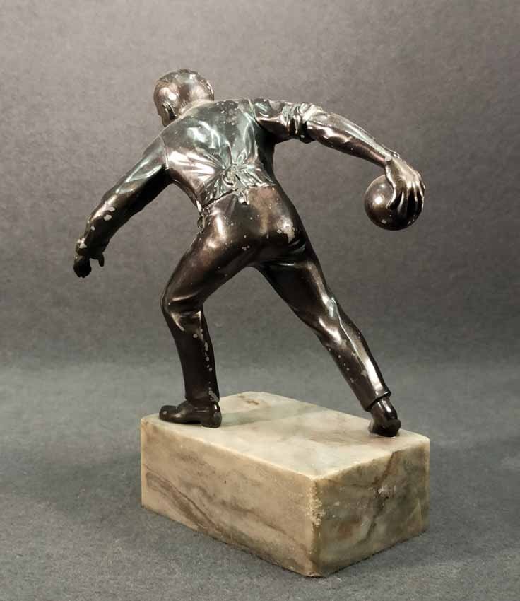 Plastik eines Kegel Sportlers in dynamischer Position. Um 1900, auf Marmorsockel. Metallguss, Oberflächen mit Gebrauchssporen bzw. punktuellen Nutzungsspuren der Oberflächem (Fotos). Figur ohne Beschädigungen. H. mit Sockel 20 cm.
