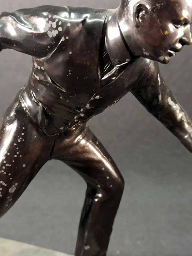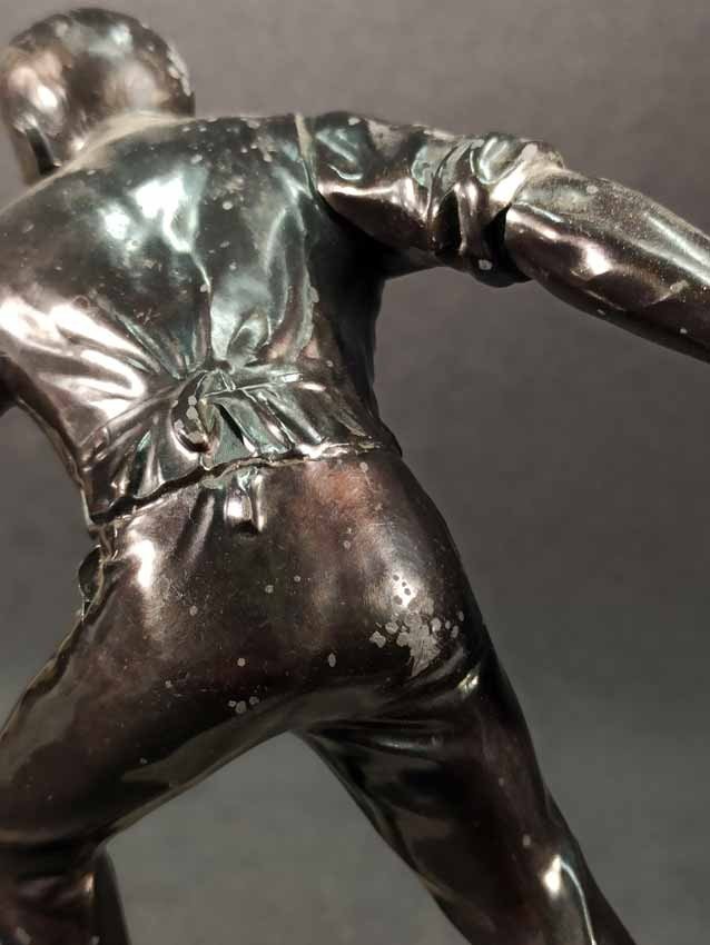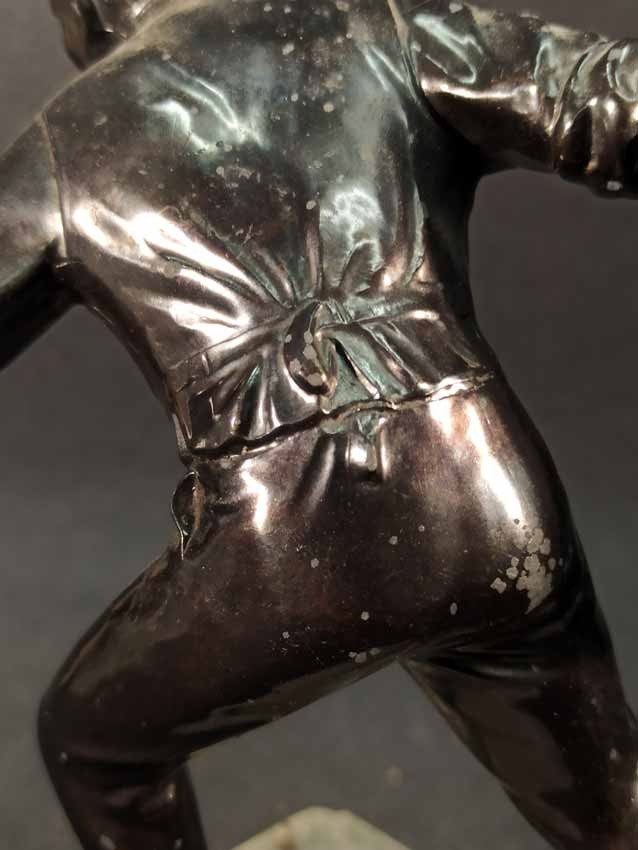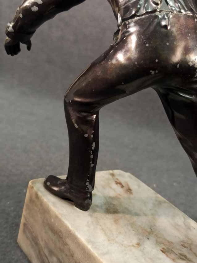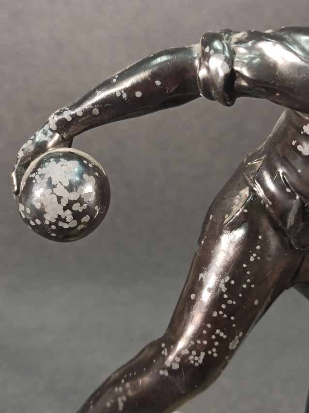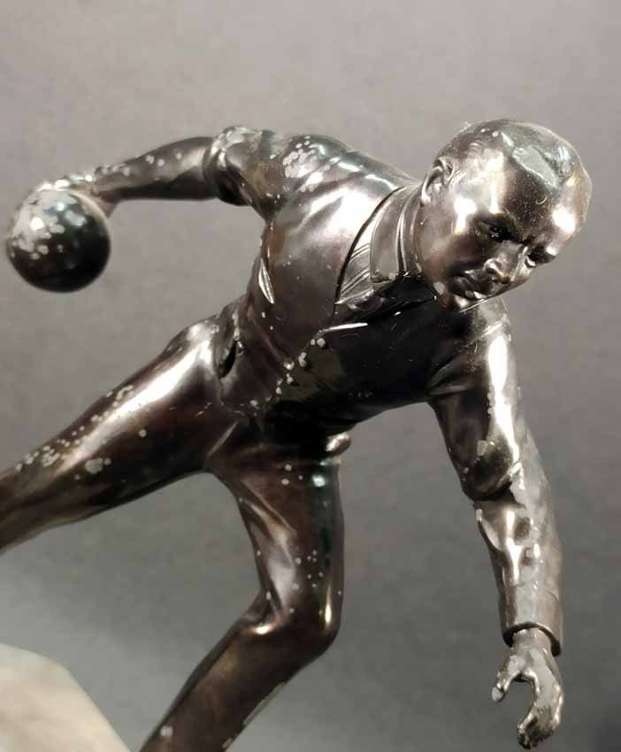 Plastik eines Kegel Sportlers in dynamischer Position. Um 1900, auf Marmorsockel. Metallguss, Oberflächen mit Gebrauchssporen bzw. punktuellen Nutzungsspuren der Oberflächem (Fotos). Figur ohne Beschädigungen. H. mit Sockel 20 cm.