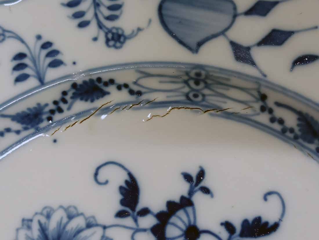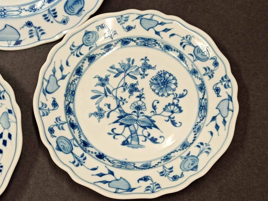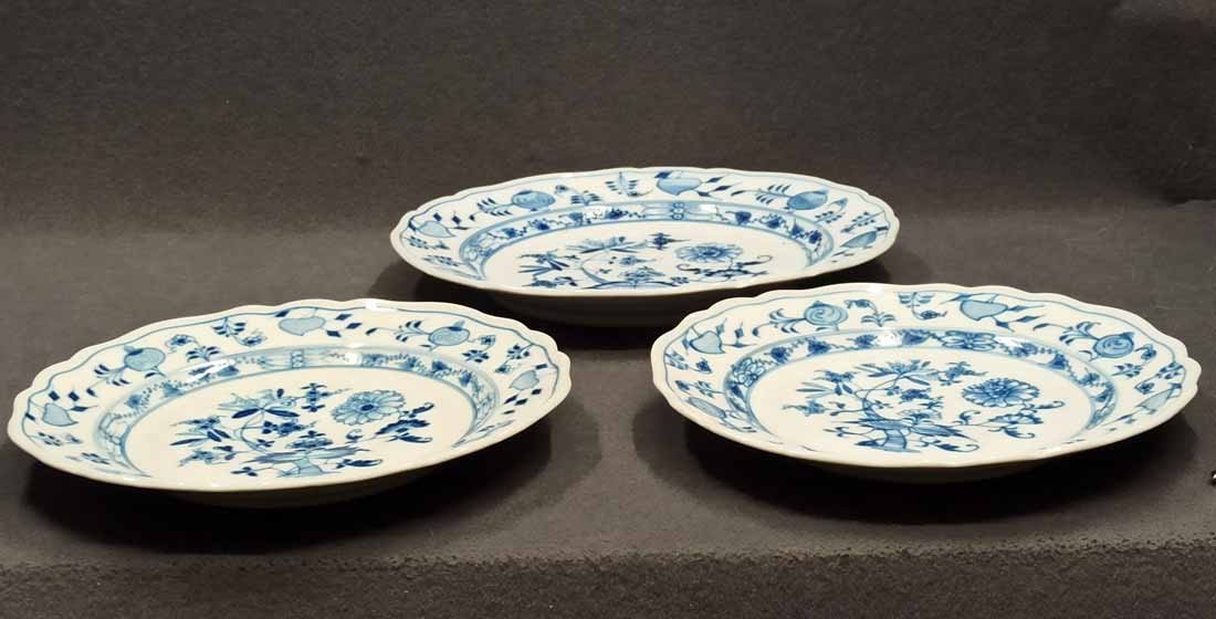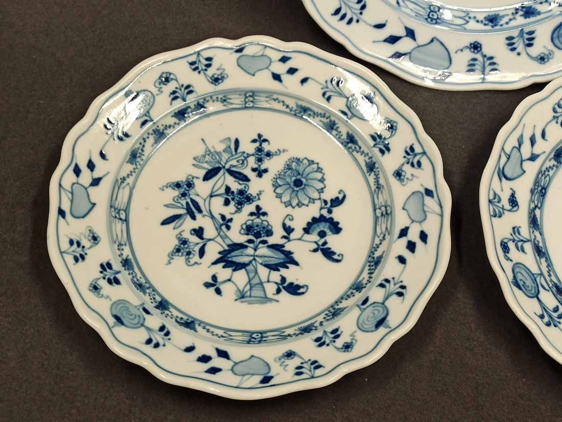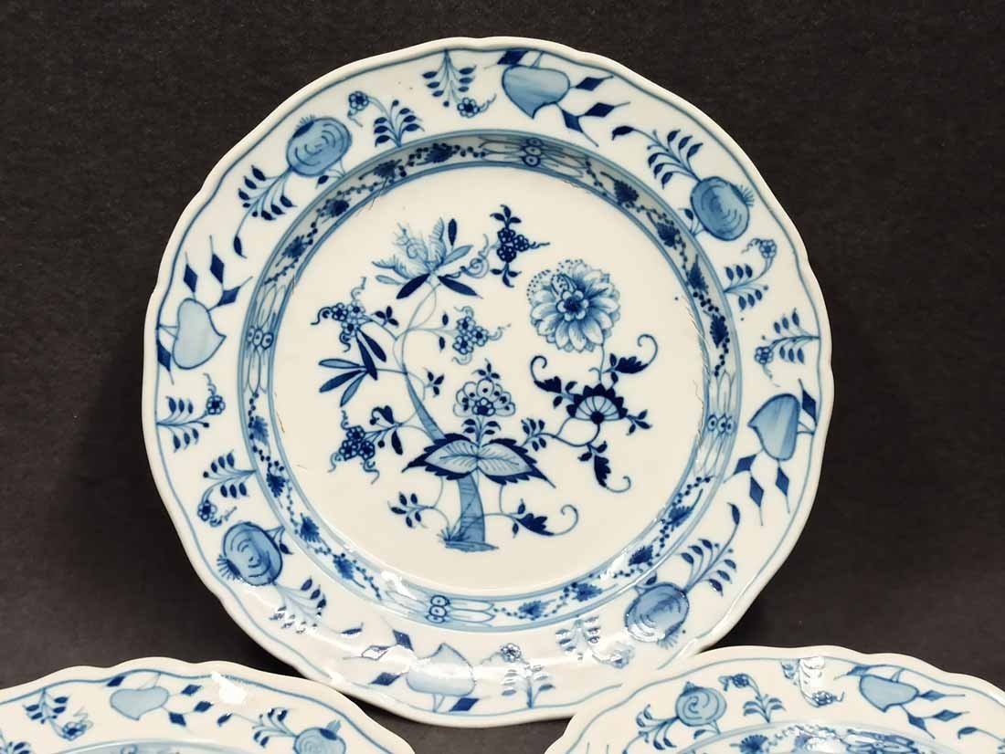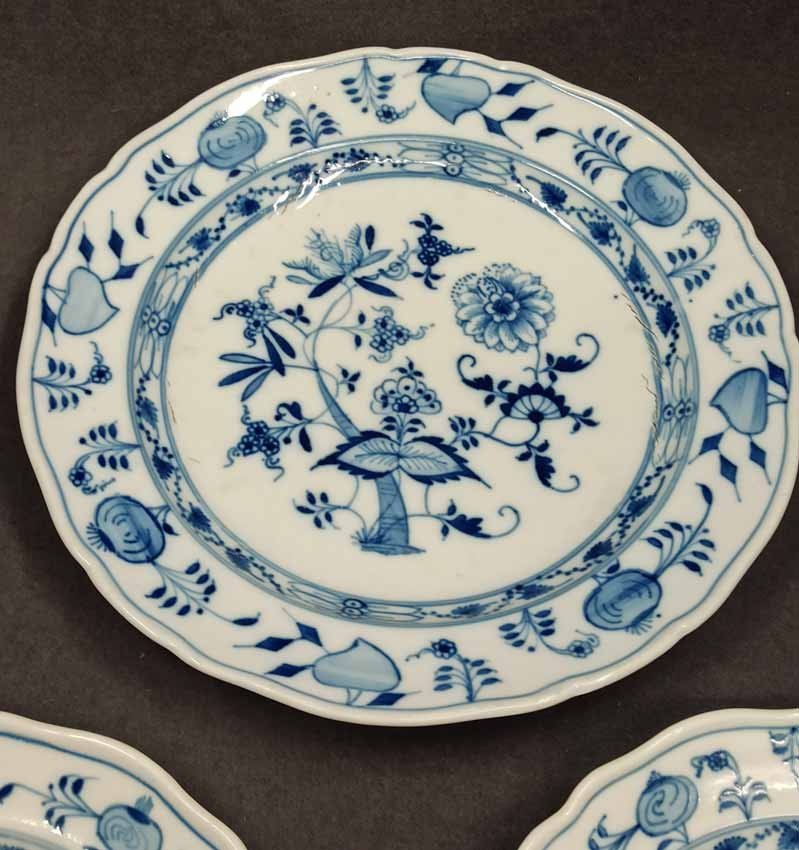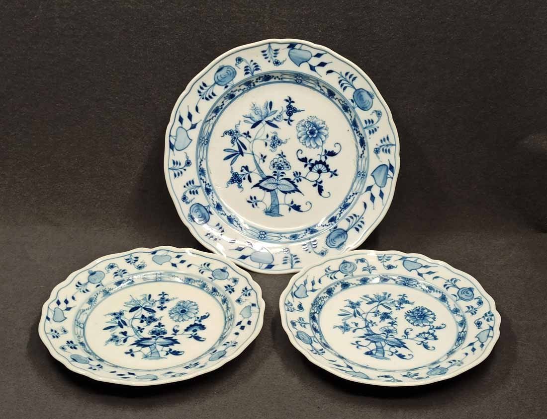 Drei Teller Zwiebelmuster, Manufaktur Teichert in Meissen um 1900. Versch. Größen. 2x Speiseteller D. 24,5- 25 cm; 1x großer Vorlegeteller D. 30 cm. Guter Zustand. Herstellungsbedingte und Teichert-typische Glasurunregelmäßigkeiten. Der große (30 cm) Teller mit Haarrissen vom Brand (Foto). Gemarkt mit der sogen "Ankermarke" : Pfeilkreuz mit gebogenem Schriftzug "Meissen" in Blau sowie der geprägte Stadtname "Meissen".