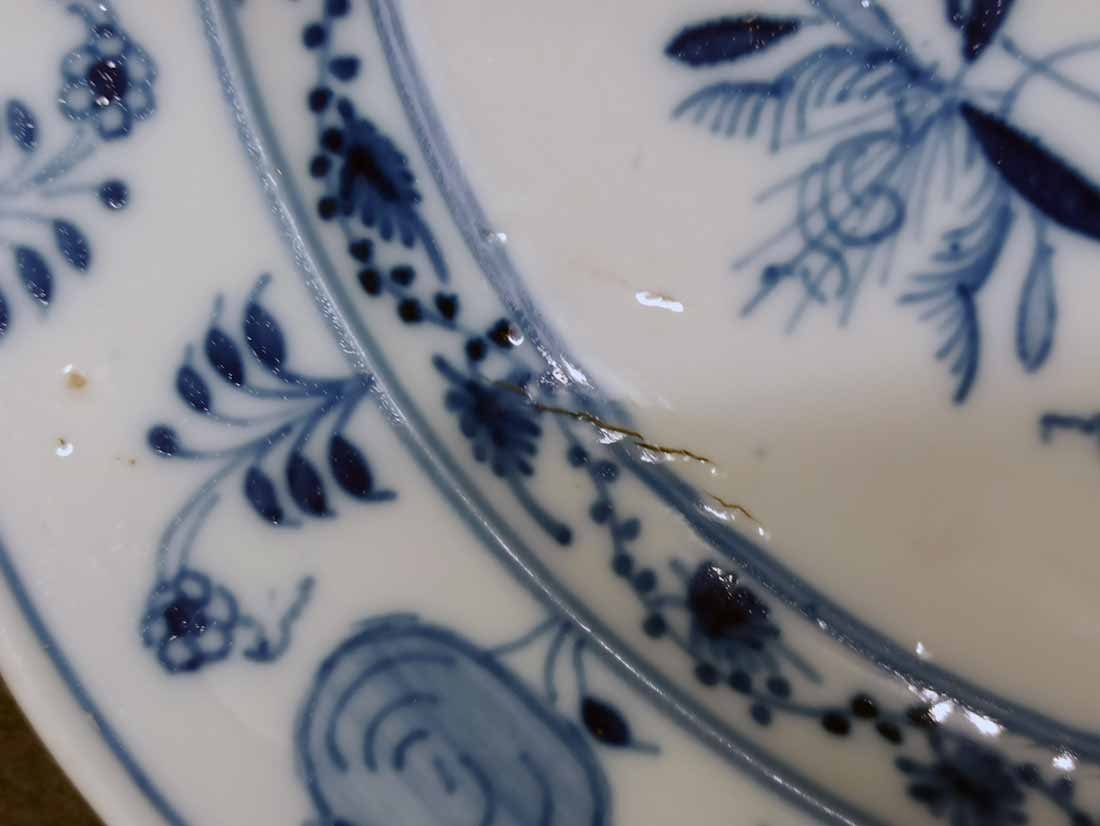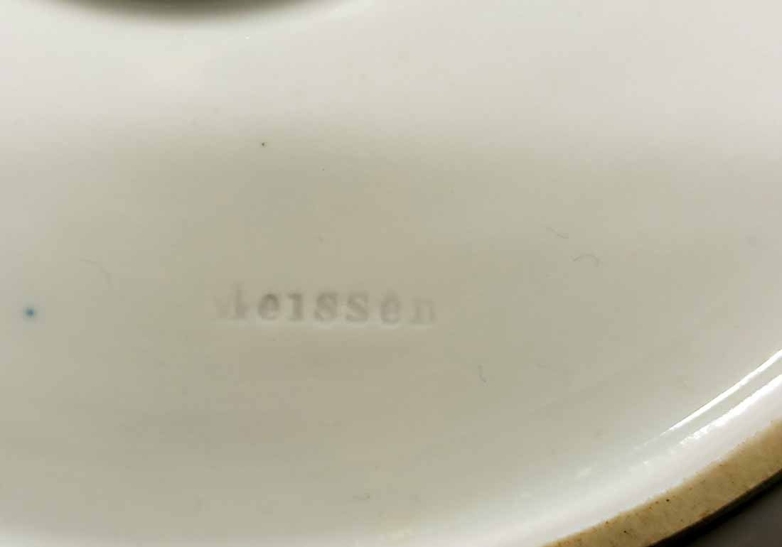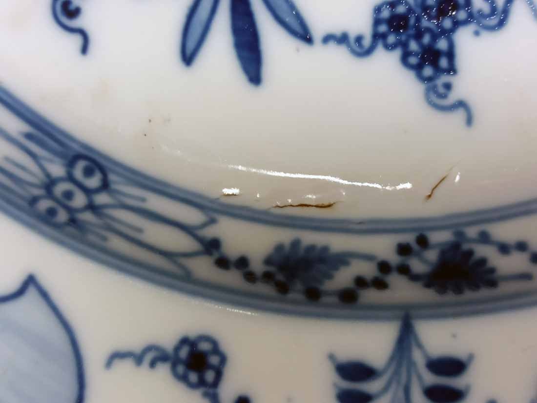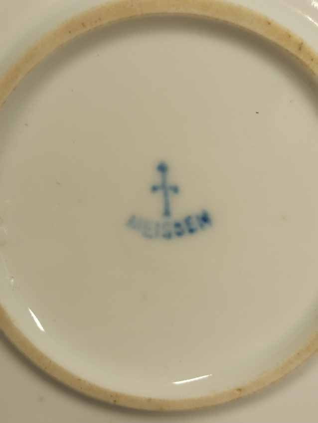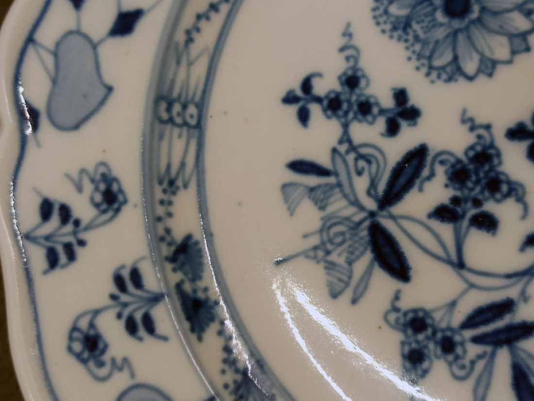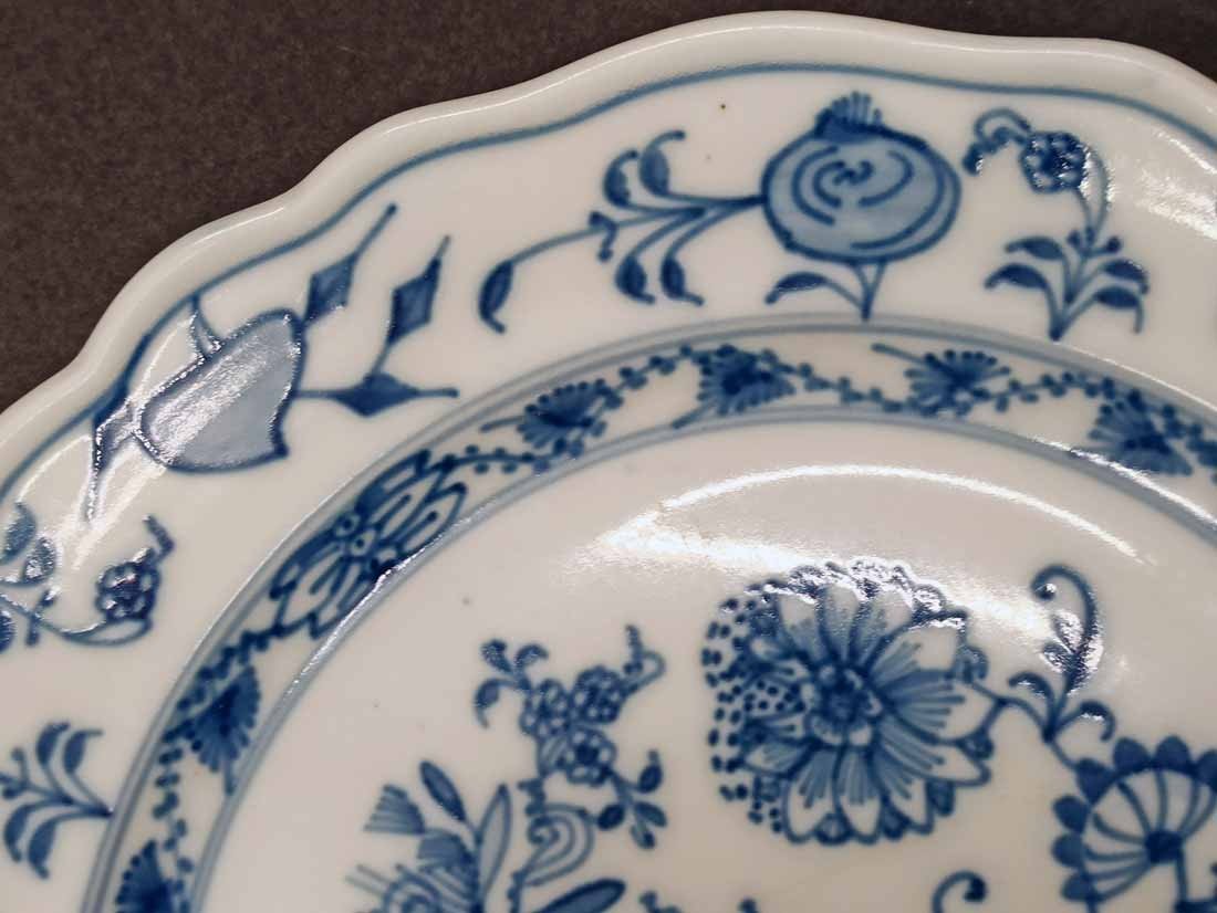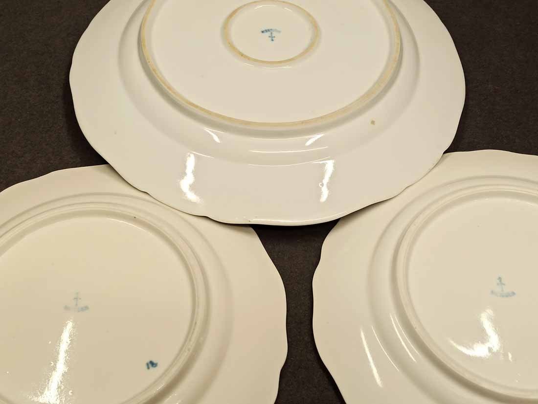 Drei Teller Zwiebelmuster, Manufaktur Teichert in Meissen um 1900. Versch. Größen. 2x Speiseteller D. 24,5- 25 cm; 1x großer Vorlegeteller D. 30 cm. Guter Zustand. Herstellungsbedingte und Teichert-typische Glasurunregelmäßigkeiten. Der große (30 cm) Teller mit Haarrissen vom Brand (Foto). Gemarkt mit der sogen "Ankermarke" : Pfeilkreuz mit gebogenem Schriftzug "Meissen" in Blau sowie der geprägte Stadtname "Meissen".