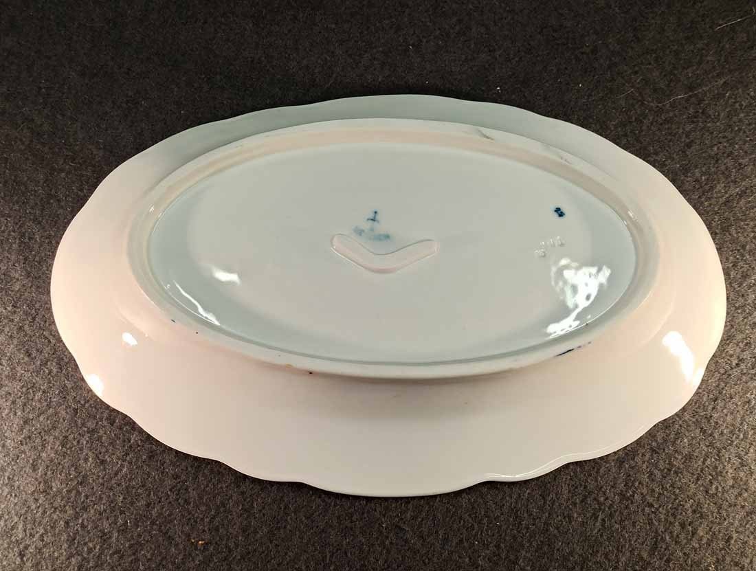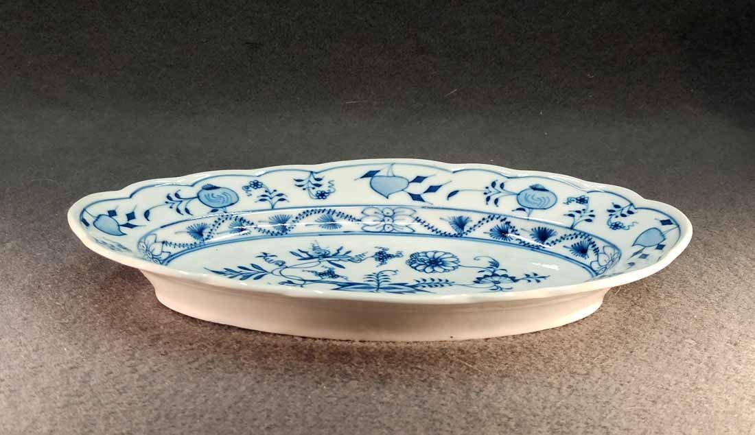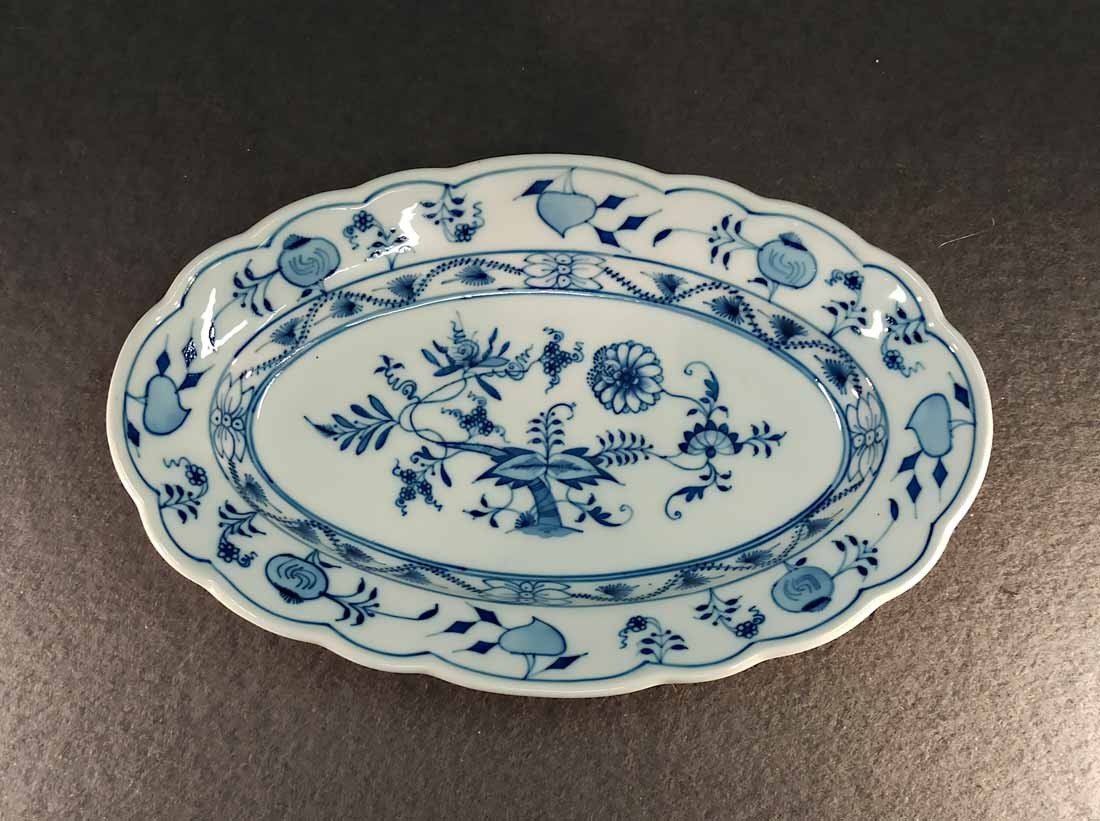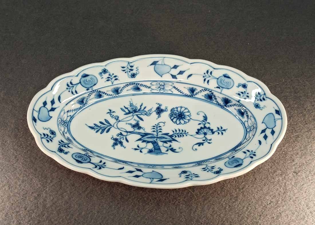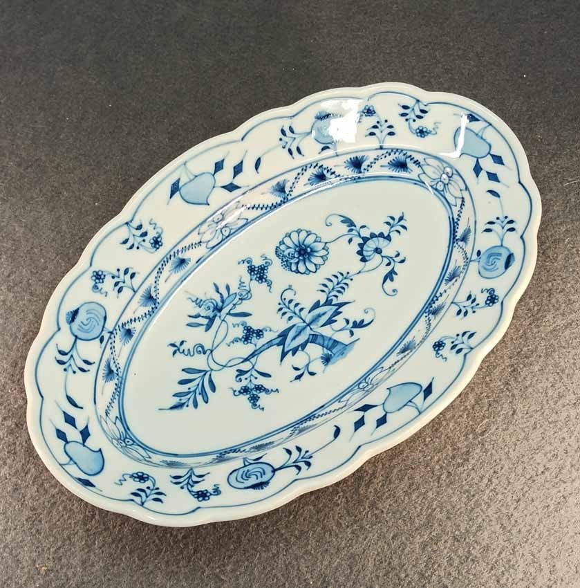 Kleine ovale Vorlegeplatte od. Schale, Zwiebelmuster, Manufaktur Teichert in Meissen um 1900. L. x B. 27 cm x 17,5 cm, H. 4 cm. Guter Zustand keine Beschädigungen.  Gemarkt mit der sogen "Ankermarke" : Pfeilkreuz mit gebogenem Schriftzug "Meissen" in Blau sowie der geprägte Stadtname "Meissen".