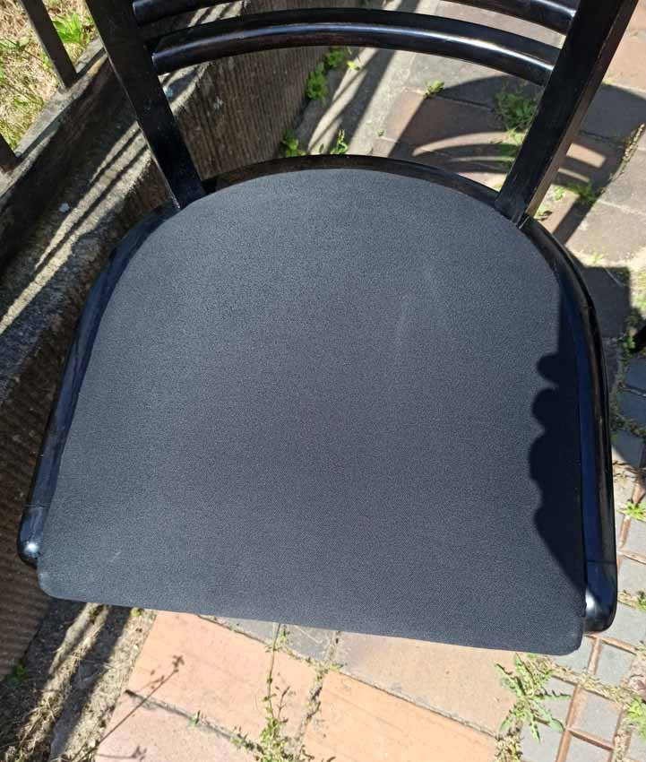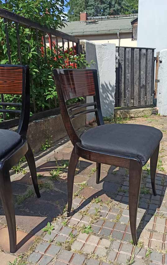 4x Stühle ca 1925, Art Deco, Frankreich. Schwarze Stühle die Rückenlehne Palisander furniert. VGuter Zustand, sofort nutzbar, die Polster i.O. und straff und sauber, normale Nutzungs- und Gebrauchsspuren. H. 49/80 cm, B. 47 cm