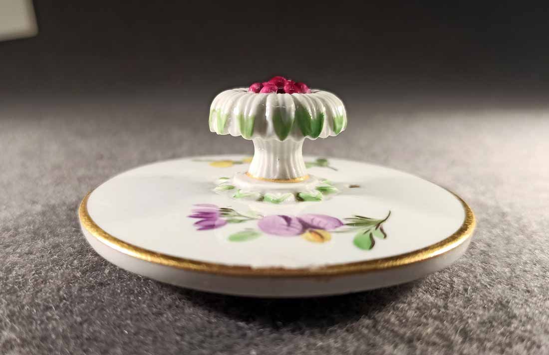 Meissen, Deckel mit Blumenmalerei, klassizistisch Ende 18. - Anfang 19.Jh. Alt reparierter Randchip. D. 7 cm, Innenring5,5 cm, H. ca 2,5 cm