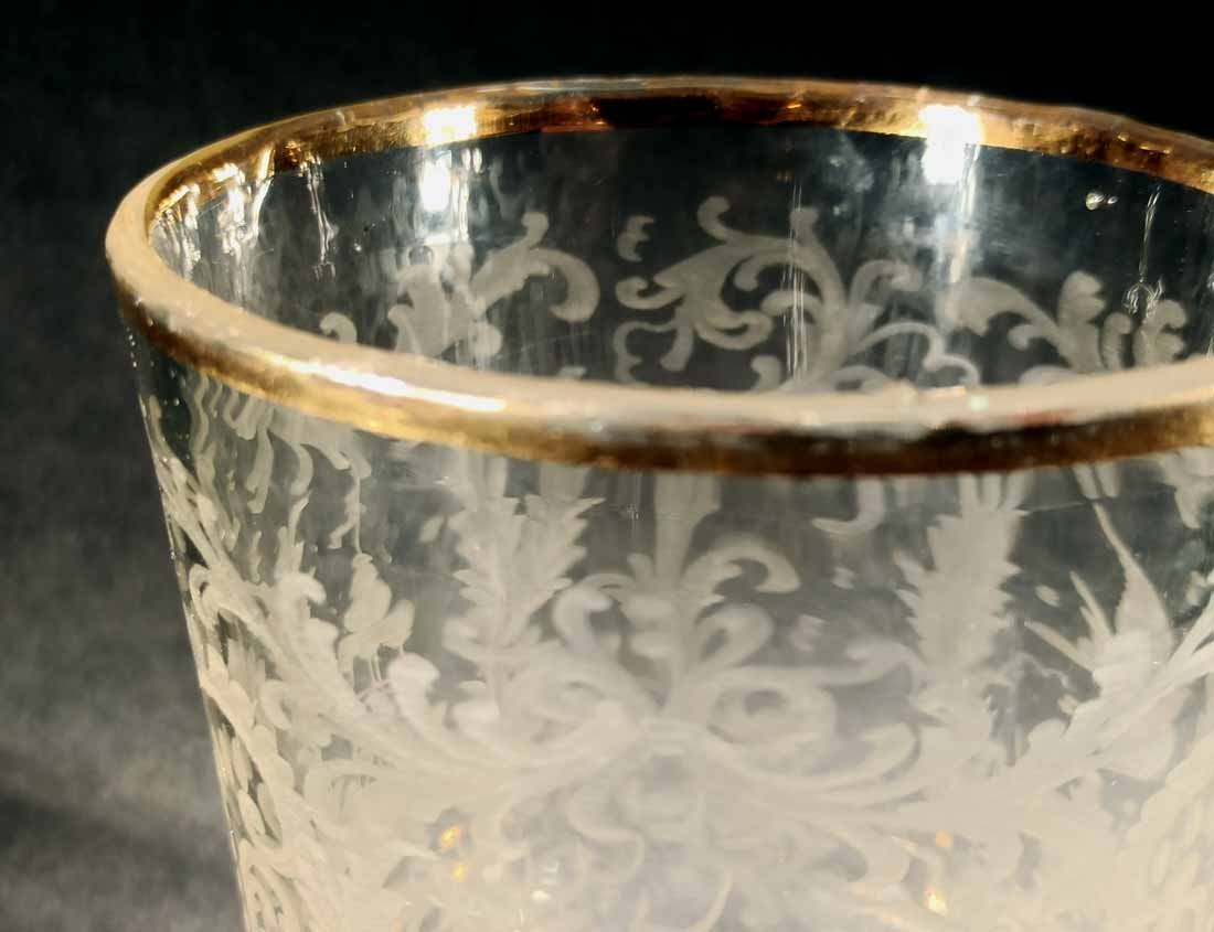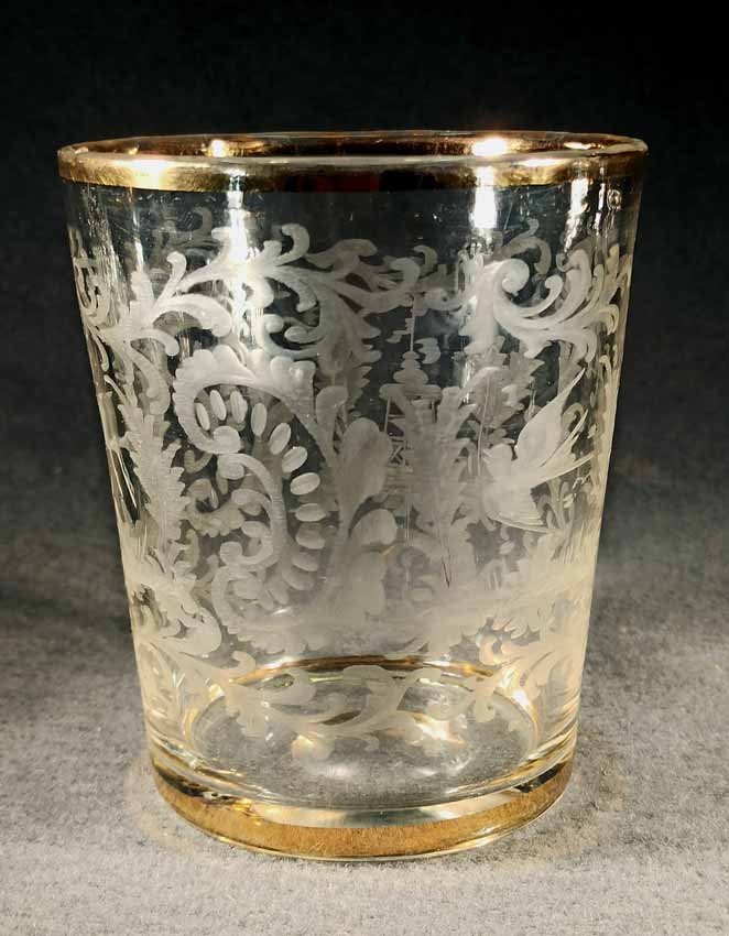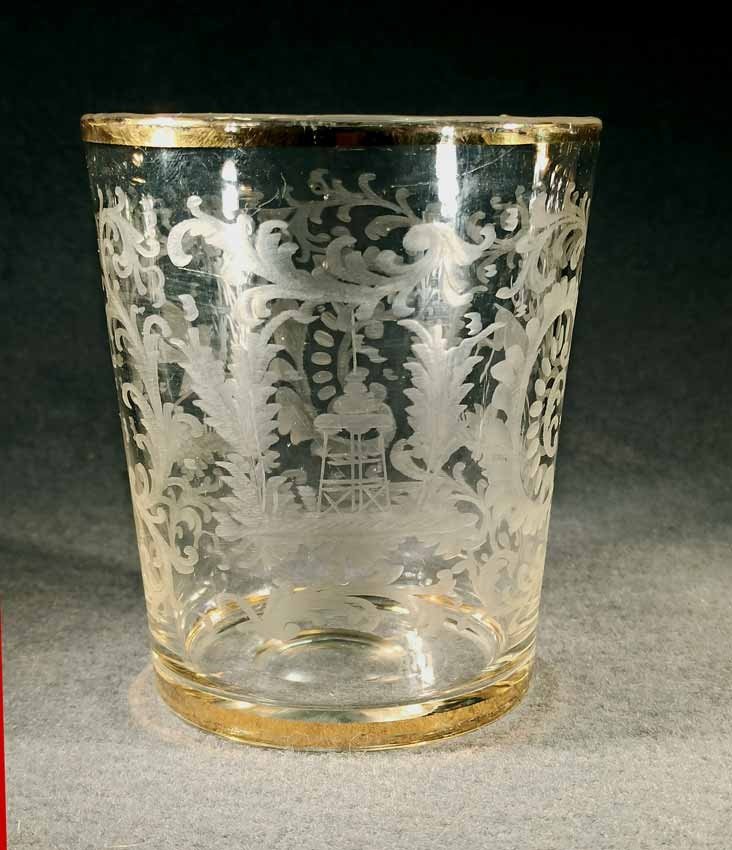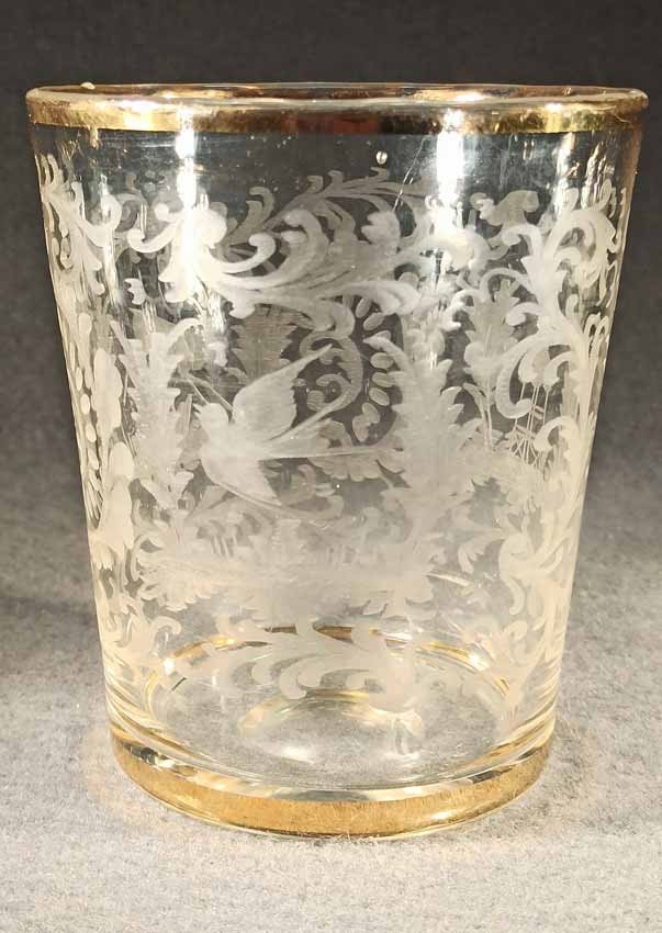 Barock Glasbecher 18.Jh. Schliffdekor: Hirsch, Vogel und Turm zwischen Ranken- und Rocaillemotiven. Rand und Fuß vergoldet, teilw. berieben. Abrissglas, Boden mit ausgekugeltem Abriss. 12 cm, D. 10,5 cm. Zustand ohne Beschädigung, partiell Goldabrieb.