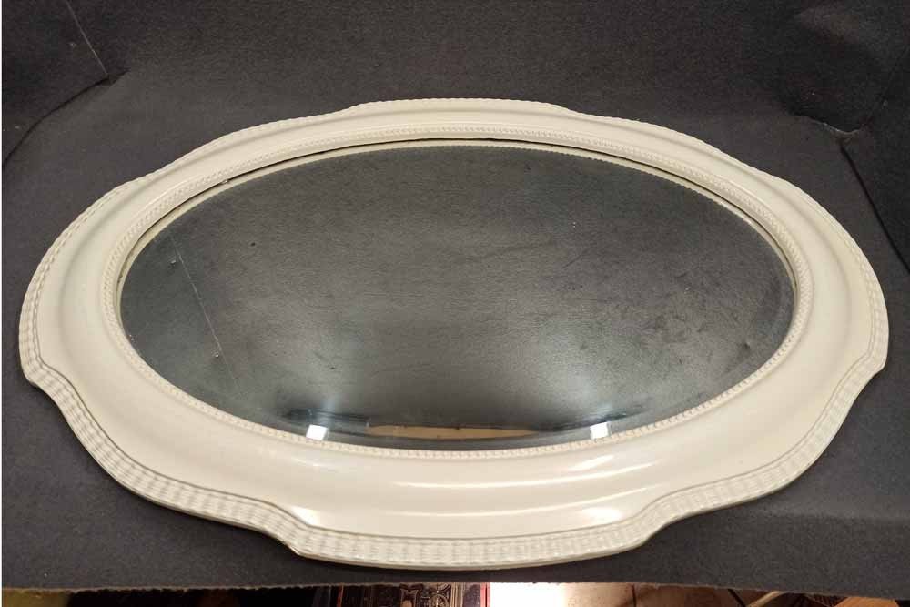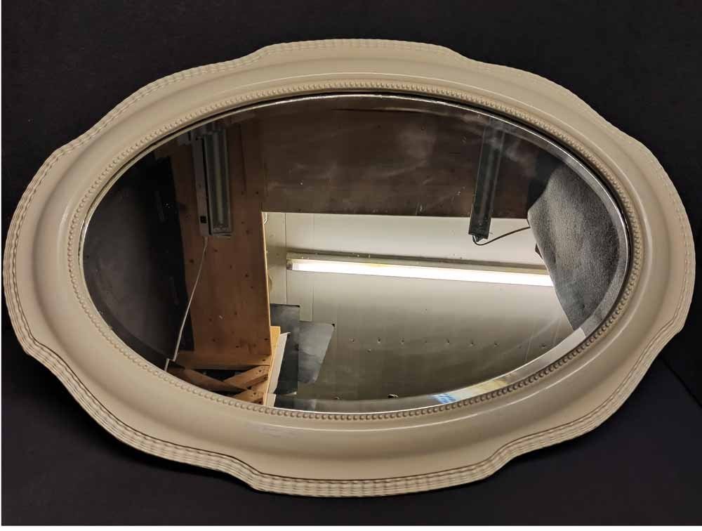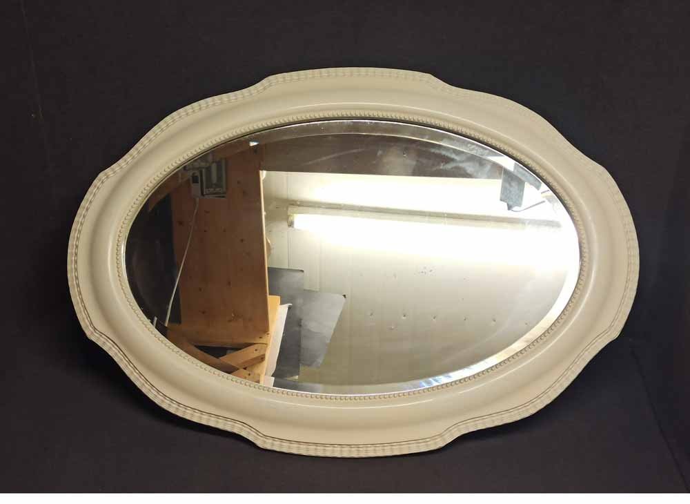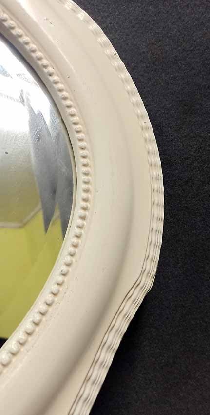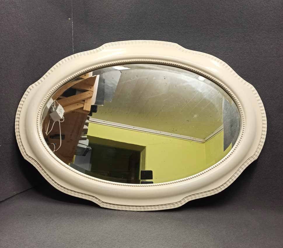 Spiegel um 1910. Mehrfach geschwungen mit original Spiegelglas, dieses facettiert. Holzrahmen mit Flammleiste. Weißer Schleiflack mit geringen Gebrauchsspuren, Shabby Chic. B. x H. 82 cm x 57 cm, Rahmen 7,5 cm.