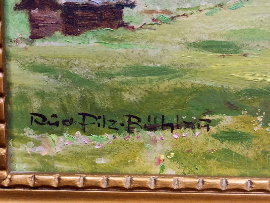 Pilz - Bühlau, Rudolph. "Alpenlandschaft mit Kapelle", Öl auf Malpappe, gerahmt. Links unten signiert "Rud. Pilz-Bühlau". B. 48/61 cm, H. 38/51 cm