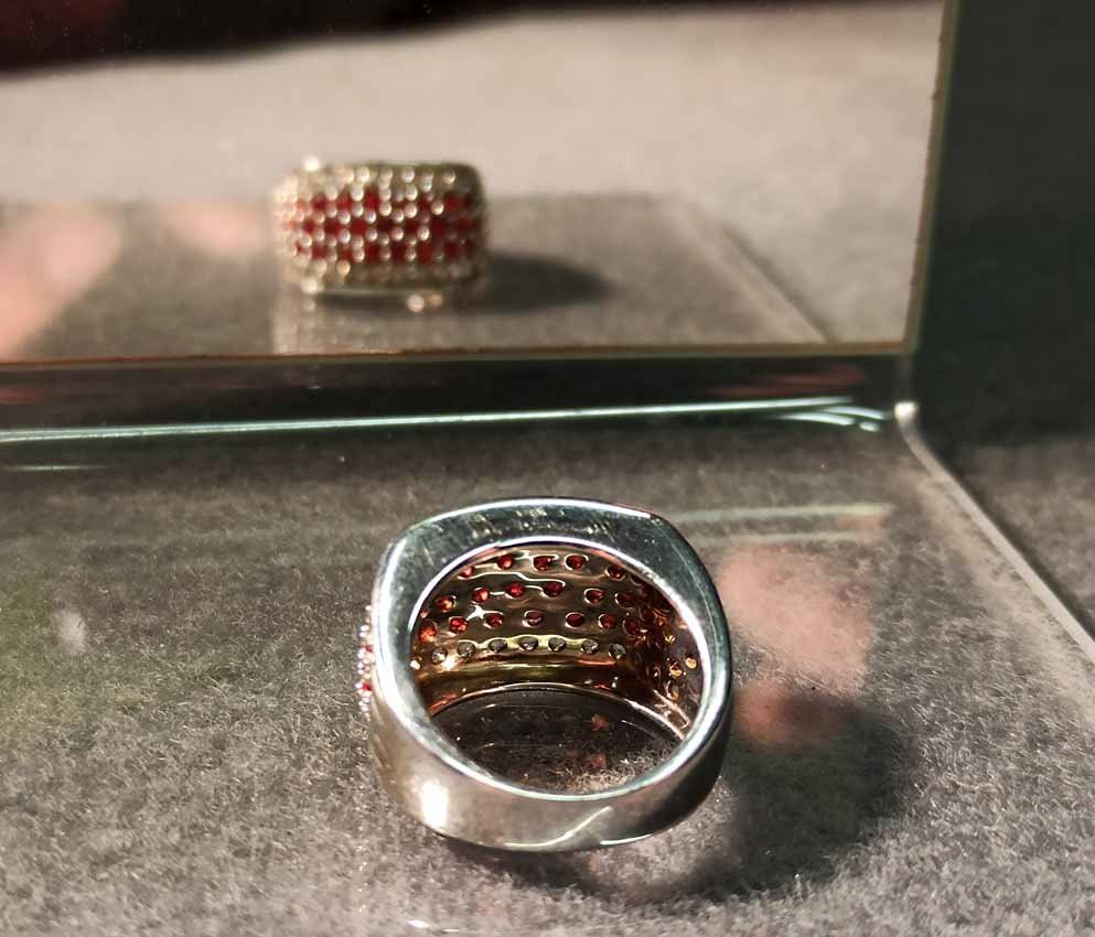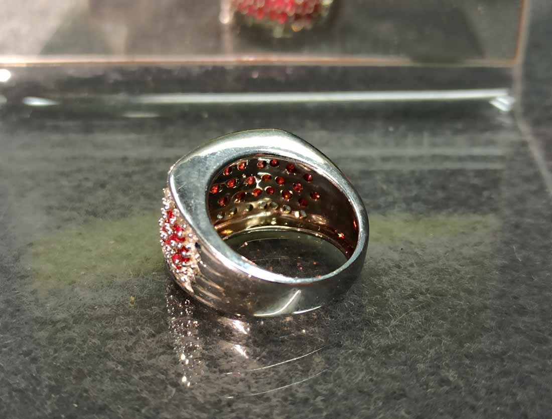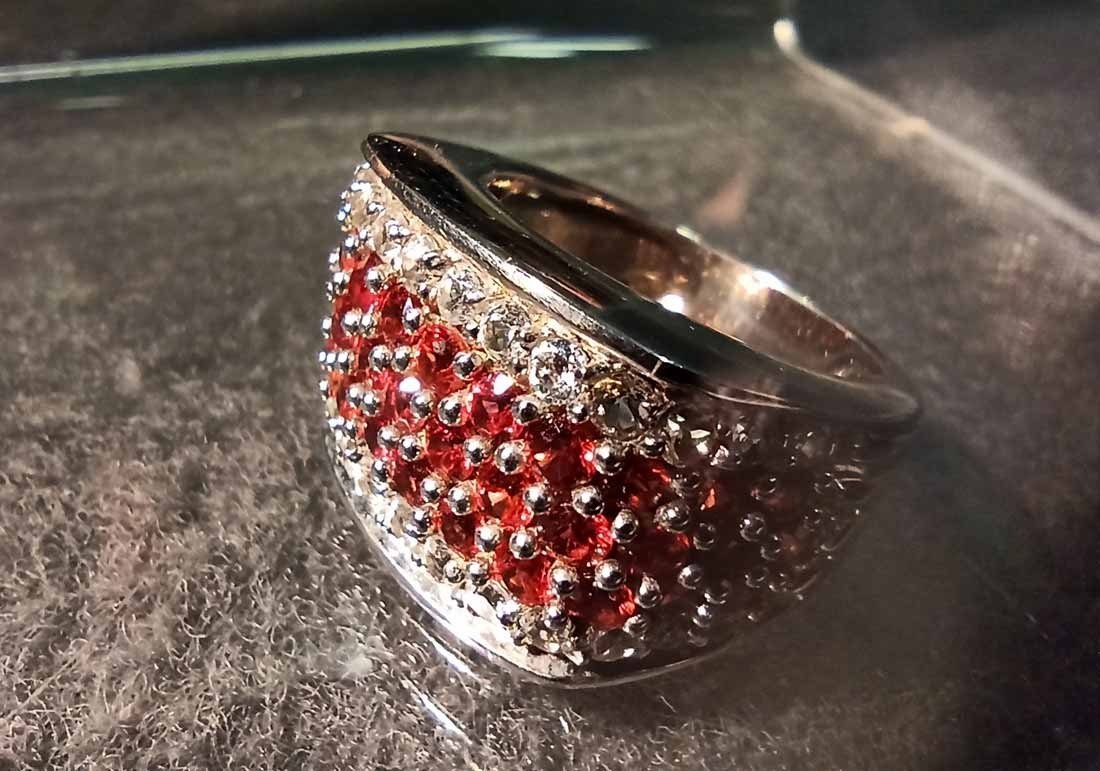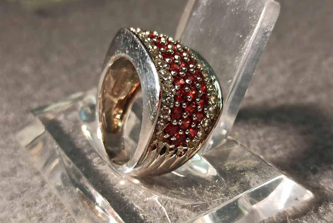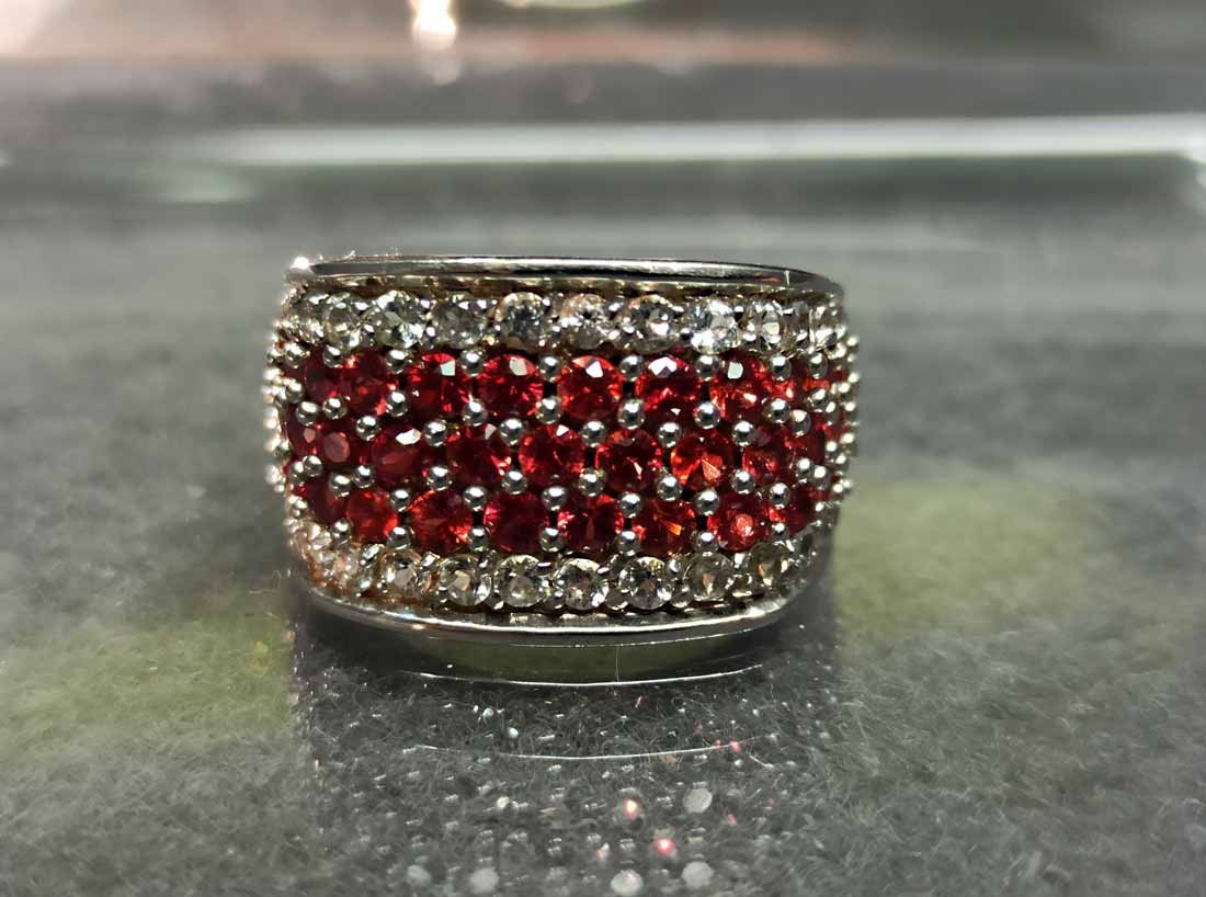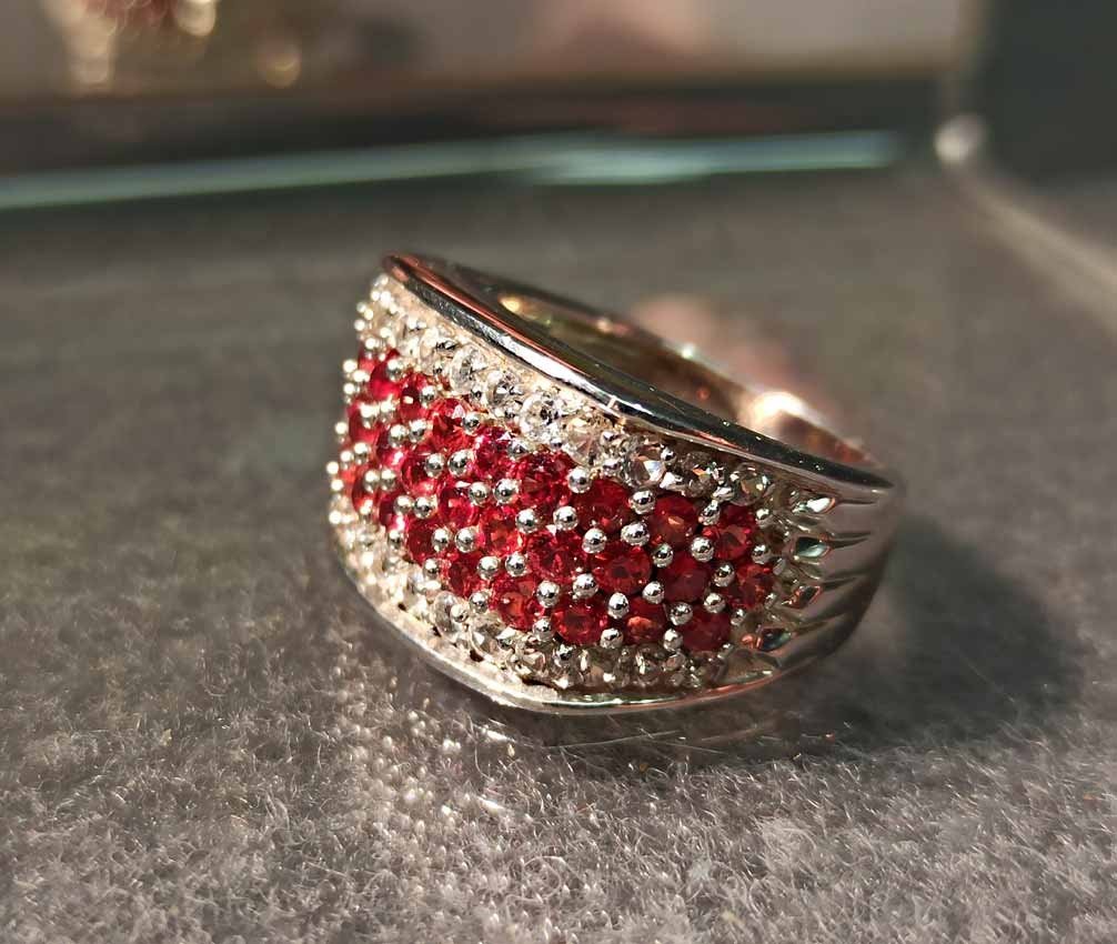 Silberring mit 34 Abendroten Saphiren umrahmt von 28 Weißtopasen. 925 er Silber. Rg. D. ca 18 mm.