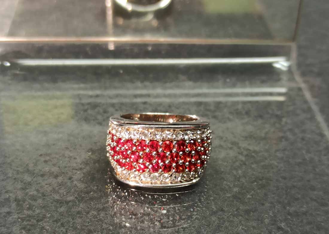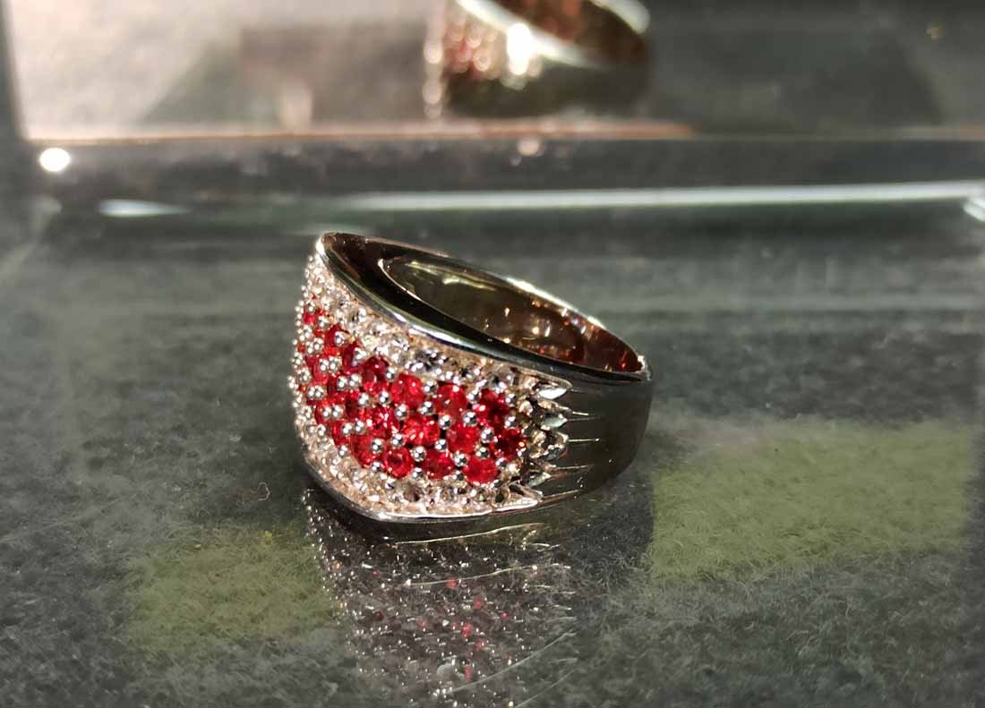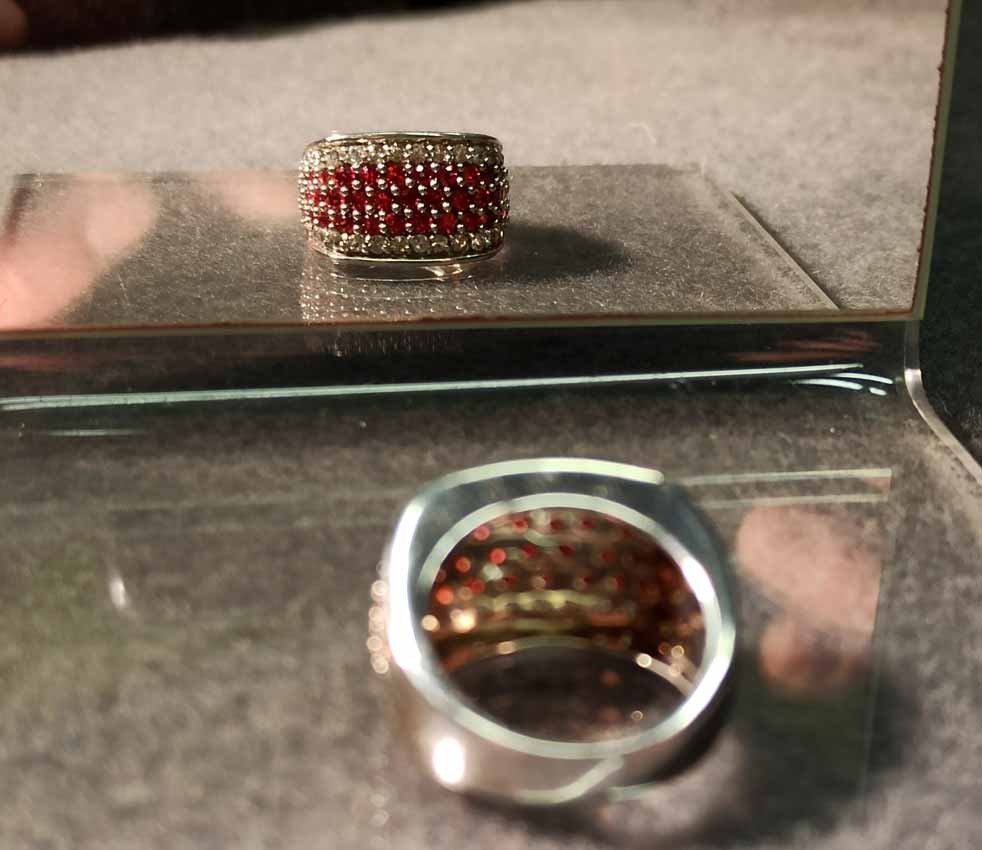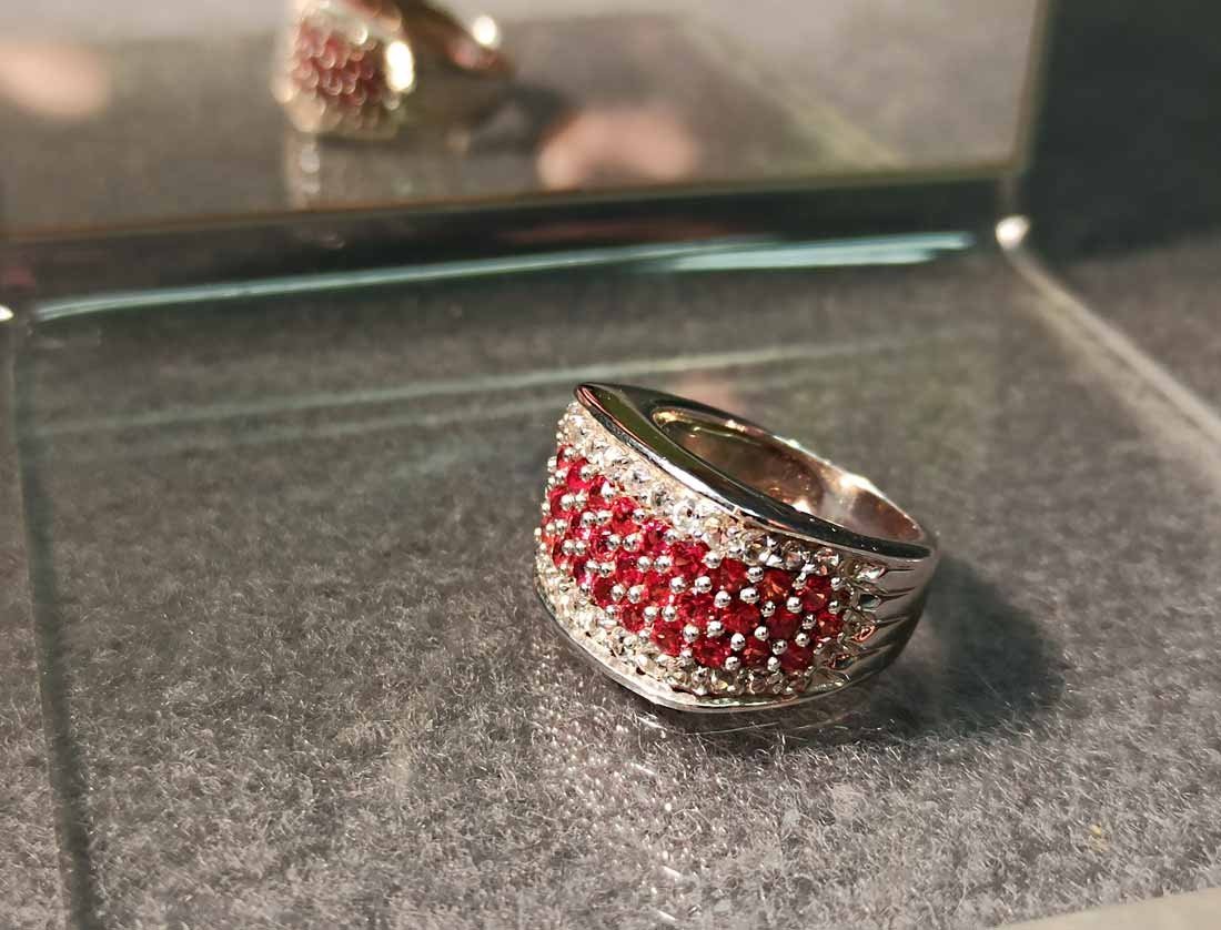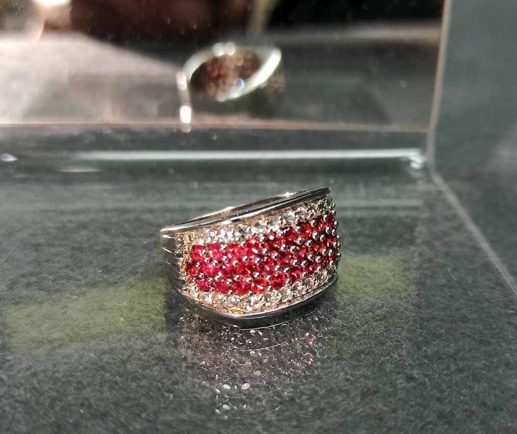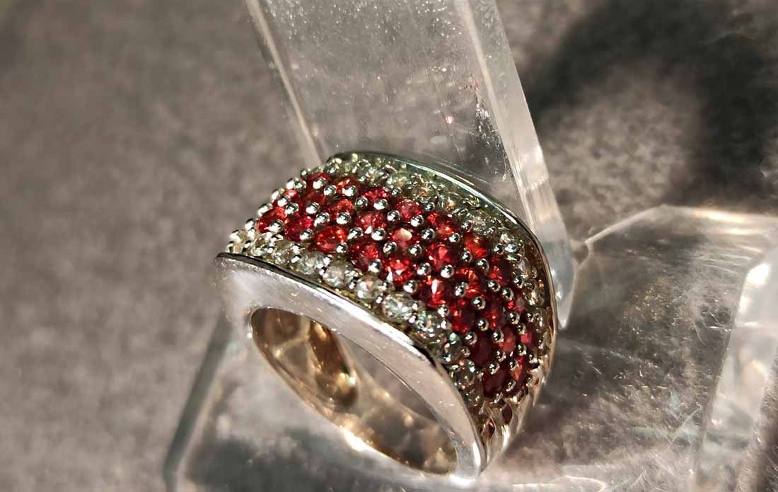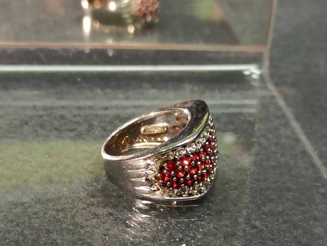 Silberring mit 34 Abendroten Saphiren umrahmt von 28 Weißtopasen. 925 er Silber. Rg. D. ca 18 mm.
