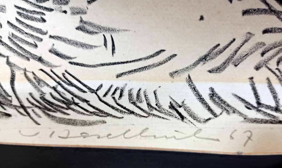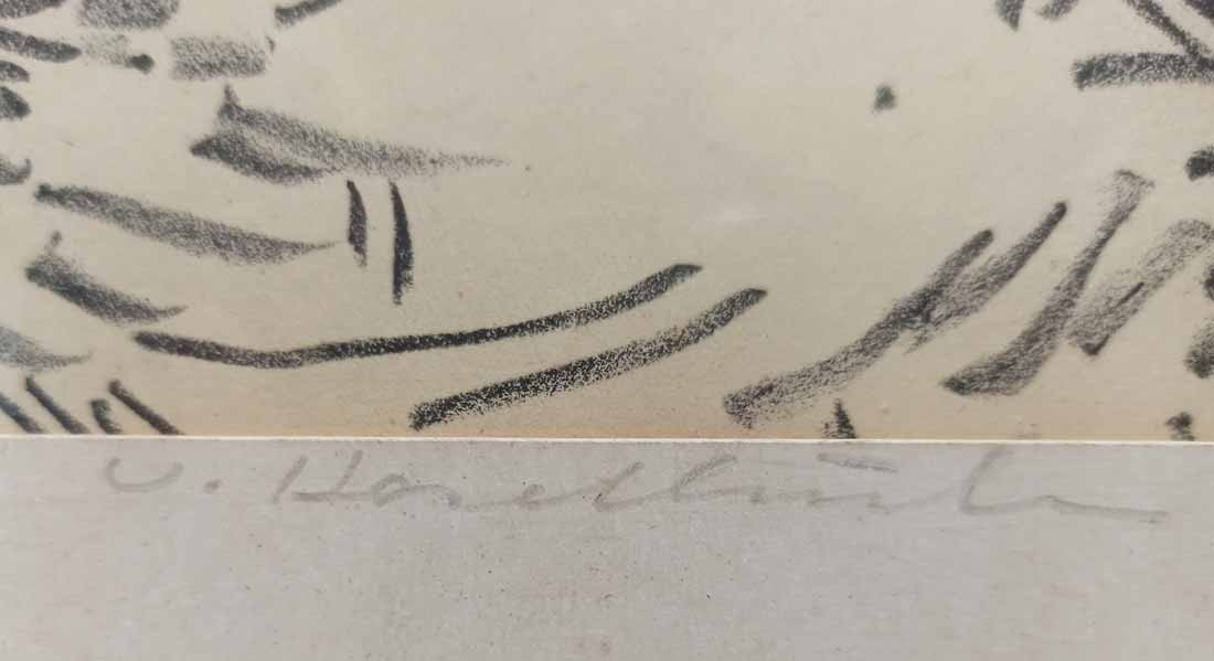 Werner Haselhuhn, "Feldweg" . Lithografie, Li. u. bezeichnet und re.u. Signiert "W. Haselhuhn"  und datiert "67". Auf dem Passepartout ebenfalls signiert. Bild ca 52 x 38 cm, Rahmen 73 x 53 cm. Im zeittypischen Rahmen.