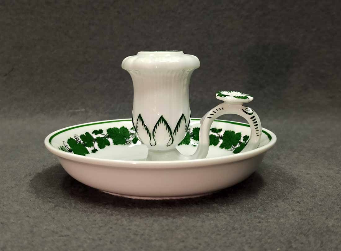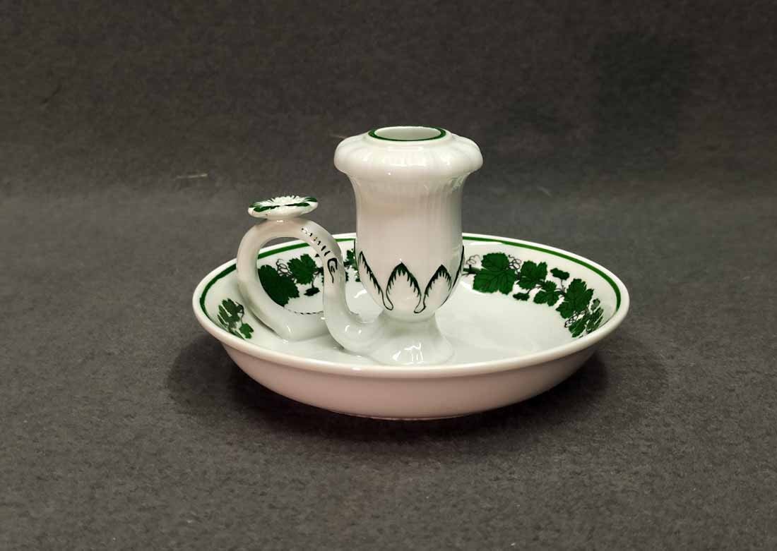 Meissen, Weinlaub, Kerzenleuchter. Kerzenleuchter mit Schale und Handhabe naturalistisch als Ast gearbeitet. H. ca 7 cm, D. ca 13 cm. Schwertermarke der M Manufaktur Meissen 4x gestrichen.