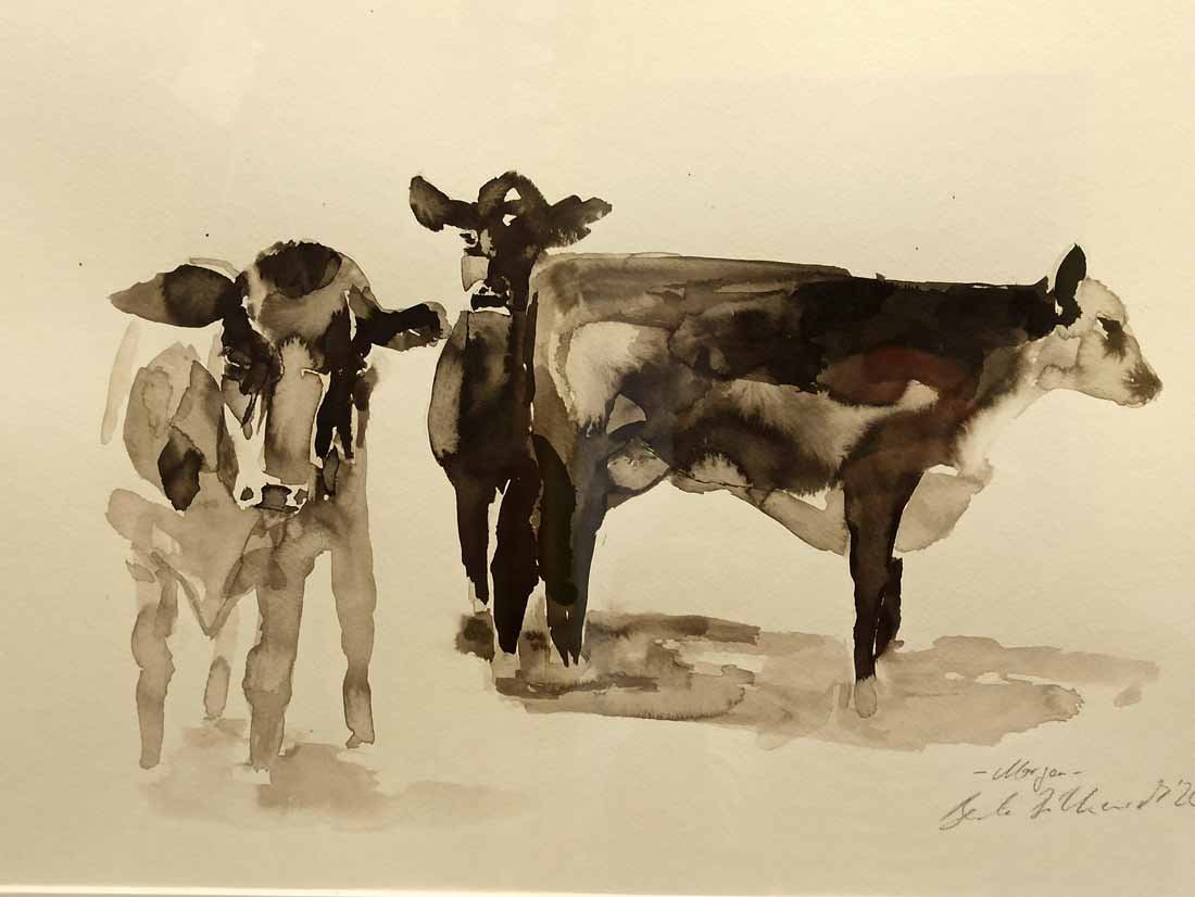 Beate Bilkenroth, "Morgens" - Drei Kühe 2022, Tuschezeichnung. Re.u. bez.: "Morgen" und sig.: "Bilkenrroth 22". Gerahmt im Passepartout. H.xB. 29/55 cm x 44/75 cm