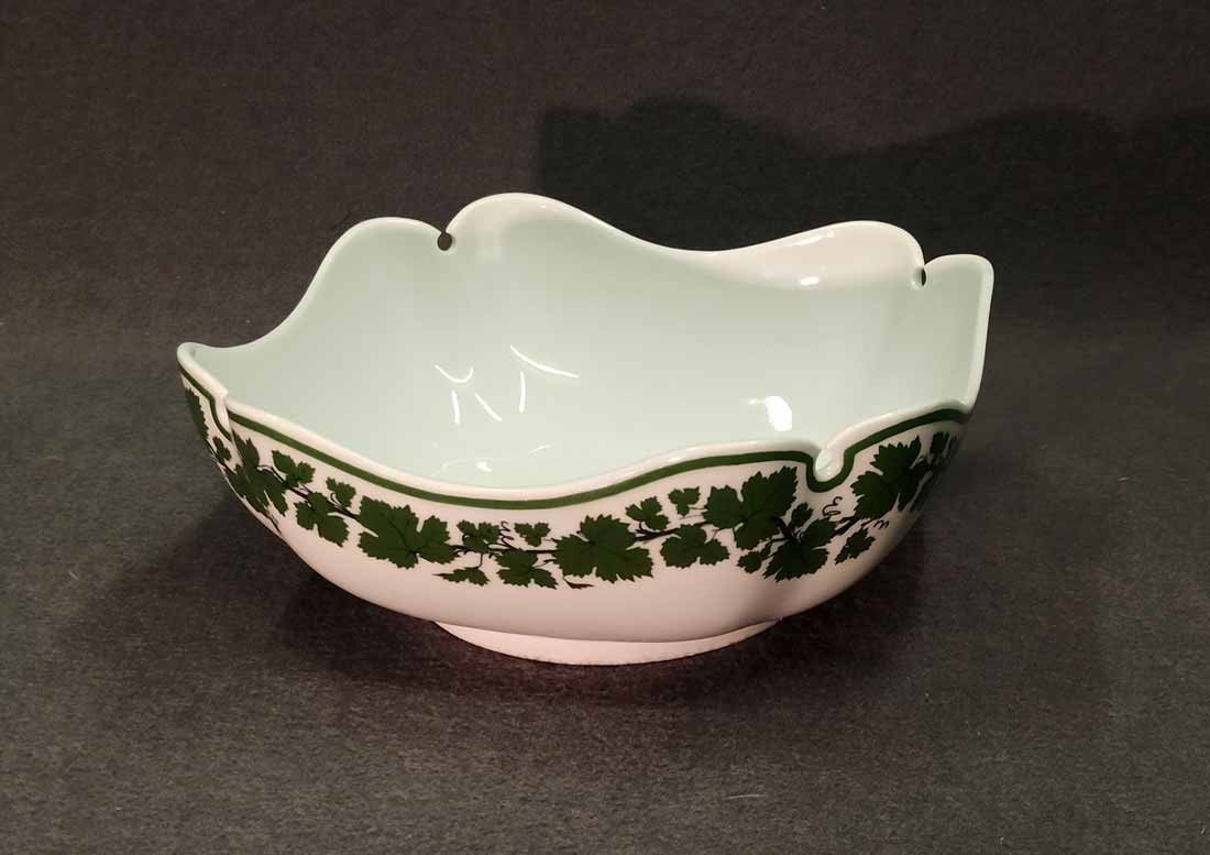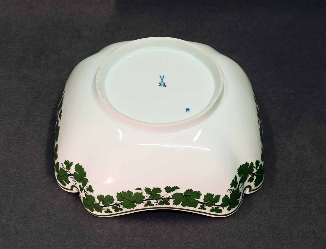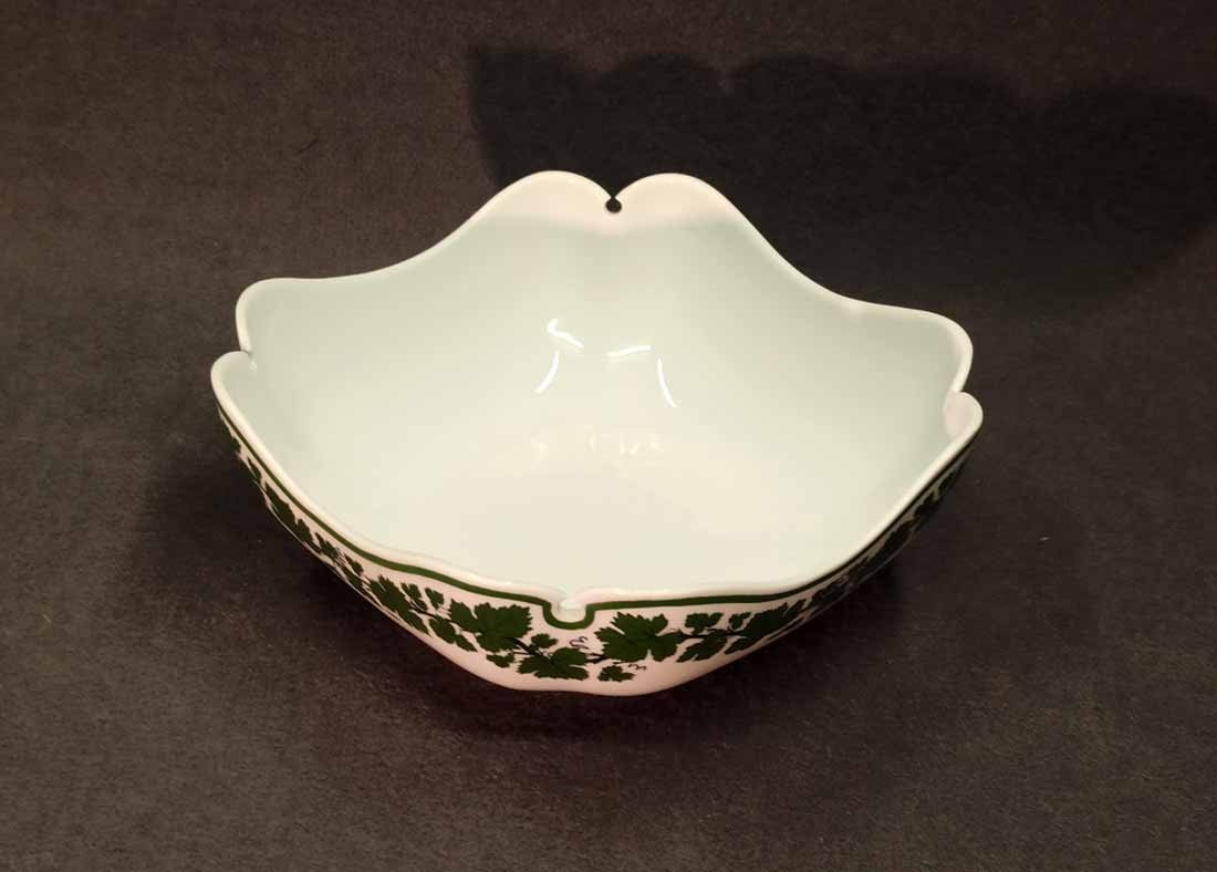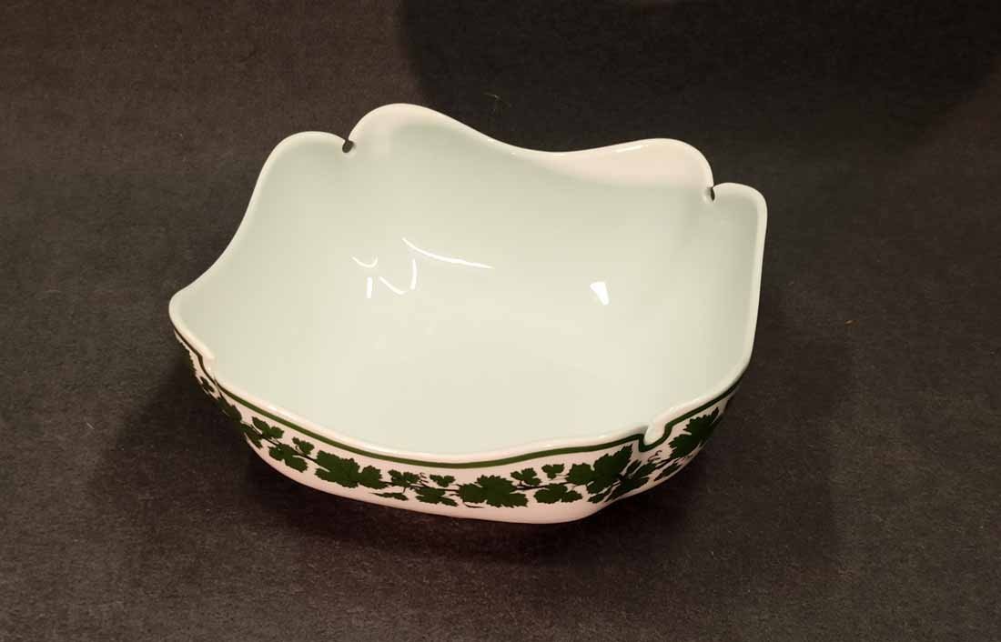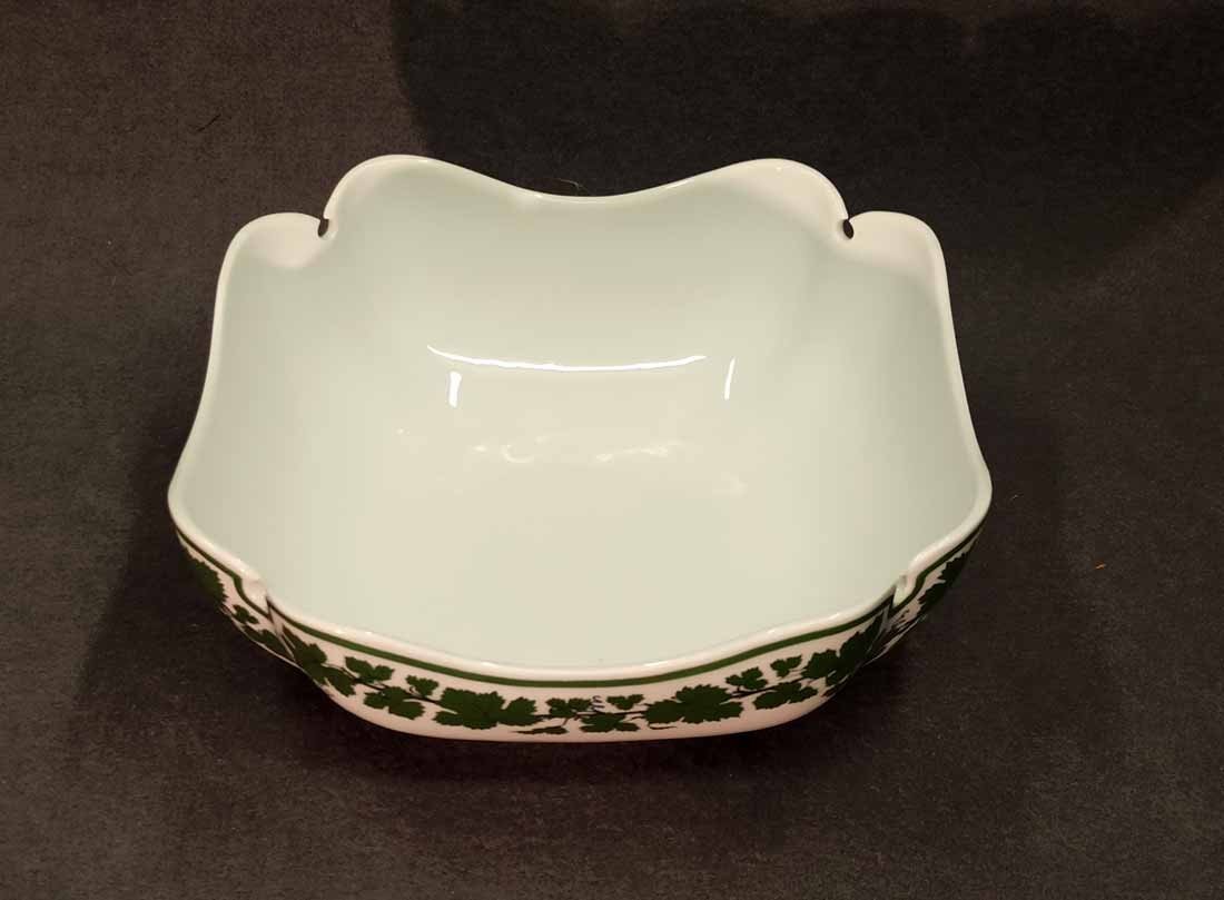 Meissen, große Schüssel, Weinlaub. Quadratische Grundform mit geschwungenem Rand. Zustand ohne Beschädigungen, keine Gebrauchsspuren, 1. Wahl, Schwertermarke ohne Schleifstriche. L.x B. 23,5 cm, H. 9,5 cm.