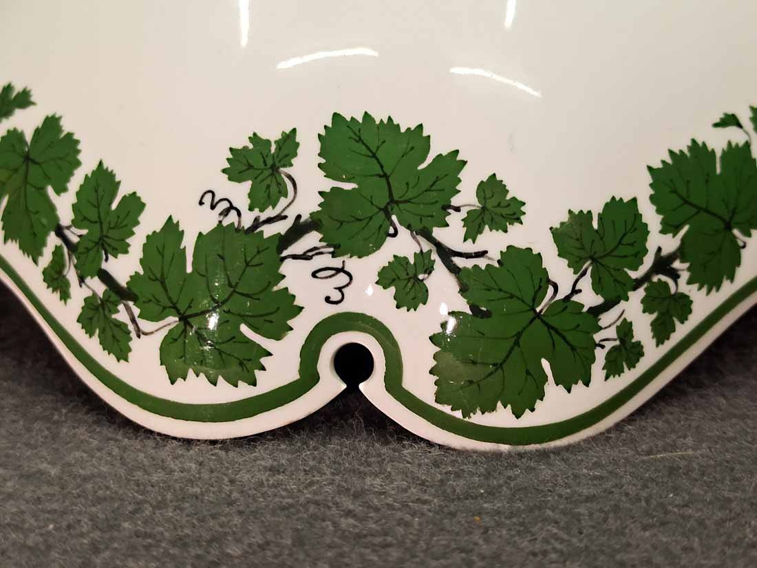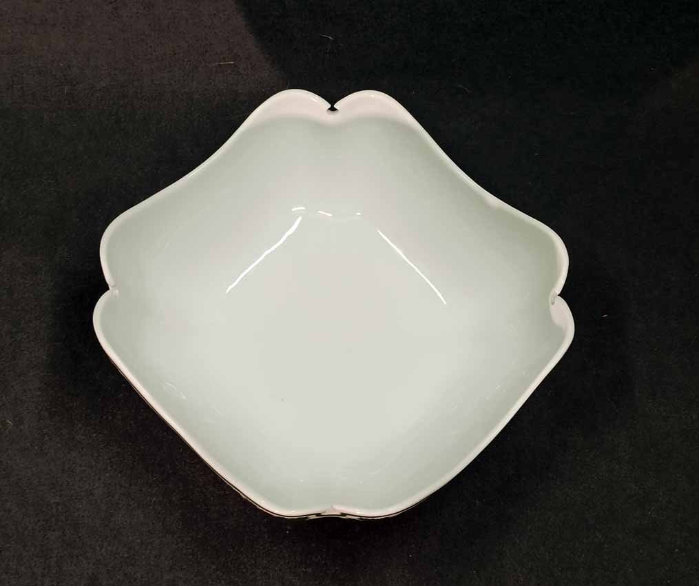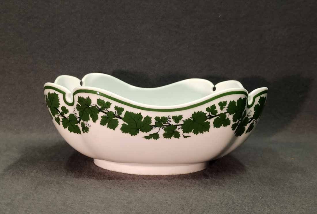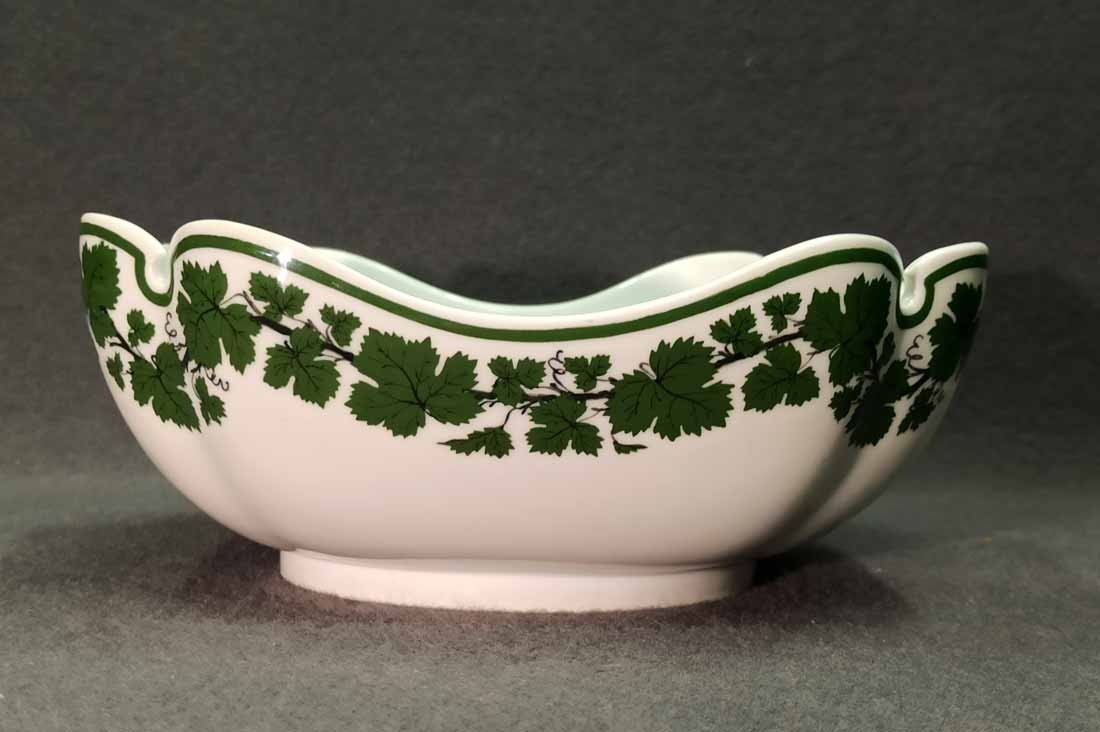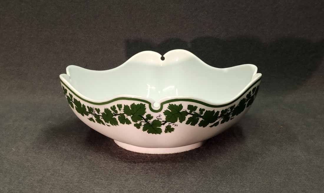 Meissen, große Schüssel, Weinlaub. Quadratische Grundform mit geschwungenem Rand. Zustand ohne Beschädigungen, keine Gebrauchsspuren, 1. Wahl, Schwertermarke ohne Schleifstriche. L.x B. 23,5 cm, H. 9,5 cm.