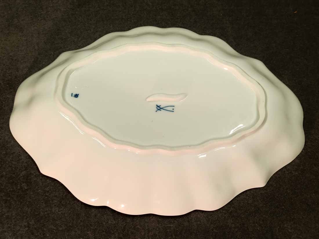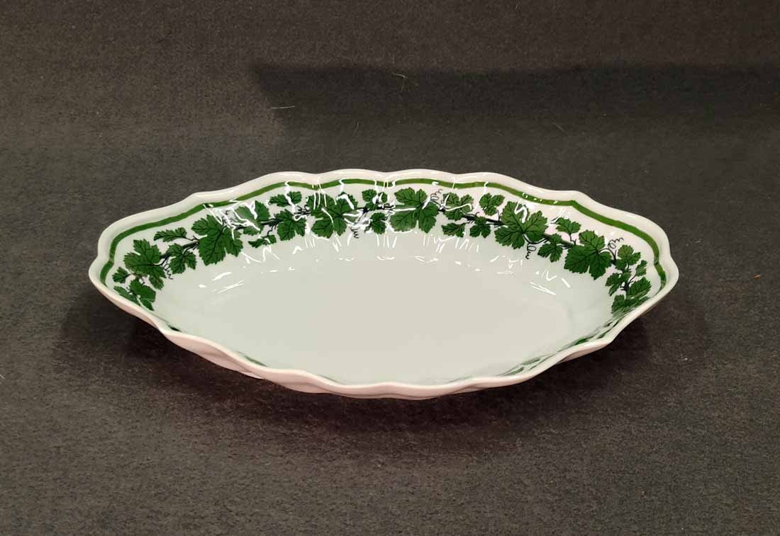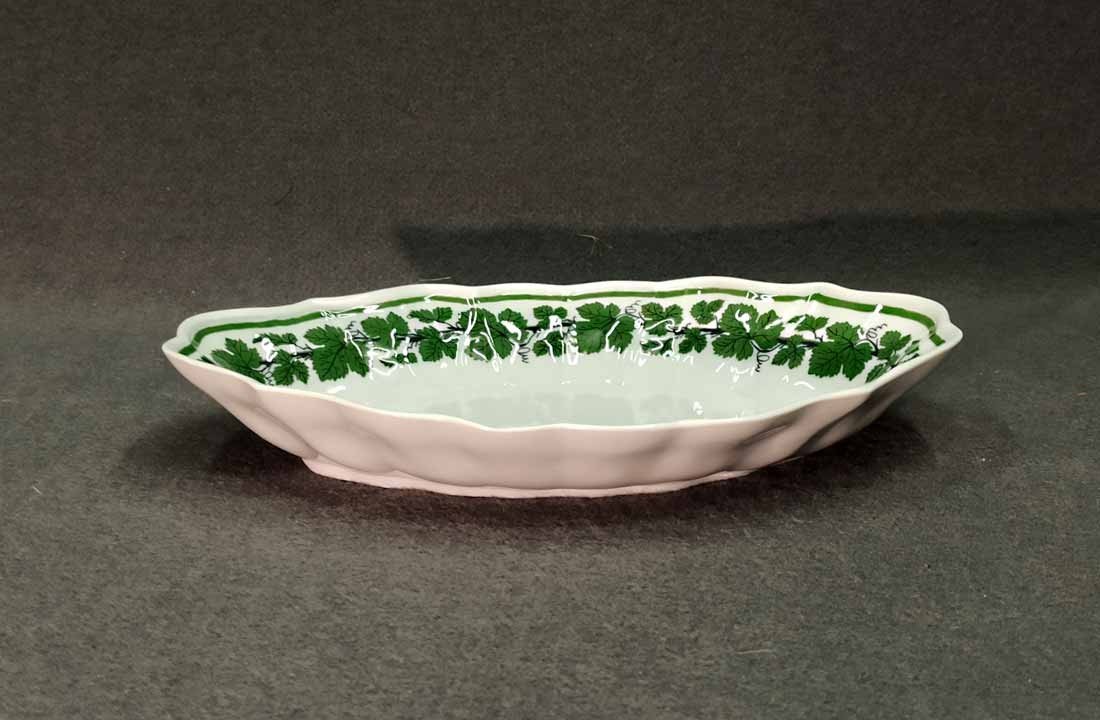 Meissen, Weinlaub. Schale, spitzovale Form die Fahne ausgeprägt geschwungen. Sehr guter Zustand ohne Beschädigungen. 1. Wahl, Schwertermarke der Manufaktur Meissen ohen Schleifstriche. L. x B. 26,5 cm x 19 cm.